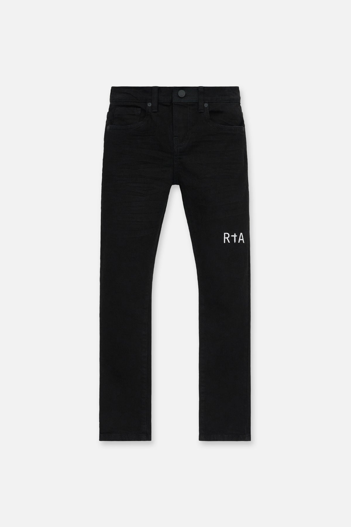The Anderson Skinny Jean in Black is made from premium denim. Designed with a skinny fit, these jeans feature the RTA logo embroidered on the leg, the iconic RTA cross on the back pocket, and signature leather patch on the back waistband.