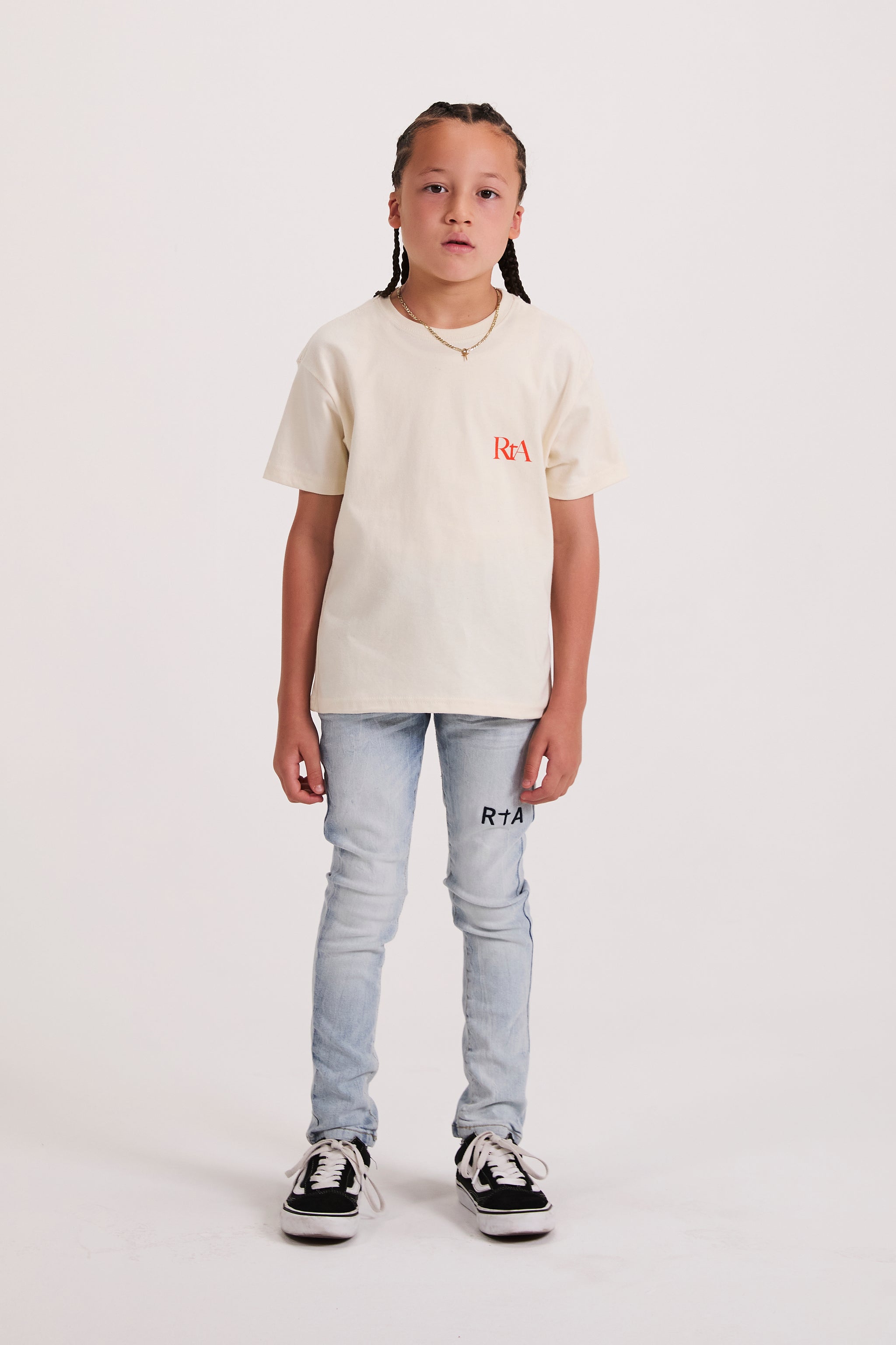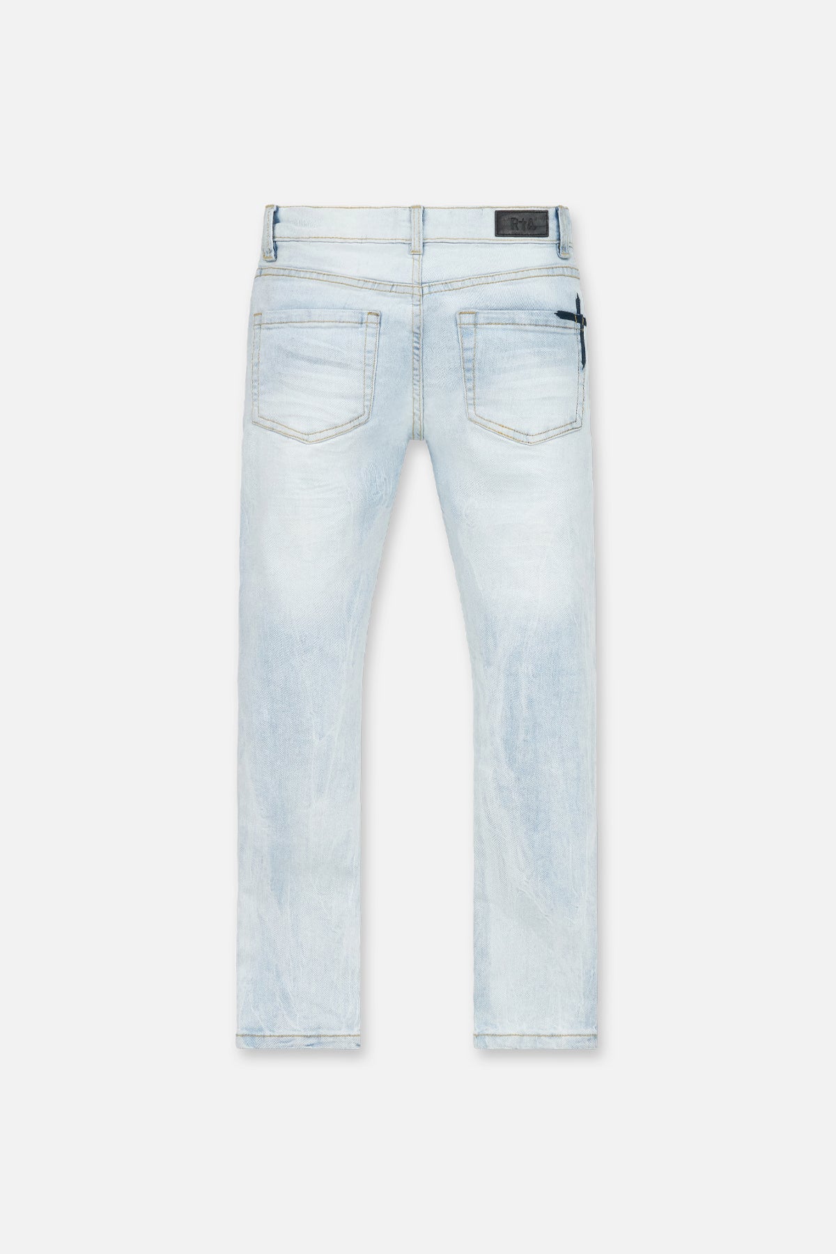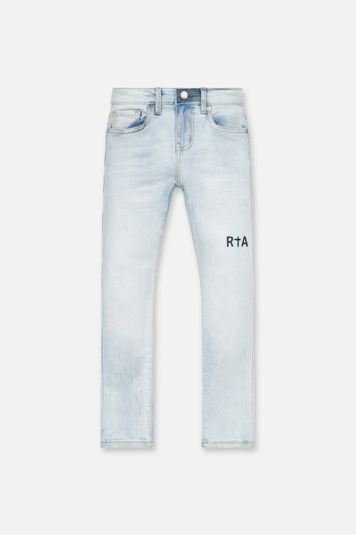 The Anderson Skinny Jean in Stormy Sky is made from premium denim. Designed with a skinny fit, these jeans feature the RTA logo embroidered on the leg, the iconic RTA cross on the back pocket, and signature leather patch on the back waistband.