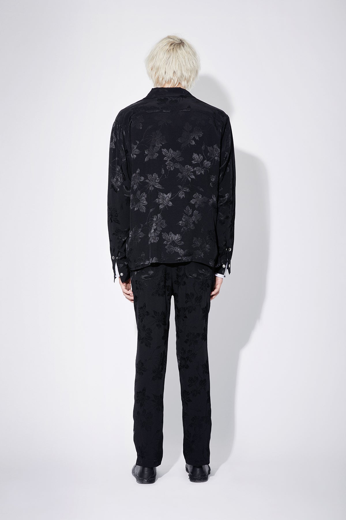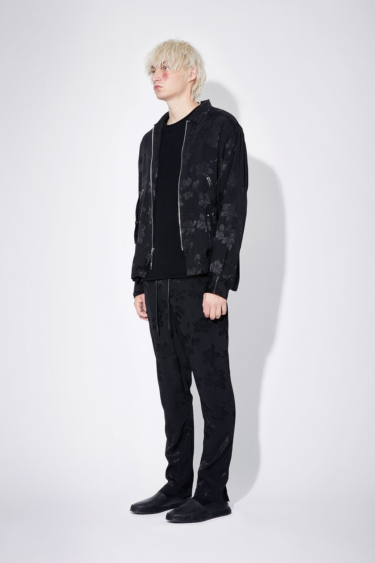 The RTA Bento Pant in black flowers are a relaxed, silky feel bottom with an elasticized waistband and coated drawstrings with a logo-engraved toggle. They showcase a floral jacquard pattern inspired by pajama trousers.