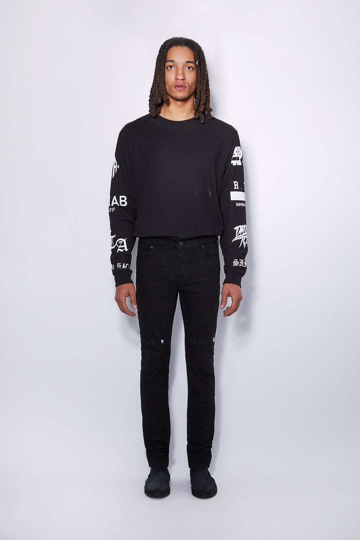 The RTA Clayton Jean in Black Pause Play is a denim jean in our classic 134 fit, a skinny 5 pocket silhouette with cross seamed back legs. Featuring contrasting and tonal embroidery in "Pause Play" motif with symbols along the back waist and RTA logo under the back pocket. Made from premium Japanese denim and finished in the USA.