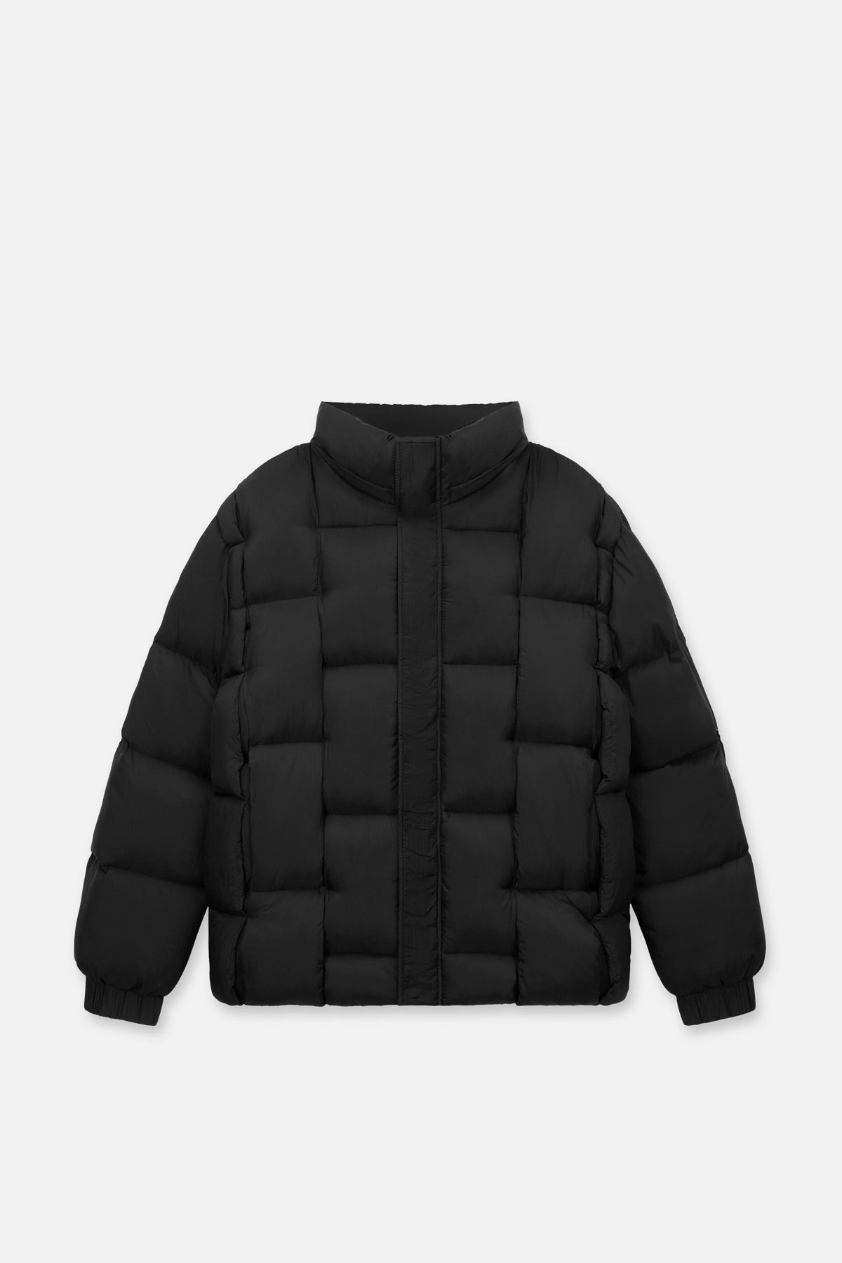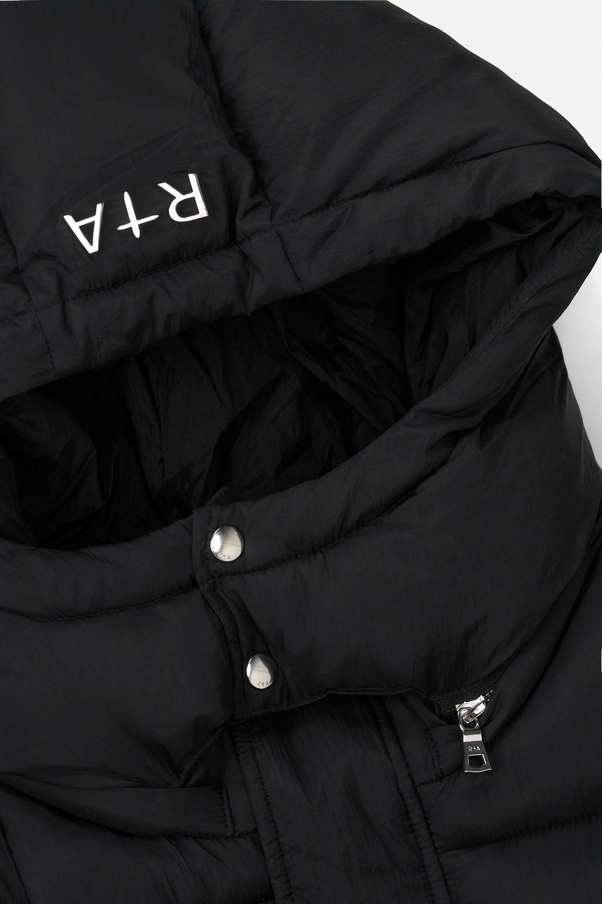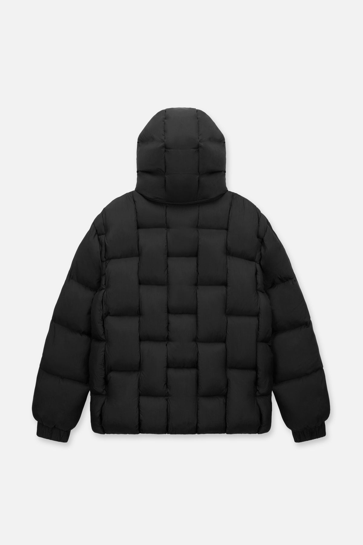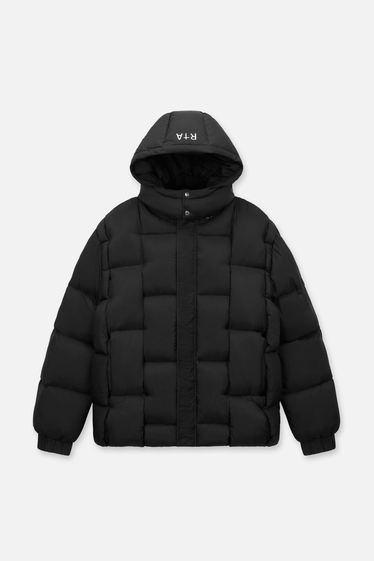 The Brady Jacket in Black Weaving is a classic puffer jacket with a removable hood, stand collar elasticized cuffs, a dual hidden closure featuring button snaps and front zipper, weaved design, and embroidered RTA logo on the hood.