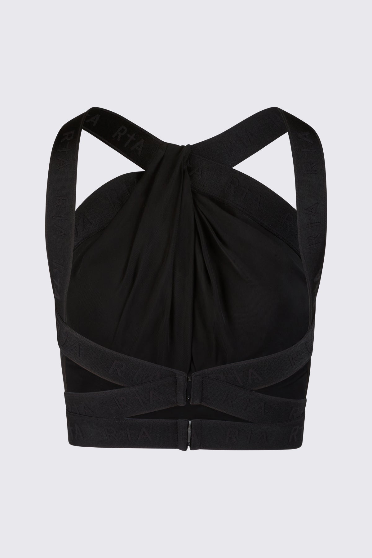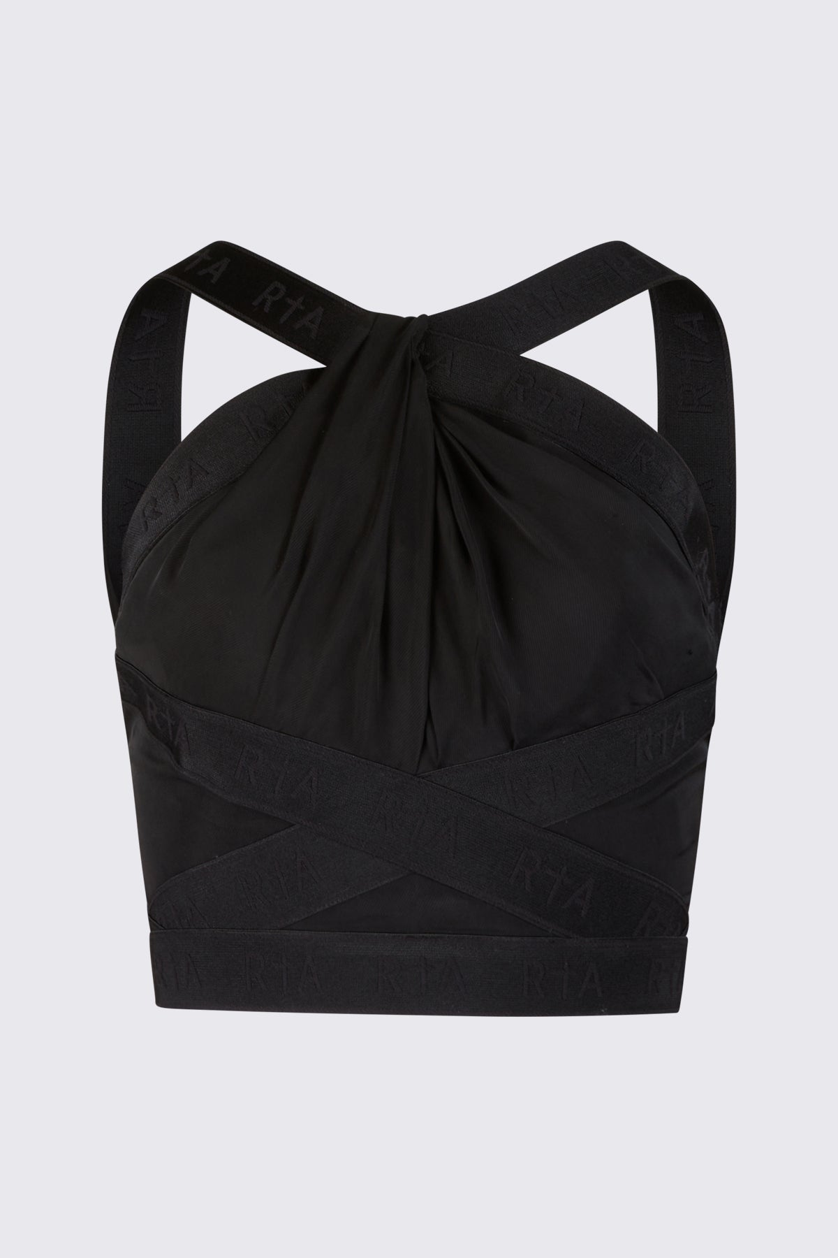 The Bruna Top in Black is a cropped, strappy open back top. This standout piece features premium Italian fabric and RTA logo elastic straps.