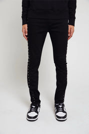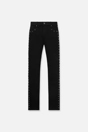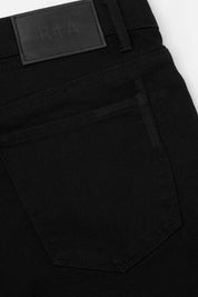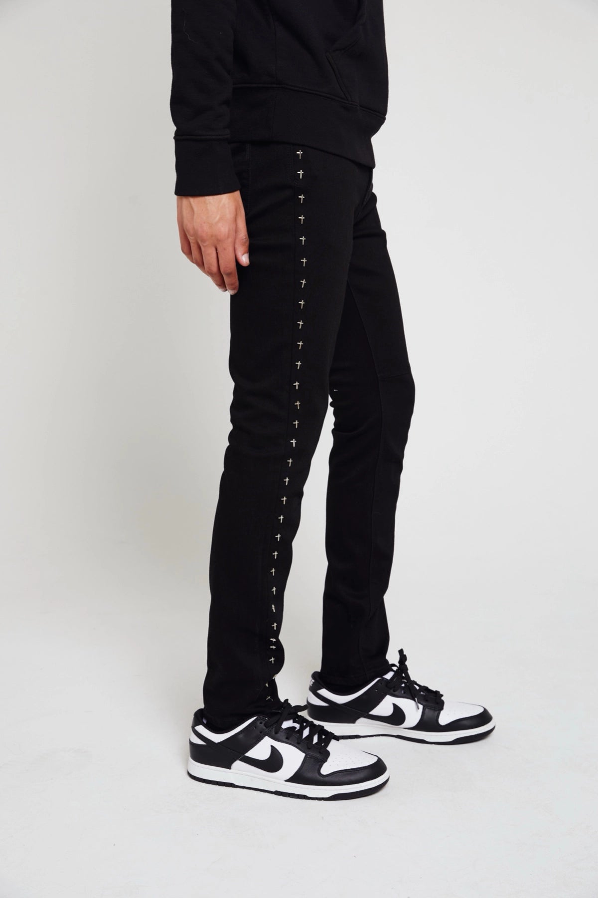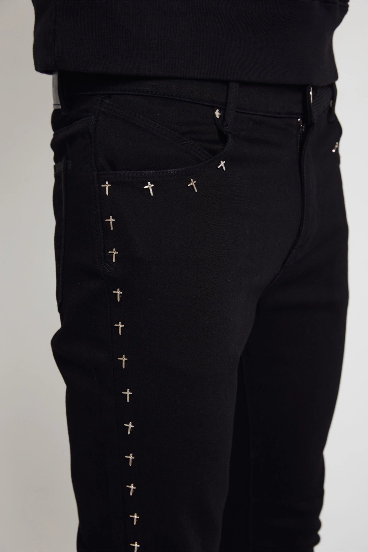 The RTA Bryant jean is a classic skinny fit in black premium Japanese denim with embroidered cross detailing along the seams. This denim style has some stretch, it will be tighter when you first try on and will relax as you wear them in.
