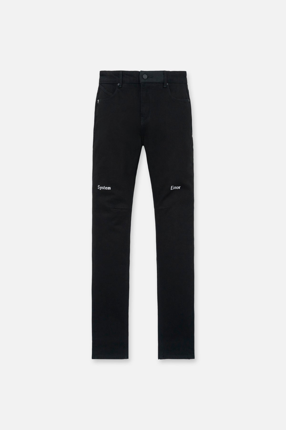 The Bryant Skinny Jean in Black Hologram Digital Cross is made from premium denim. Designed with a skinny fit and reinforced stitching on the inner thighs, these jeans feature the words "SYSTEM ERROR" in a digital style font above the knees, digitized RtA crosses down the back legs, the iconic RtA cross on the back pocket, and signature leather patch on the back waistband.