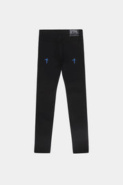 The Bryant Skinny Jean in Black Blue R.I.P. is made from premium denim with Rest In Peace detailing on the front and signature RTA crosses on back pockets in blue.