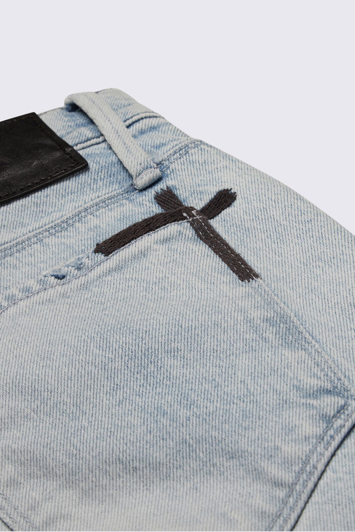 The RTA Bryant Jean is our classic skinny fit in Light Blue Sinners which has a faded wash. Featuring embroidered white "Sinners" in Old English font on the front pockets, black leather patch on back, signature back pocket cross and embroidered white daggers along the back legs.