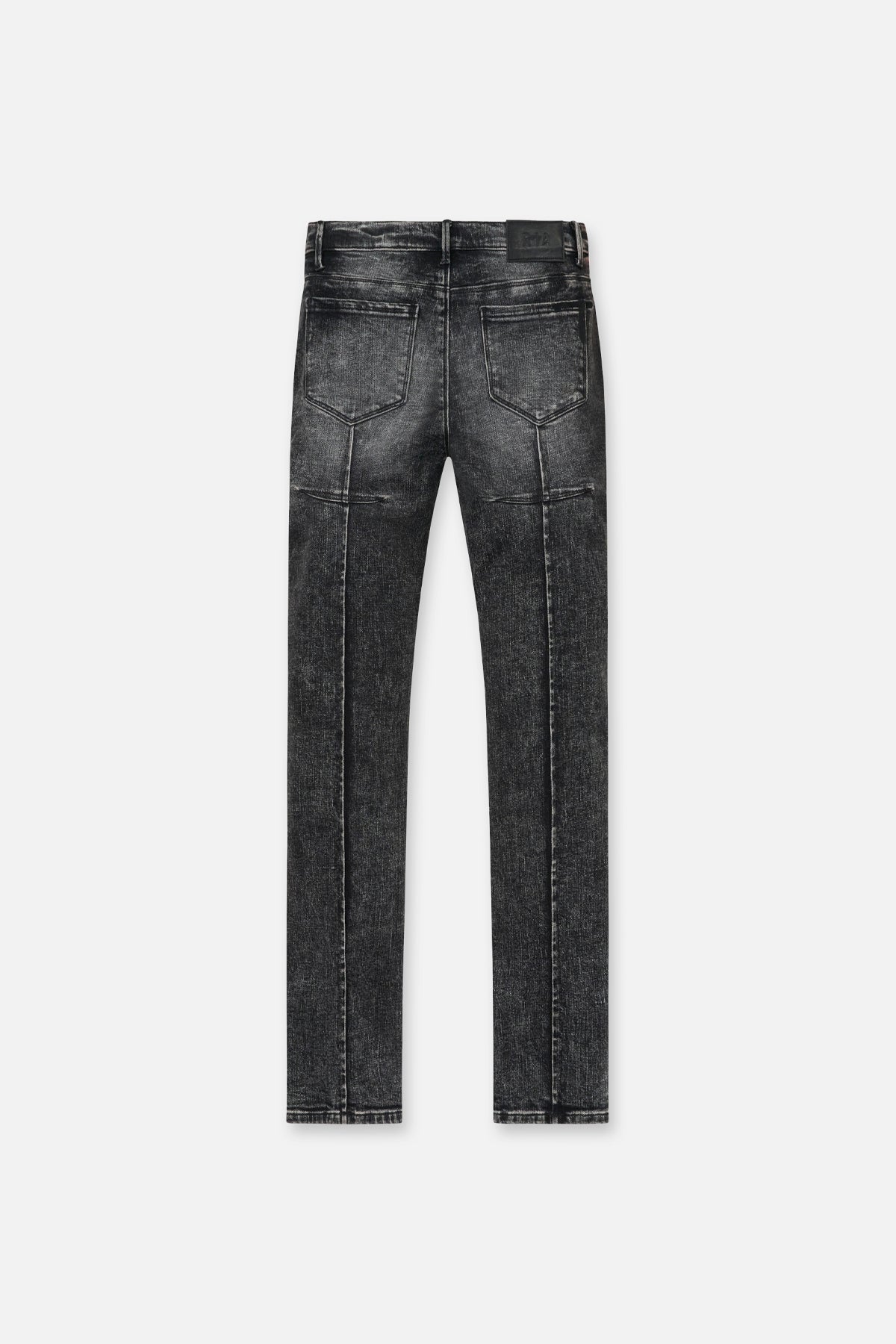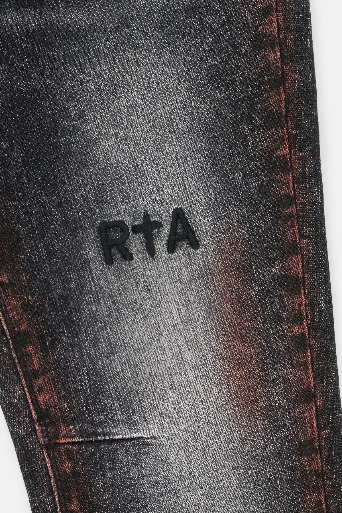 The Clayton Jean in Charcoal Acid Wash Red features a button front, zip fly, belt loops, front scoop pockets, and back patch pockets. Our iconic RTA logo is stitched above the left leg, topstitched cross designs down the back, and finished off with a faded wash and red tint along the seams.