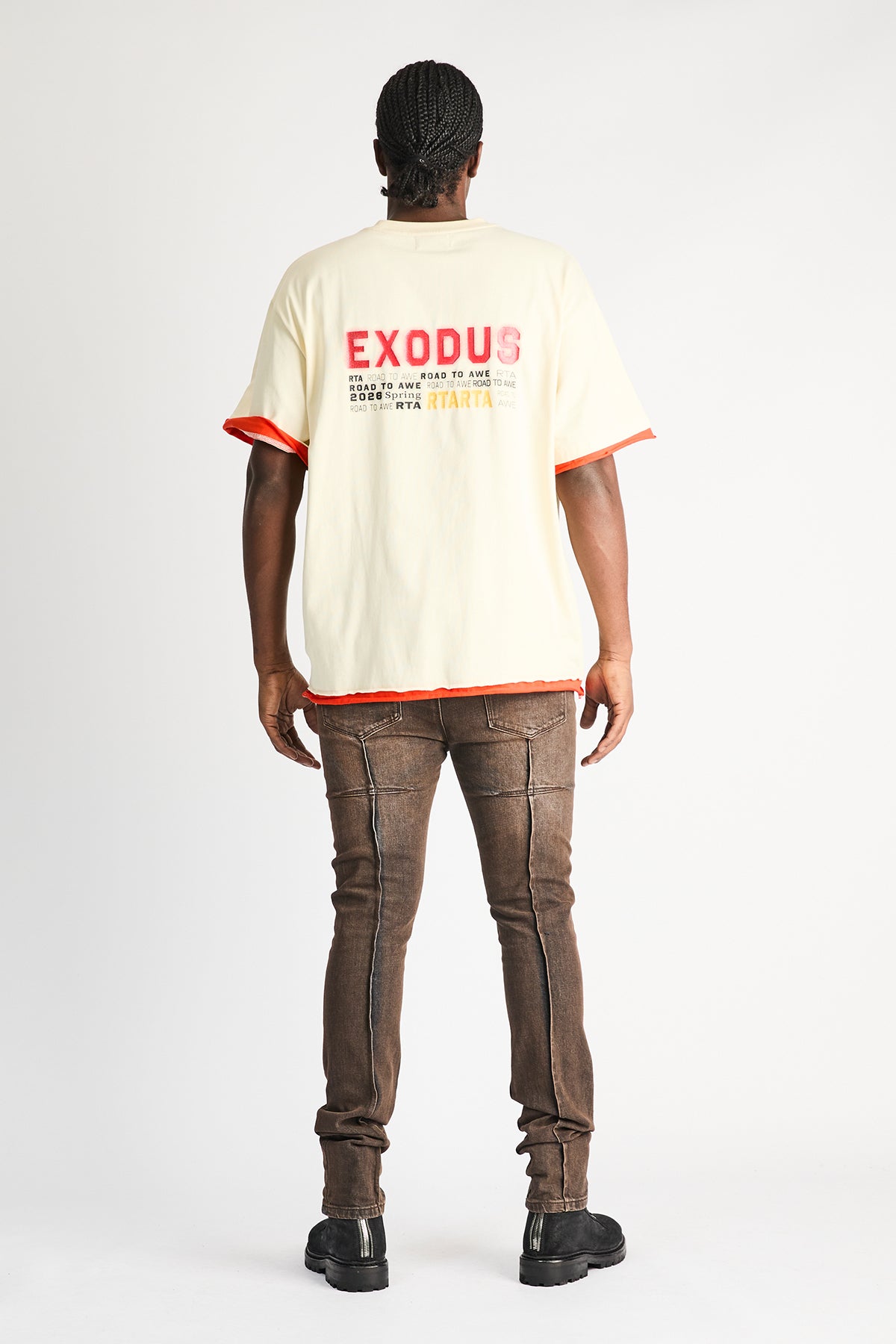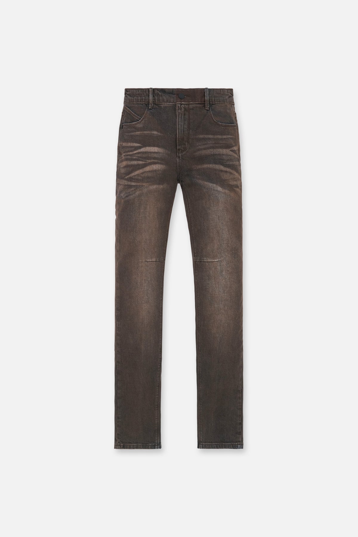 The Clayton Skinny Jean in Mocha Drift is made from premium denim. Designed with a skinny fit and reinforced stitching on the inner thighs, these jeans feature the iconic RtA cross on the back pocket, signature leather patch on the back waistband, pin-tuck dagger seams down the back legs, and finished with a vintage brown wash.