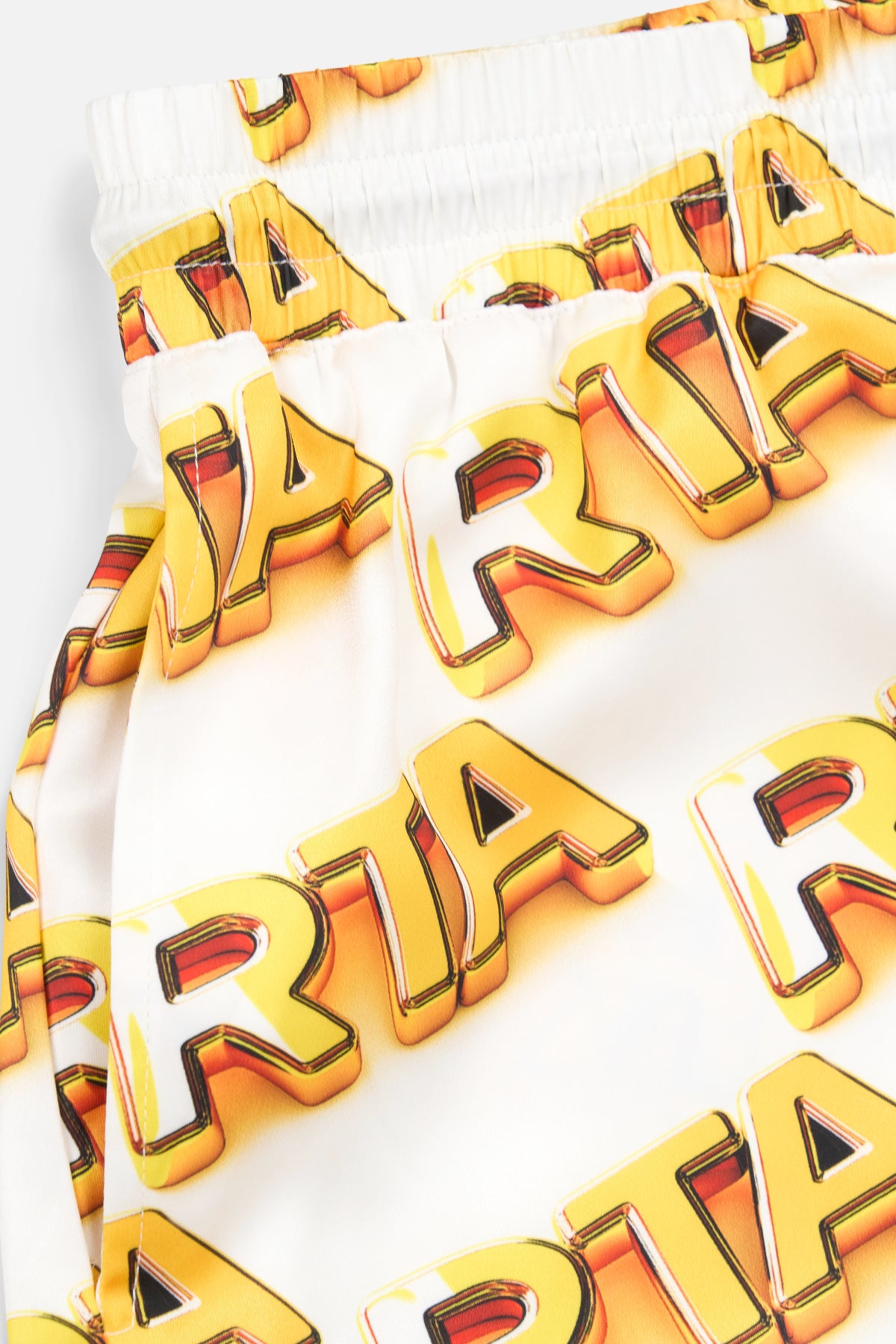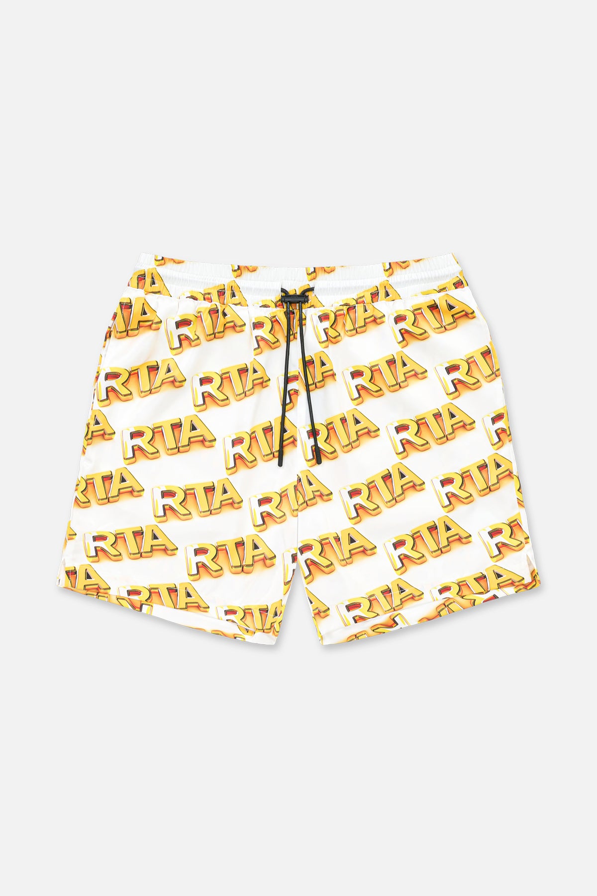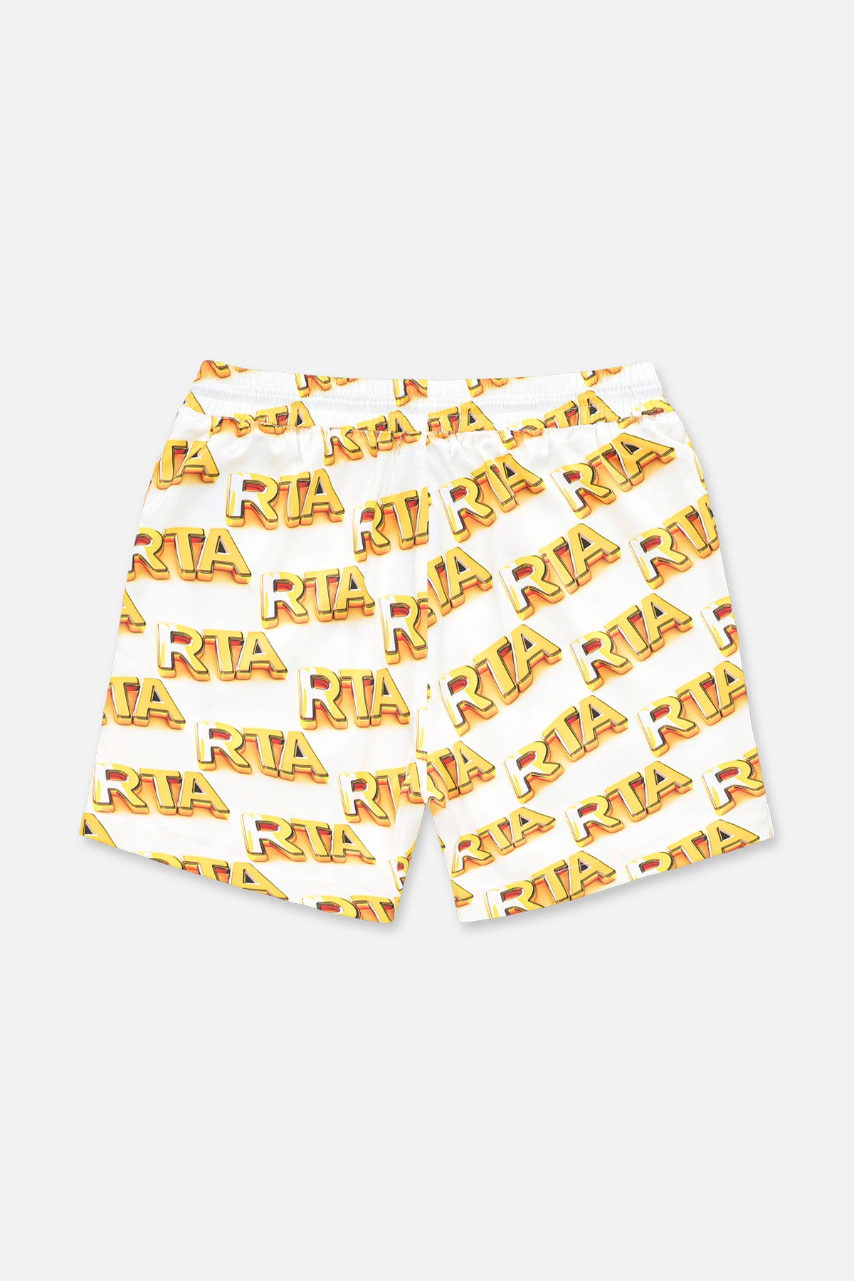 The Clyde Short in with RTA Bullion is a lightweight, silky short designed with an all over RTA logo in a metallic gold gradient and a 3D effect, designed to resemble the look of gold bars. These shorts feature an elasticized waistband, side pockets, and a coated, toggle drawstring for an adjustable fit.