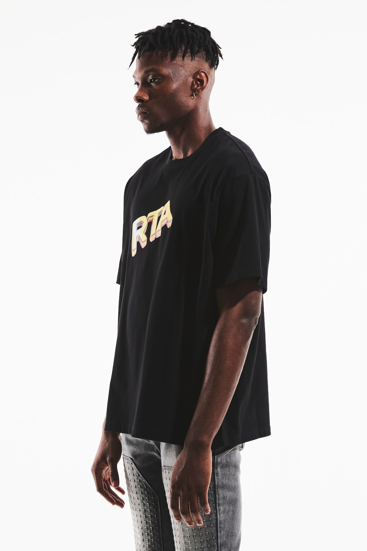 The Colin Oversized Short Sleeve Tee in Black Cash Only is an oversized, crew neck tee made from 100% Cotton. This tee features the RTA logo in a metallic gold gradient and a 3D effect, designed to resemble the look of gold bars.