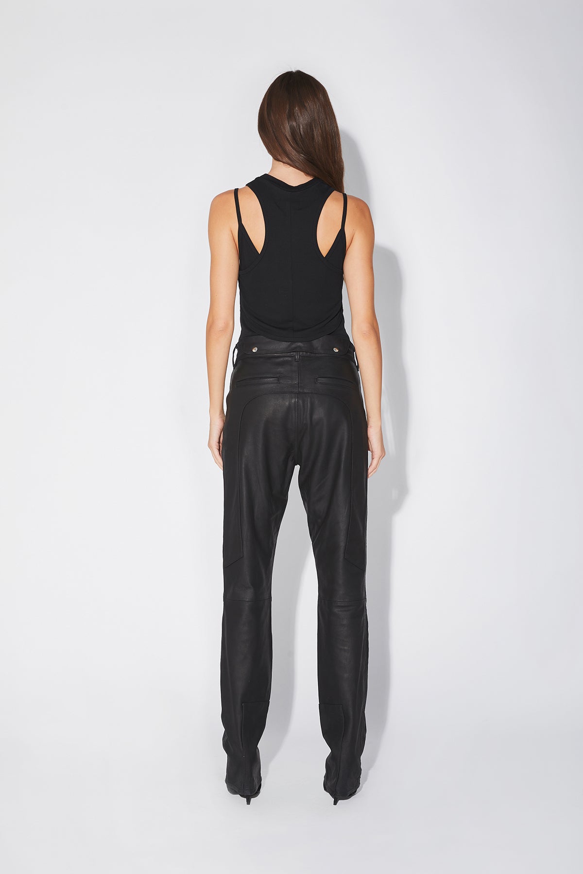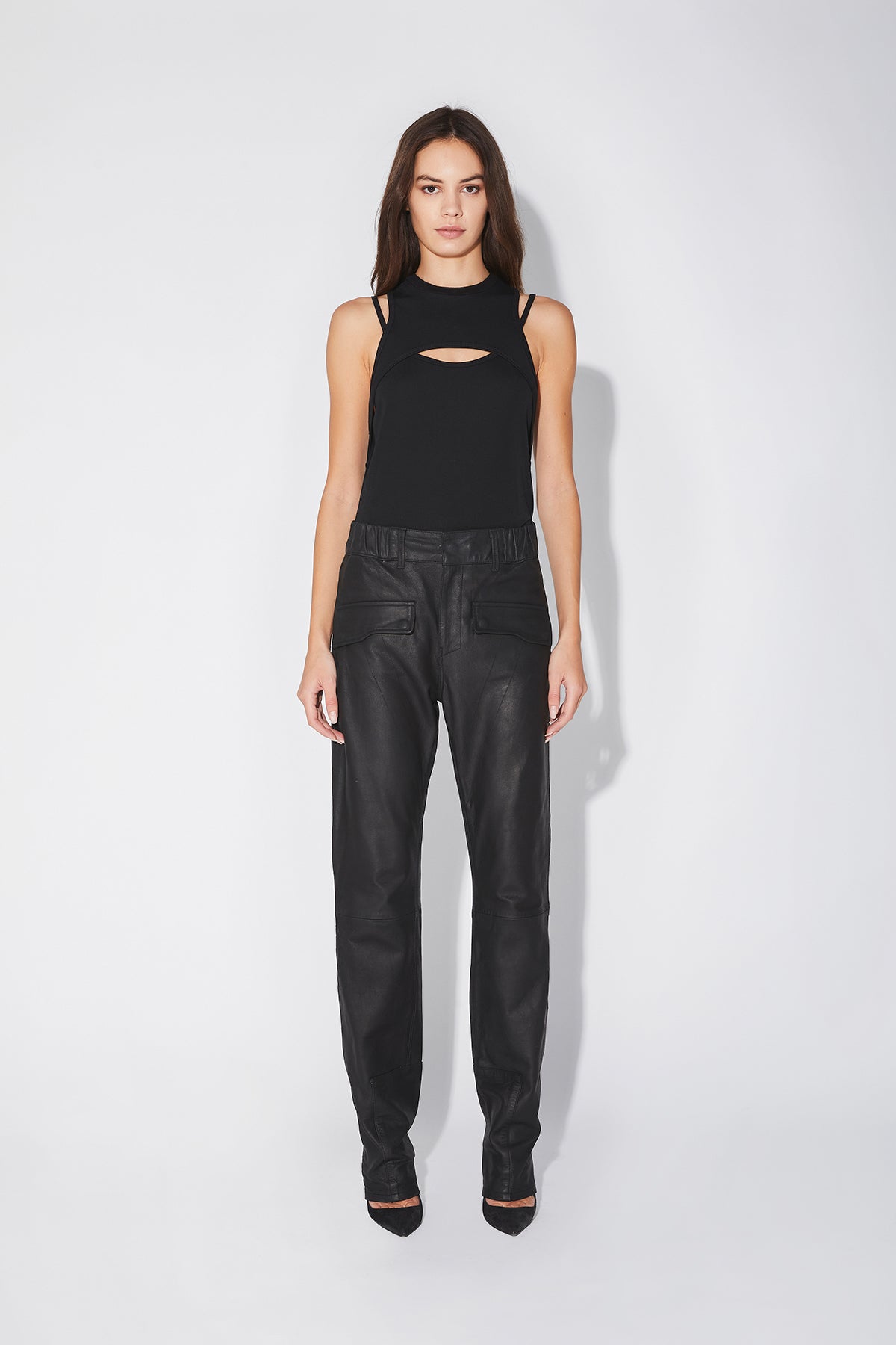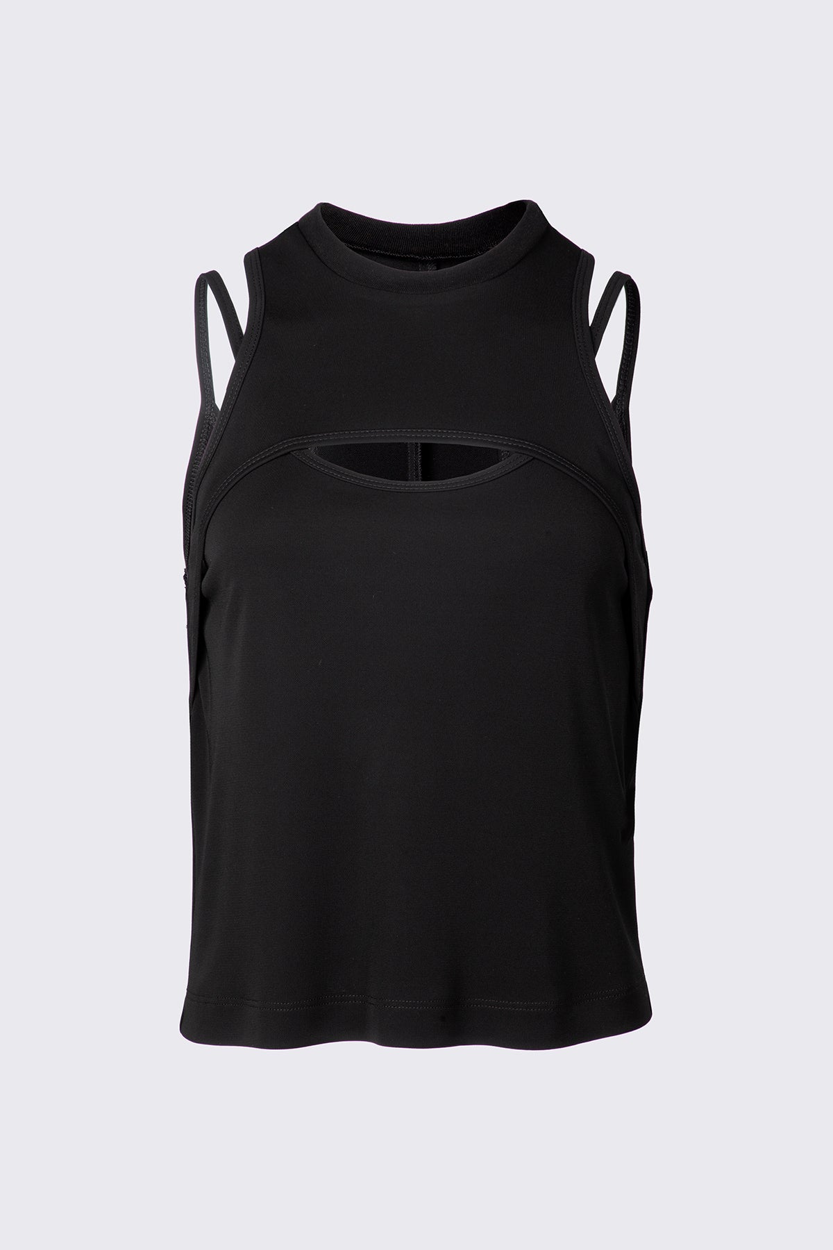 The RTA Della Top in black is a slinky fabric knit tank top featuring a layered camisole and racerback panel design showcasing cut outs and spaghetti strap details.