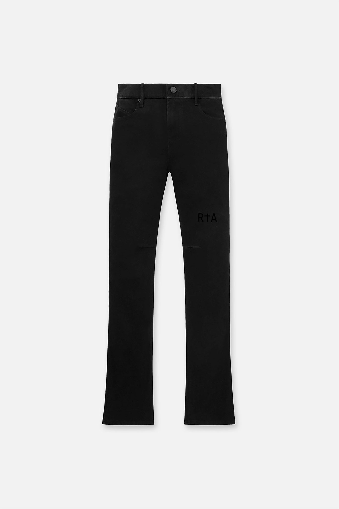The Denis Mini Flared Skinny Jean, with a slight stretch, presented in a deep black wash. This jean features stitched detail at the waistband and a tonal embroidered RTA logo on the front thigh.