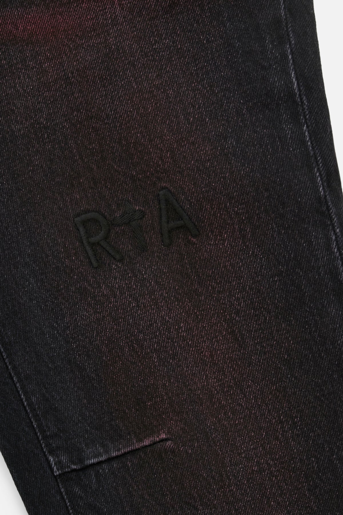 The Denis Skinny Jean in Black Red Glow is made from high-quality denim. Designed with a slim fit, faded red wash, and reinforced stitching on the inner thighs. These jeans feature the "RTA" logo embroidered on each side of the upper thigh, the iconic RTA cross on the corner of the front pocket, and signature leather patch on the back waistband.
