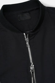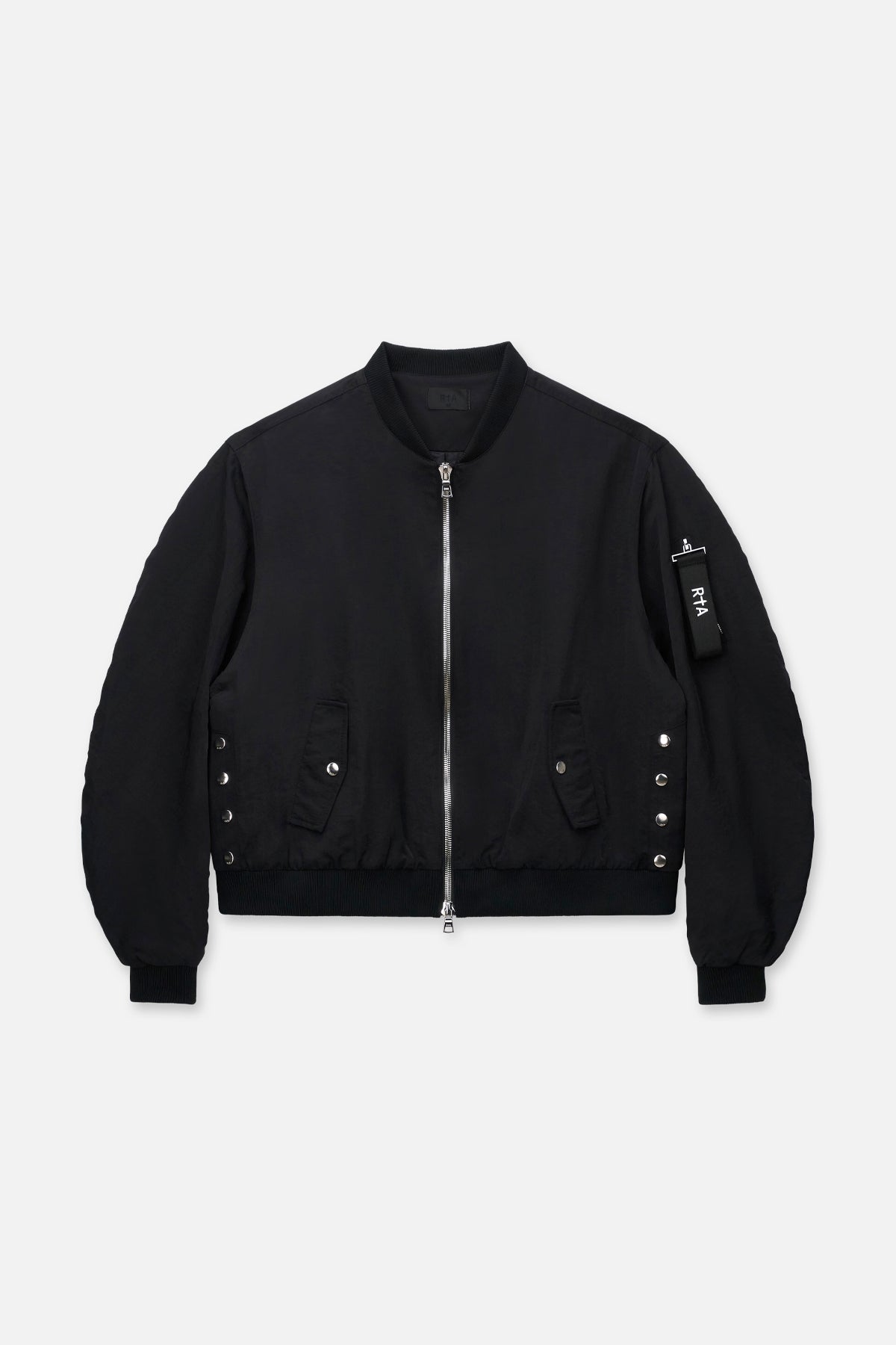 The Diego Jacket in Black is a bomber style jacket made of lightweight Nylon. This jacket features a classic ribbed collar, cuffs, and hem. A full length, two-way zipper, flap pockets with button closures, silver rivet detailing along the sides, and an additional zippered pocket on the arm with an RTA pull tab.