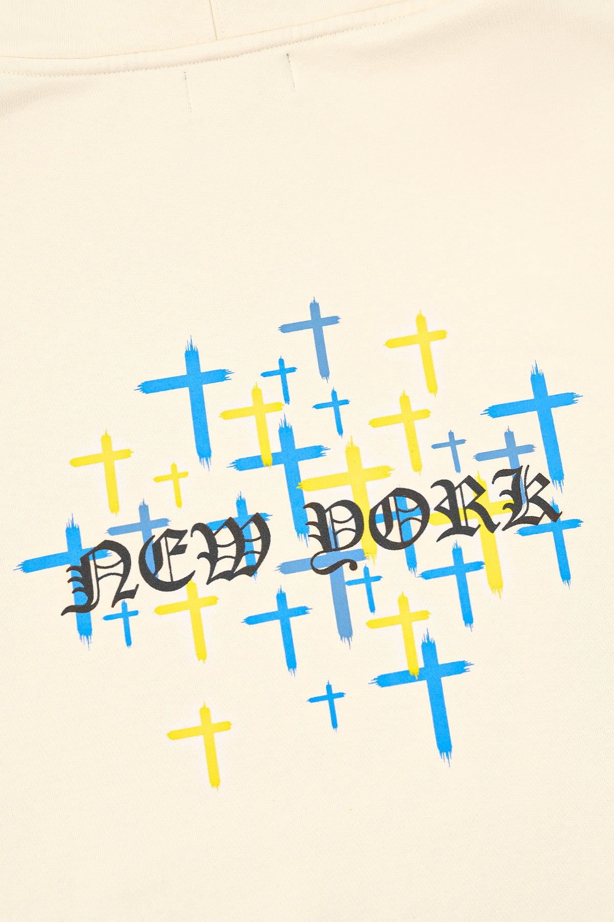 The Dion Hoodie in Sand Old English NY is made from 100% Cotton. Designed with reinforced, coated drawstrings, kangaroo pocket, and a ribbed waistband and cuffs. This hoodie features and Old English logo on the chest and New York cross motif on the back.
