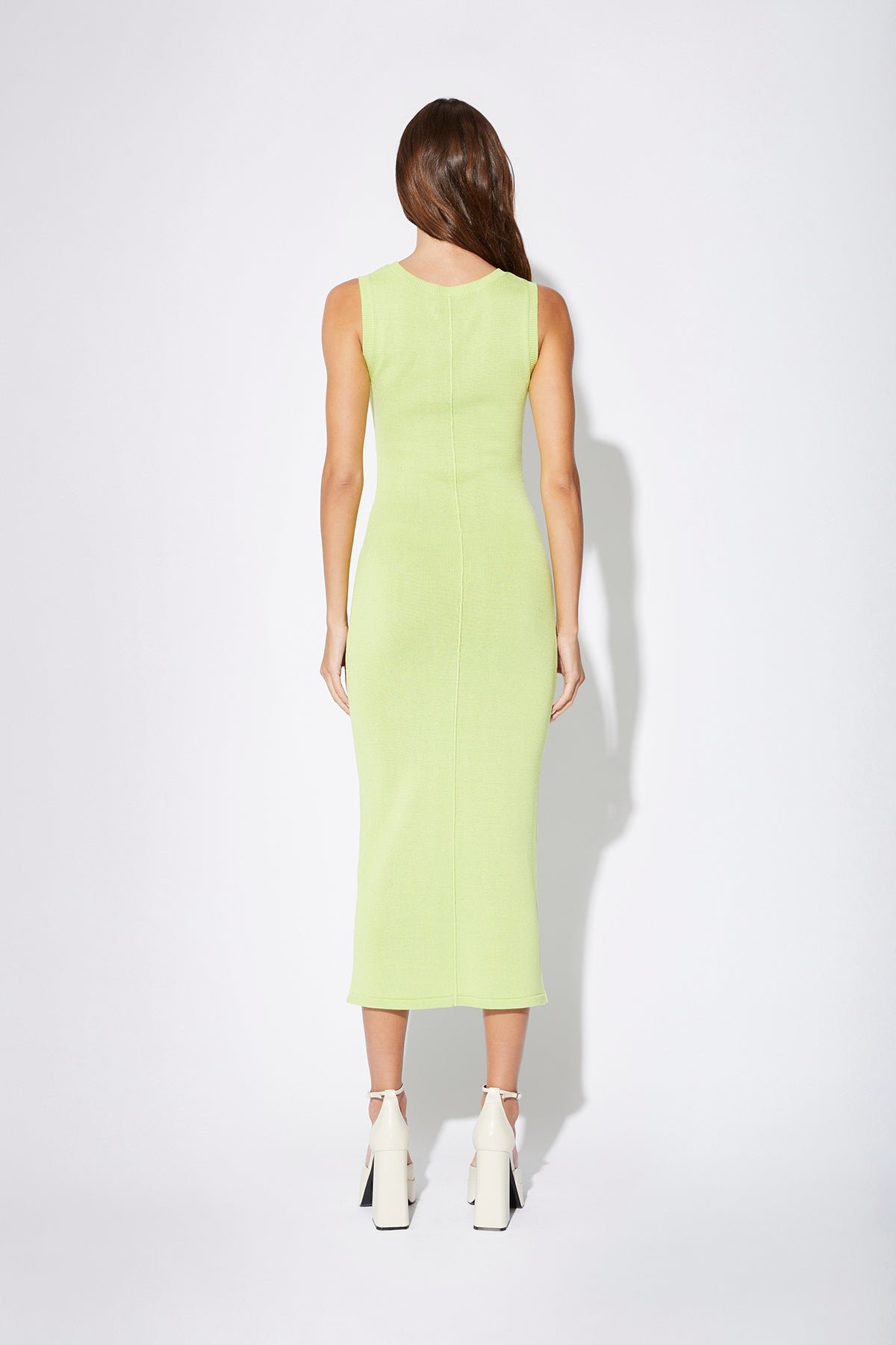The easy yet elegant Estela sleeveless midi dress in a figure hugging silk knit features a cut out neckline, ribbing at the neck and sleeves and seam detail at the back.
