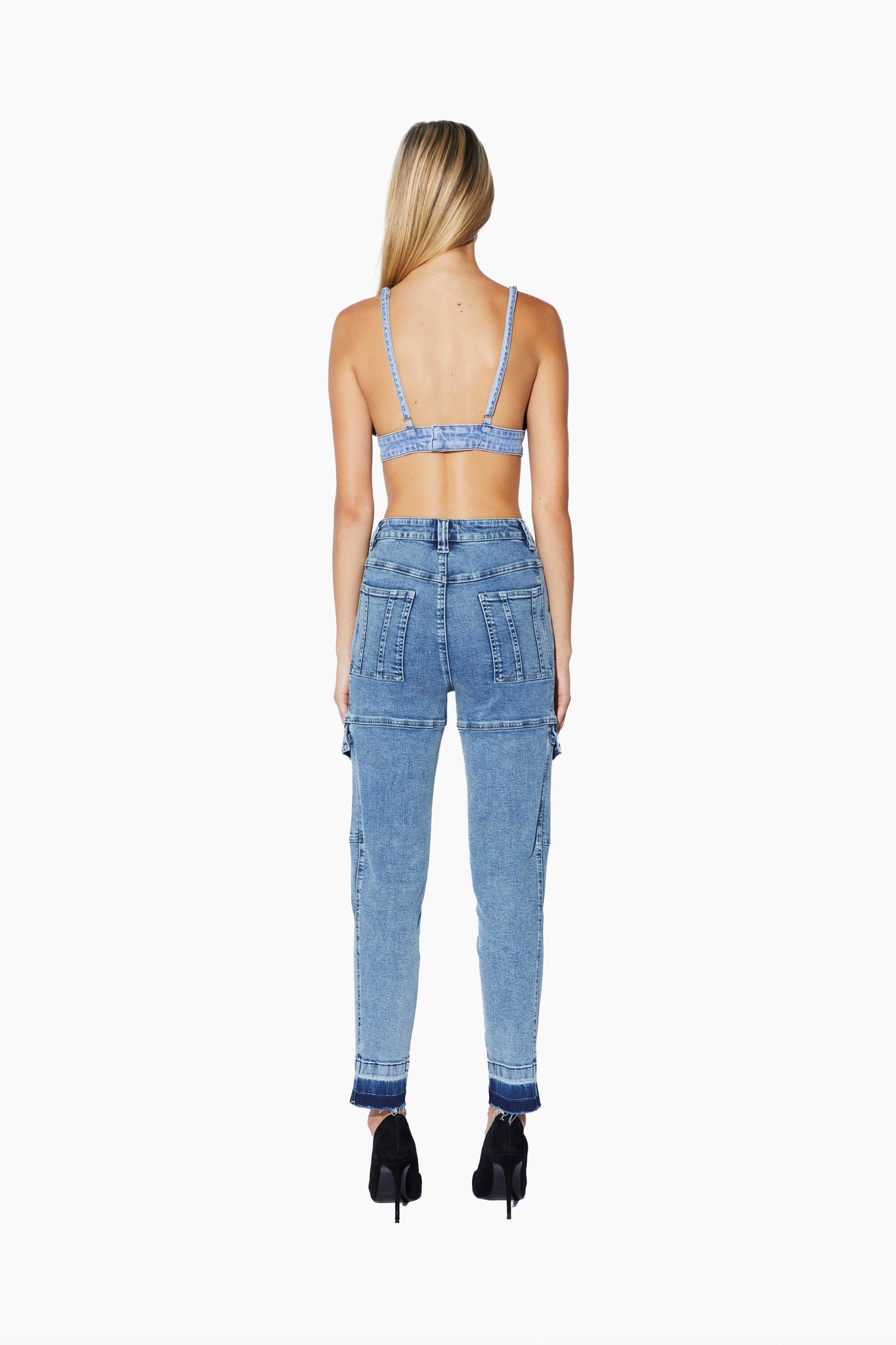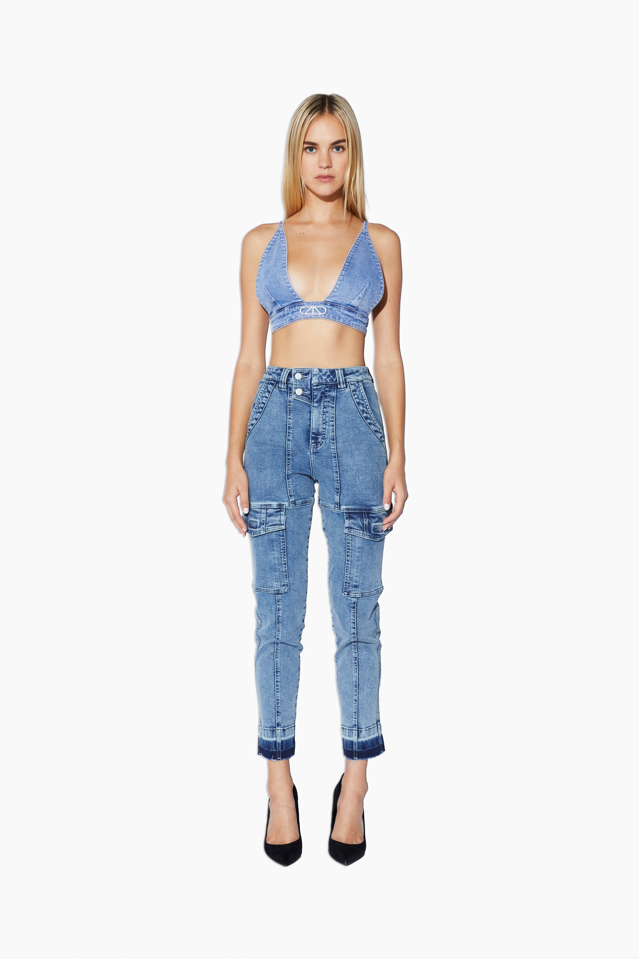 The Eva Denim Slim Cargo Pant in light blue wash is an ankle cropped pant featuring various utility pockets and a slim fit.