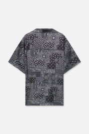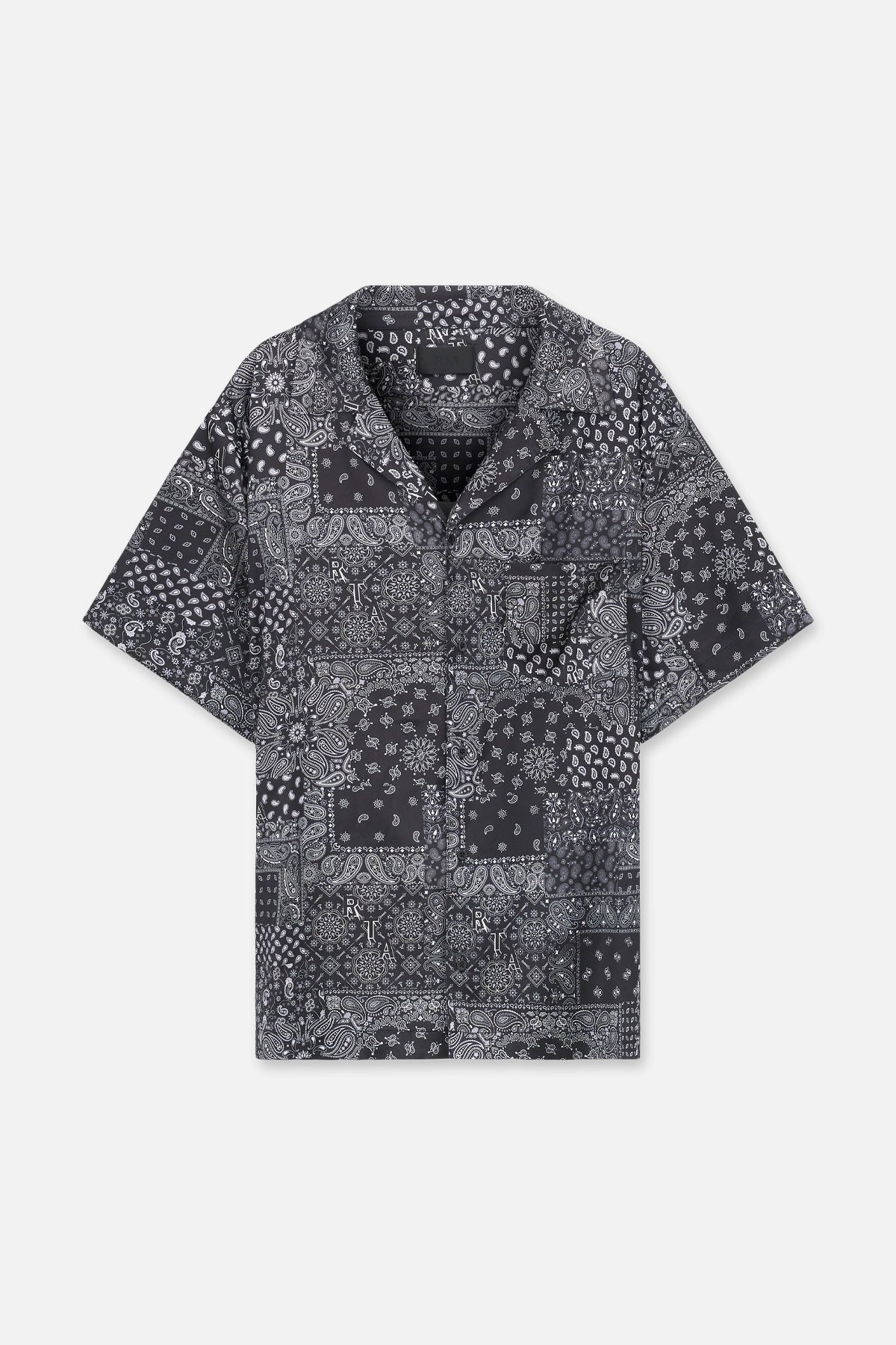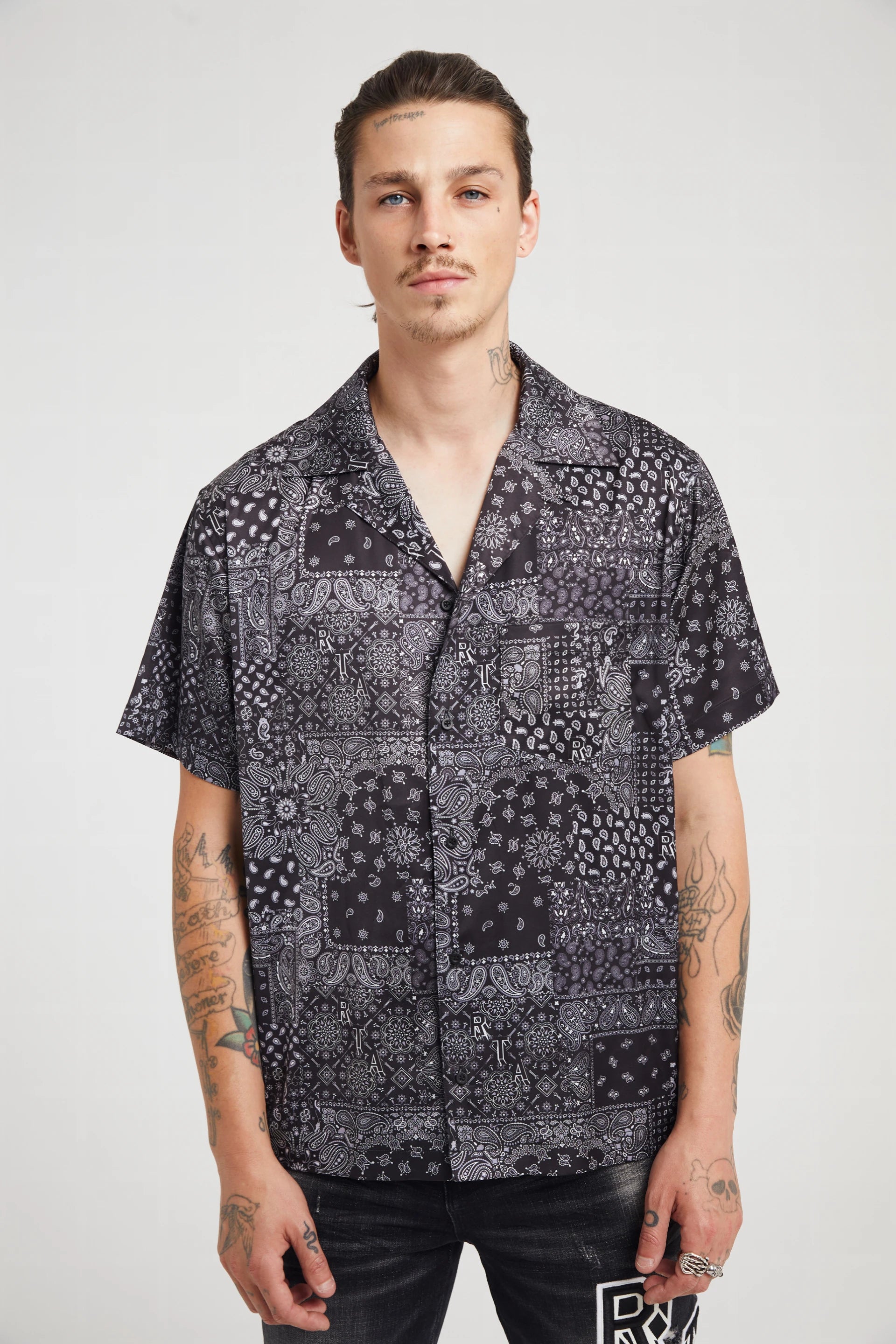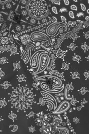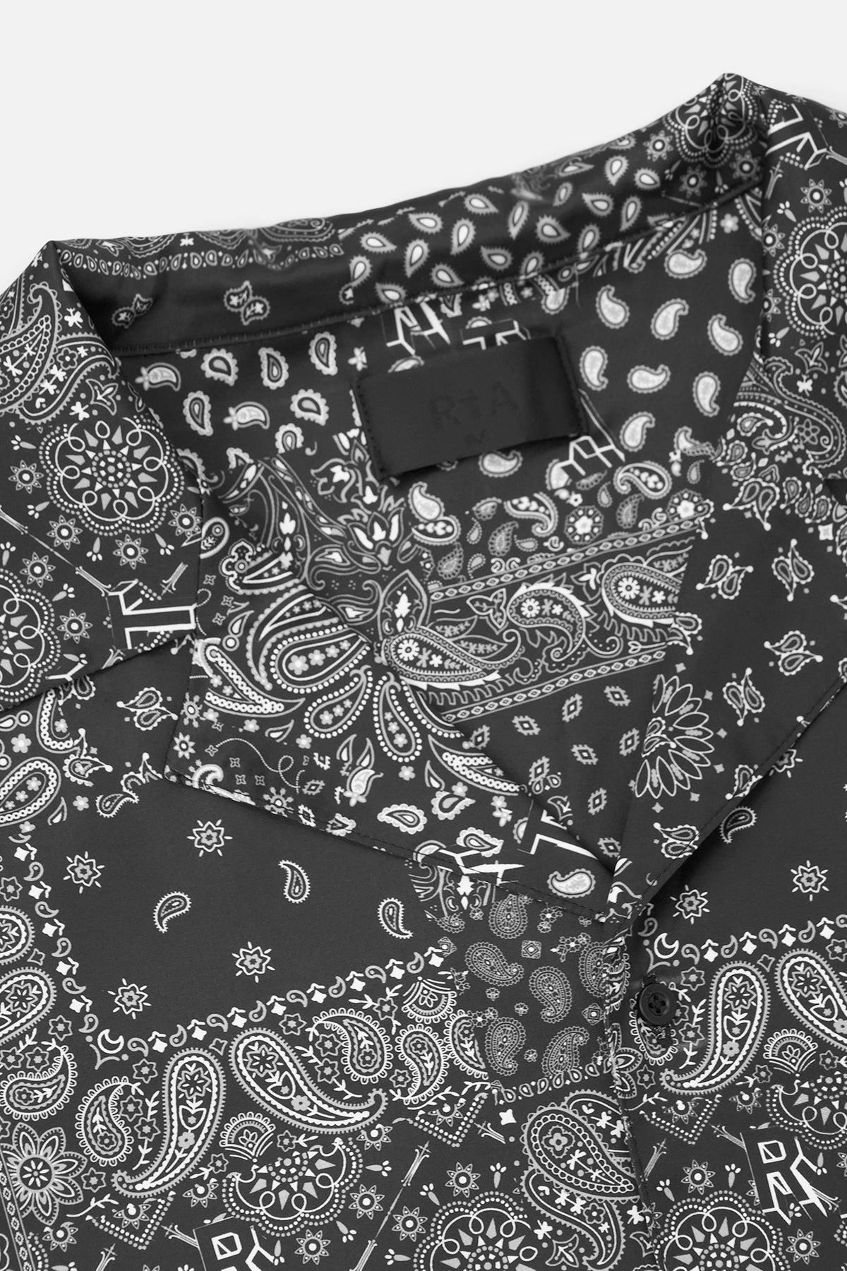 The George in Black & White RTA Bandana is a silky, lightweight button down shirt with short sleeves, allover contrasting paisley print and RTA logo detailing throughout.