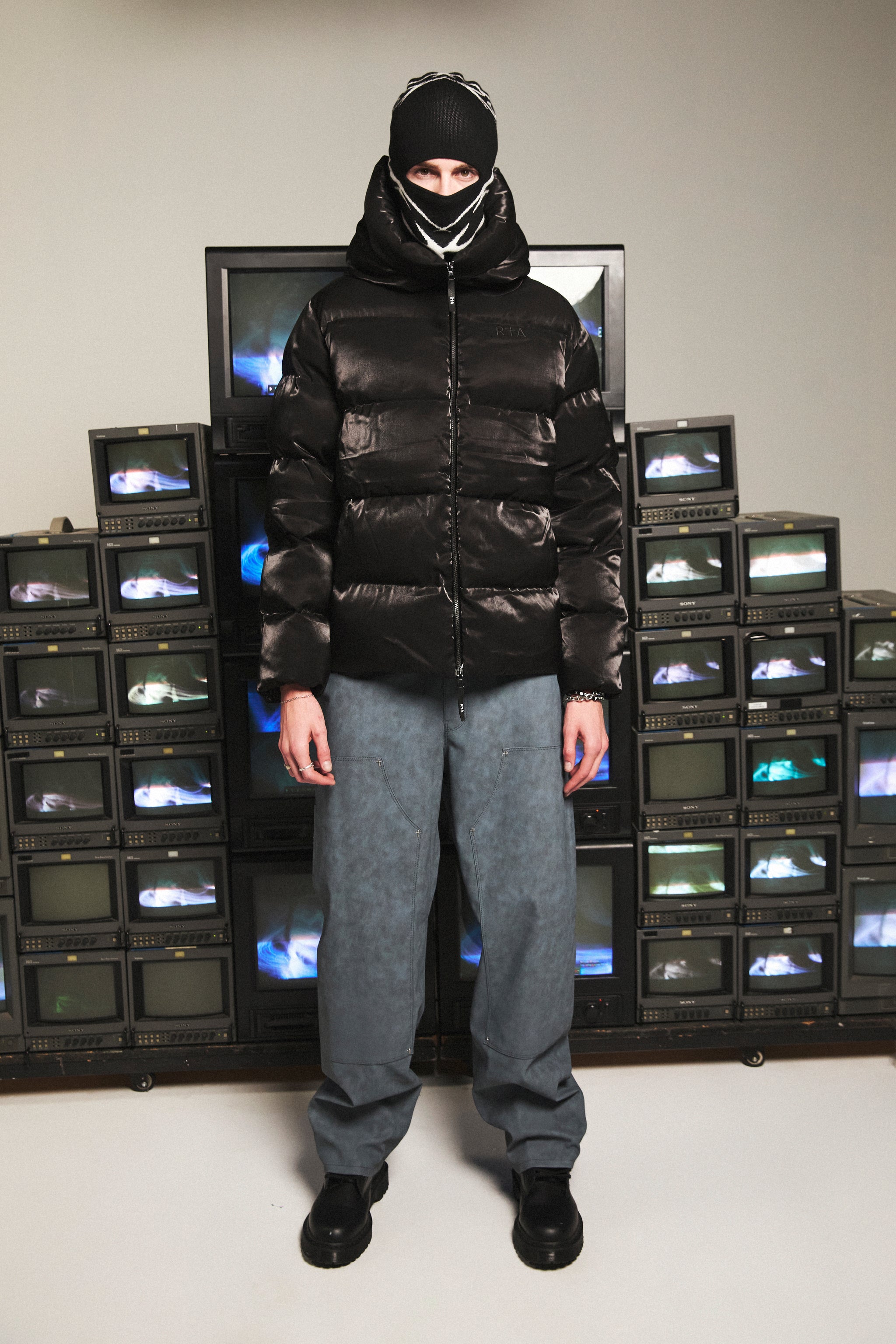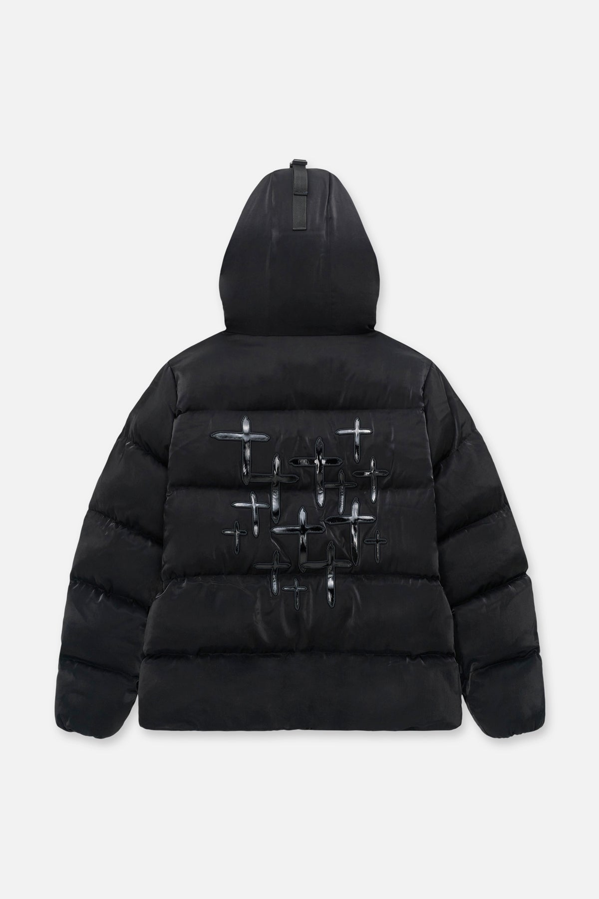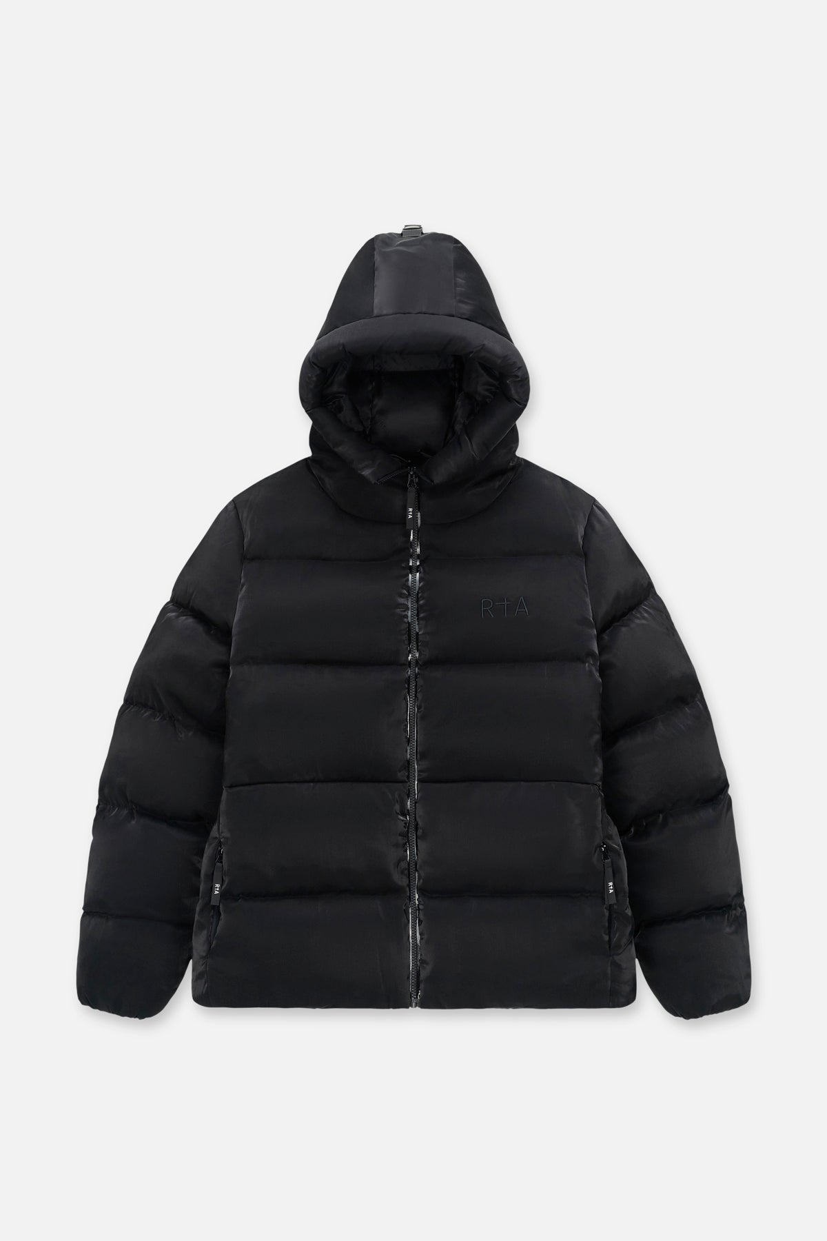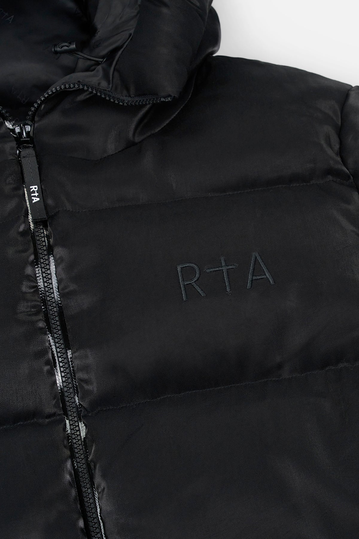 The Grant Jacket in Black Luminous is a quilted puffer jacket made with a high-shine fabric and a reflective, luminous finish. Designed with a scuba neck, zippered pockets, and a utilitarian strap detail at the hood, this jacket features the classic RtA logo on the chest and tonal RtA cross appliqués on the back.