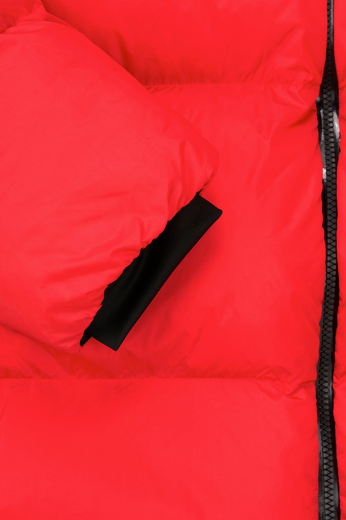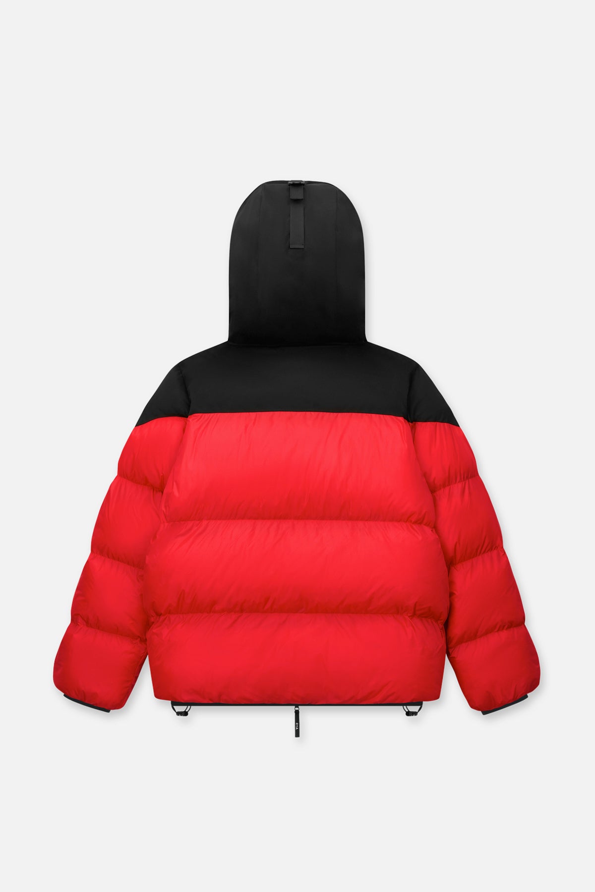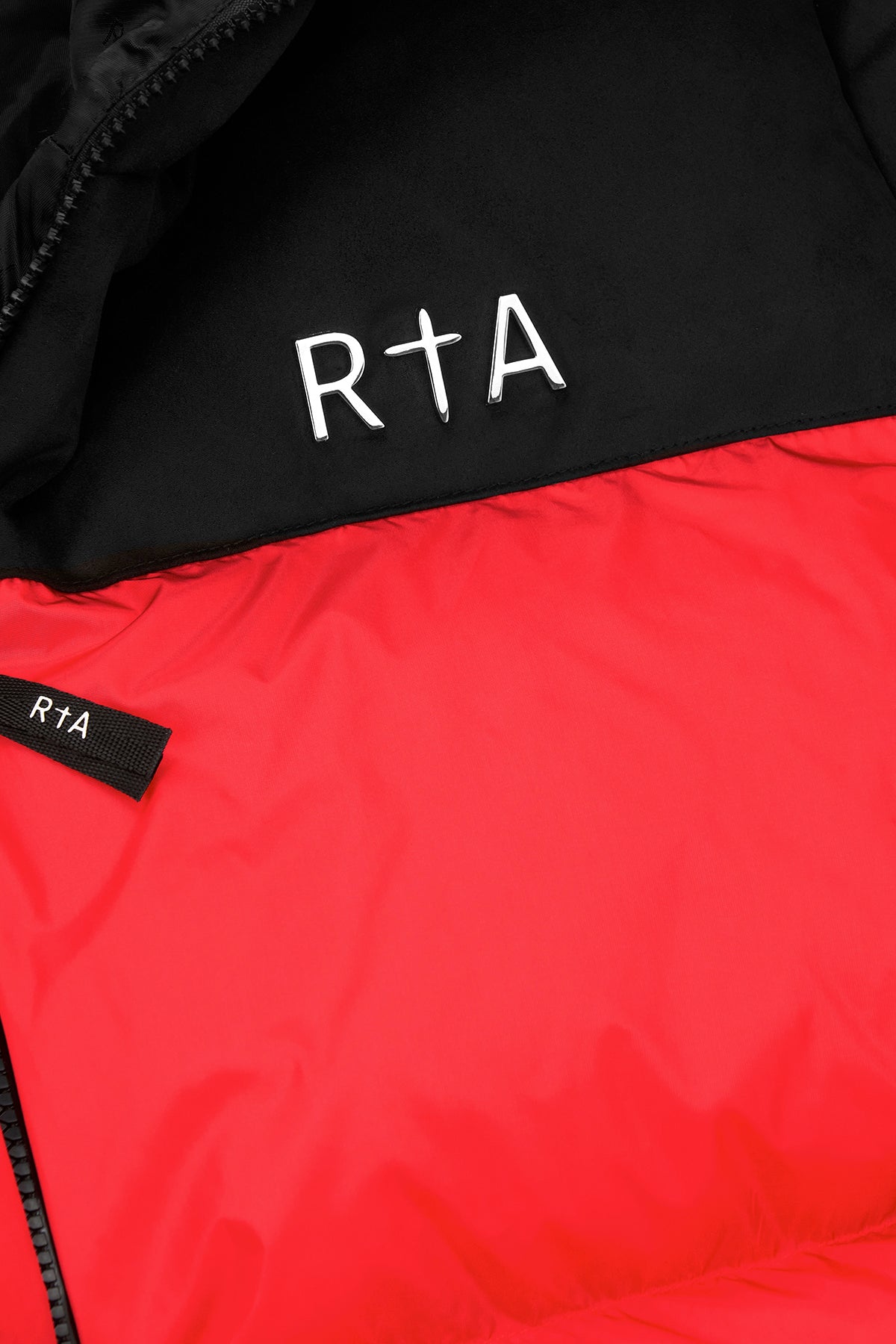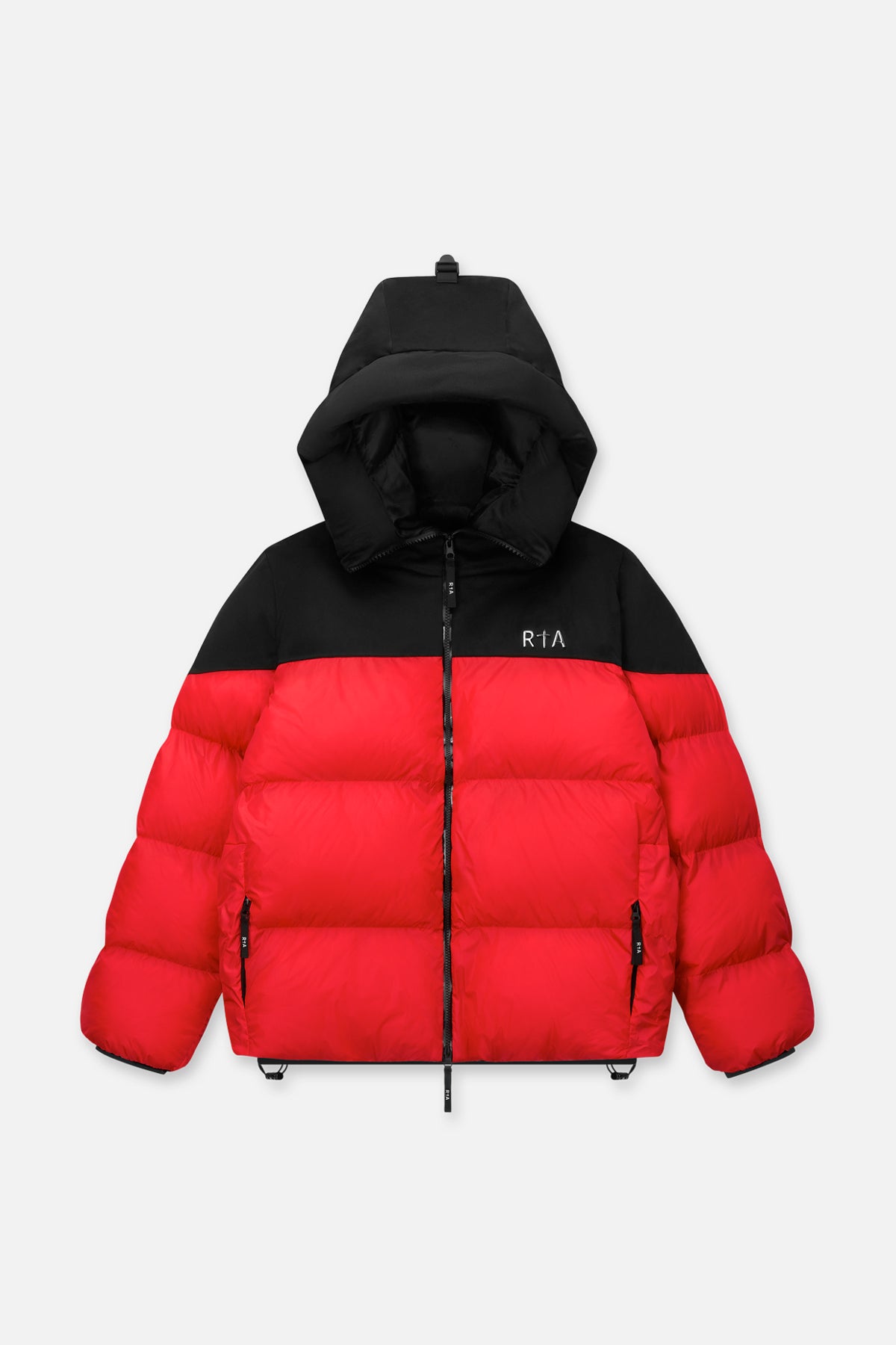 The Grant Jacket in Red Black Combo is a quilted puffer jacket designed for comfort and functionality. Featuring a scuba neck, zippered side pockets, suede hood detailing, and adjustable strap on the back of the hood. This jacket is finished with the RTA logo in a silver emblem on the chest.