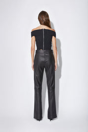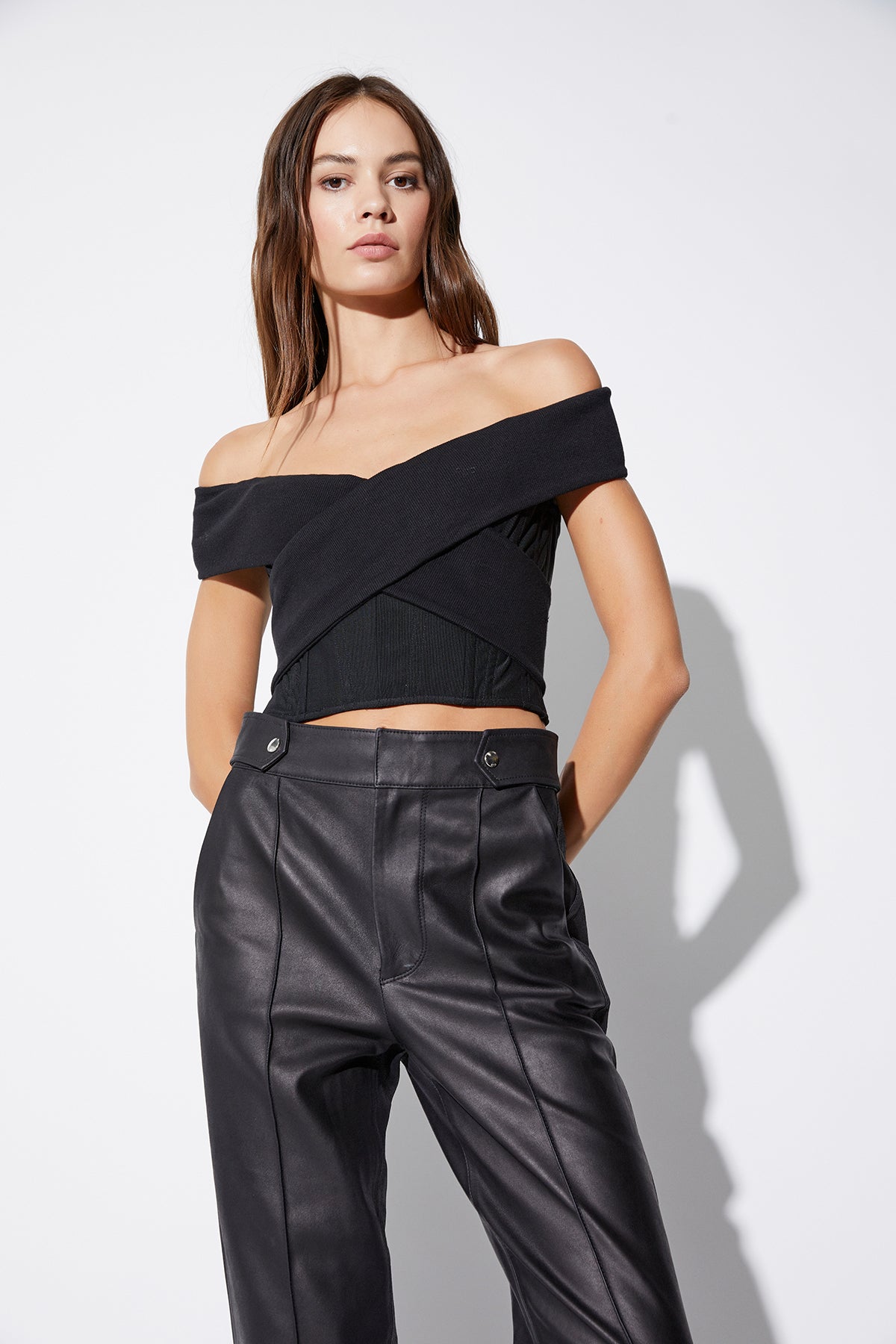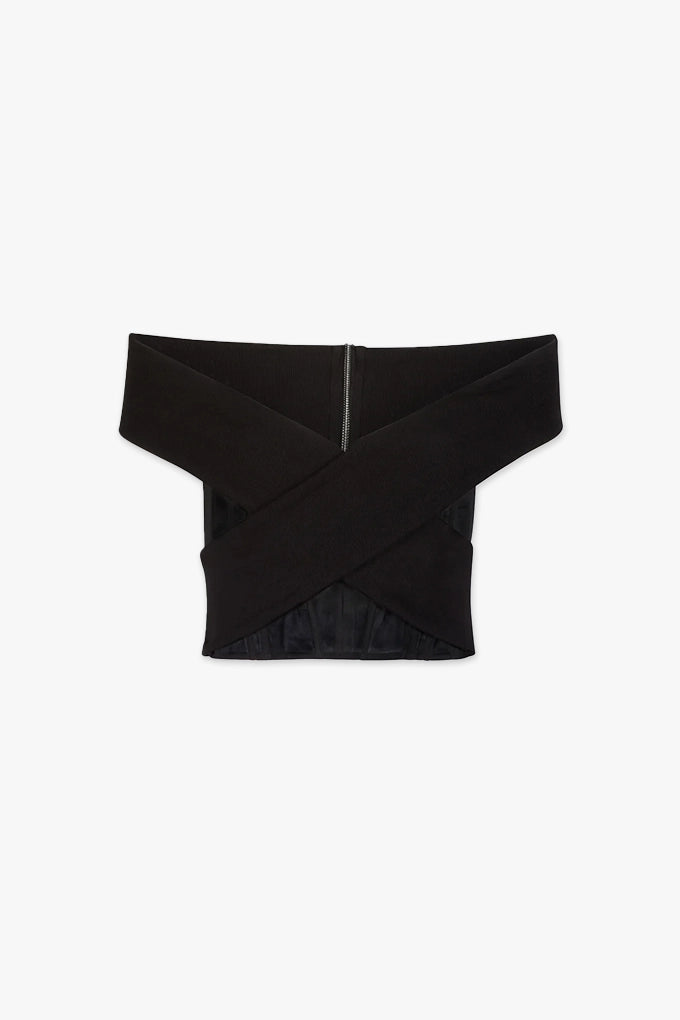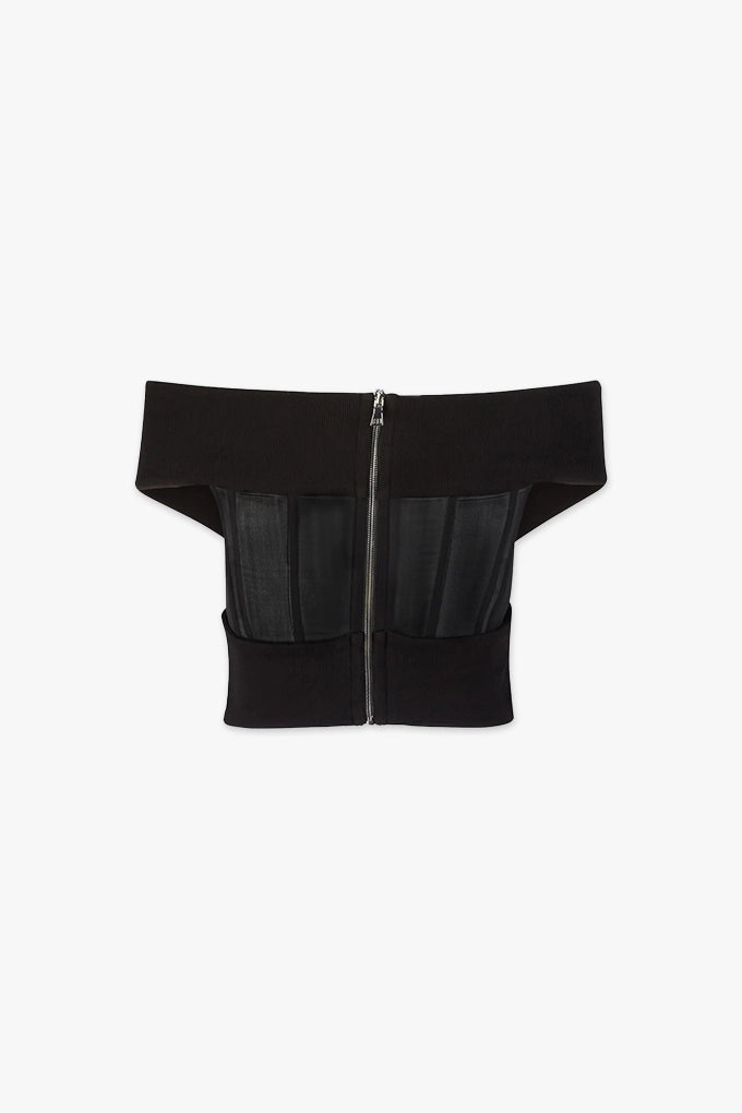 The Guadalupe Top in Black is an off-shoulder corset shirt featuring mesh panels and an exposed back zipper. This standout piece is done in premium cotton and nylon.