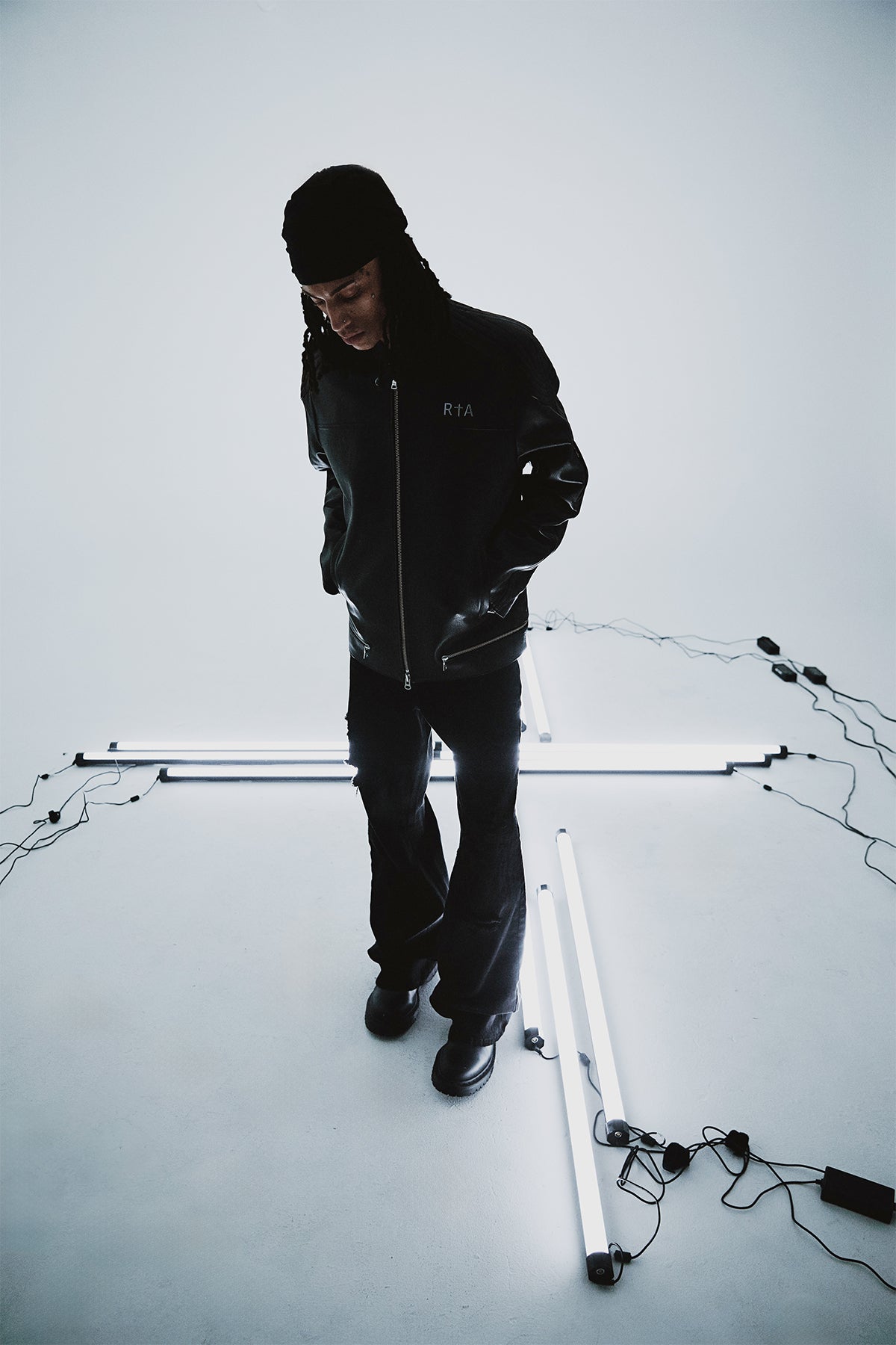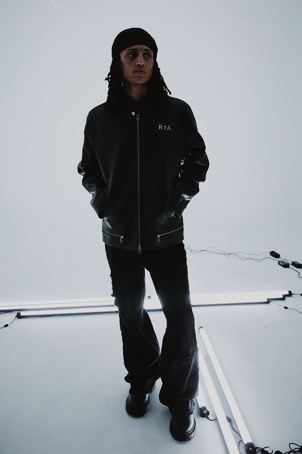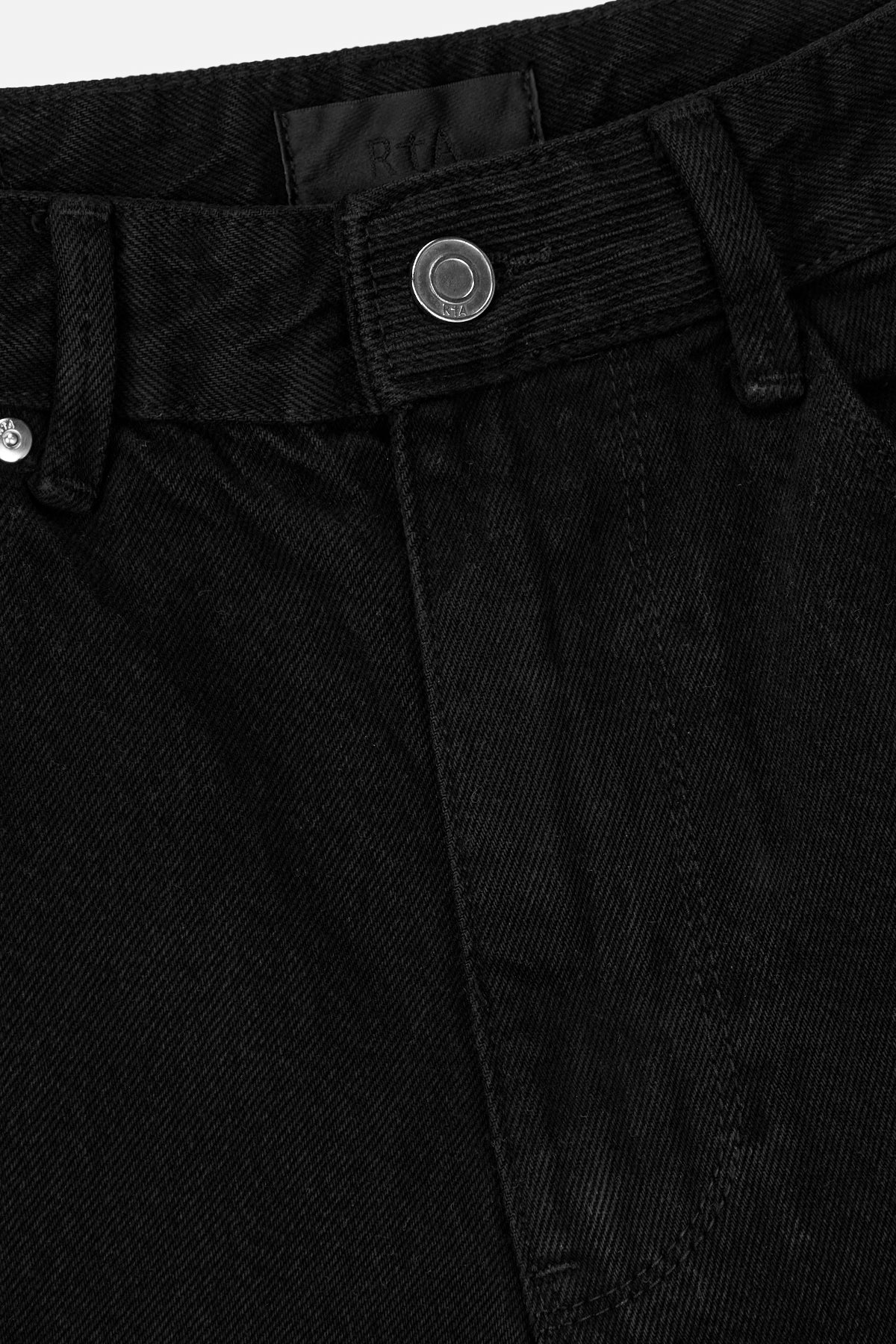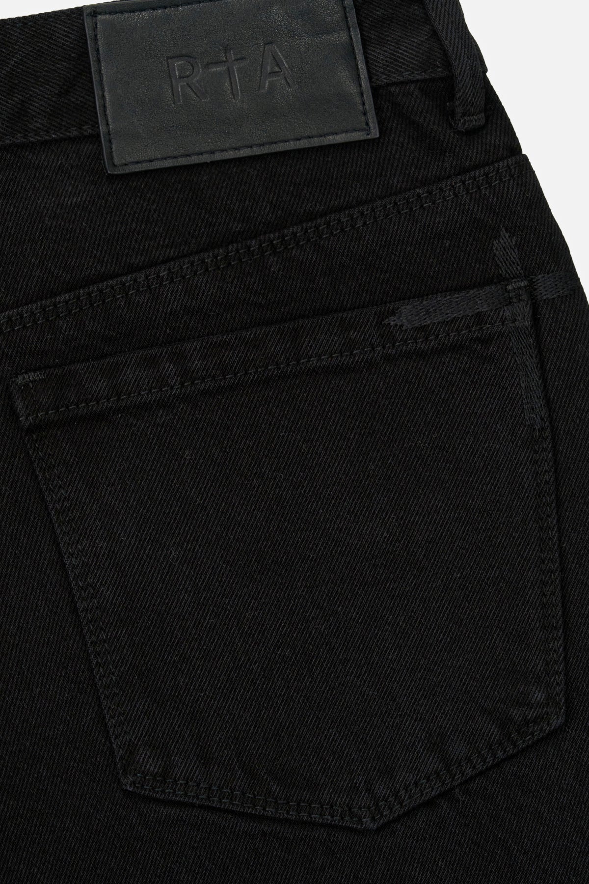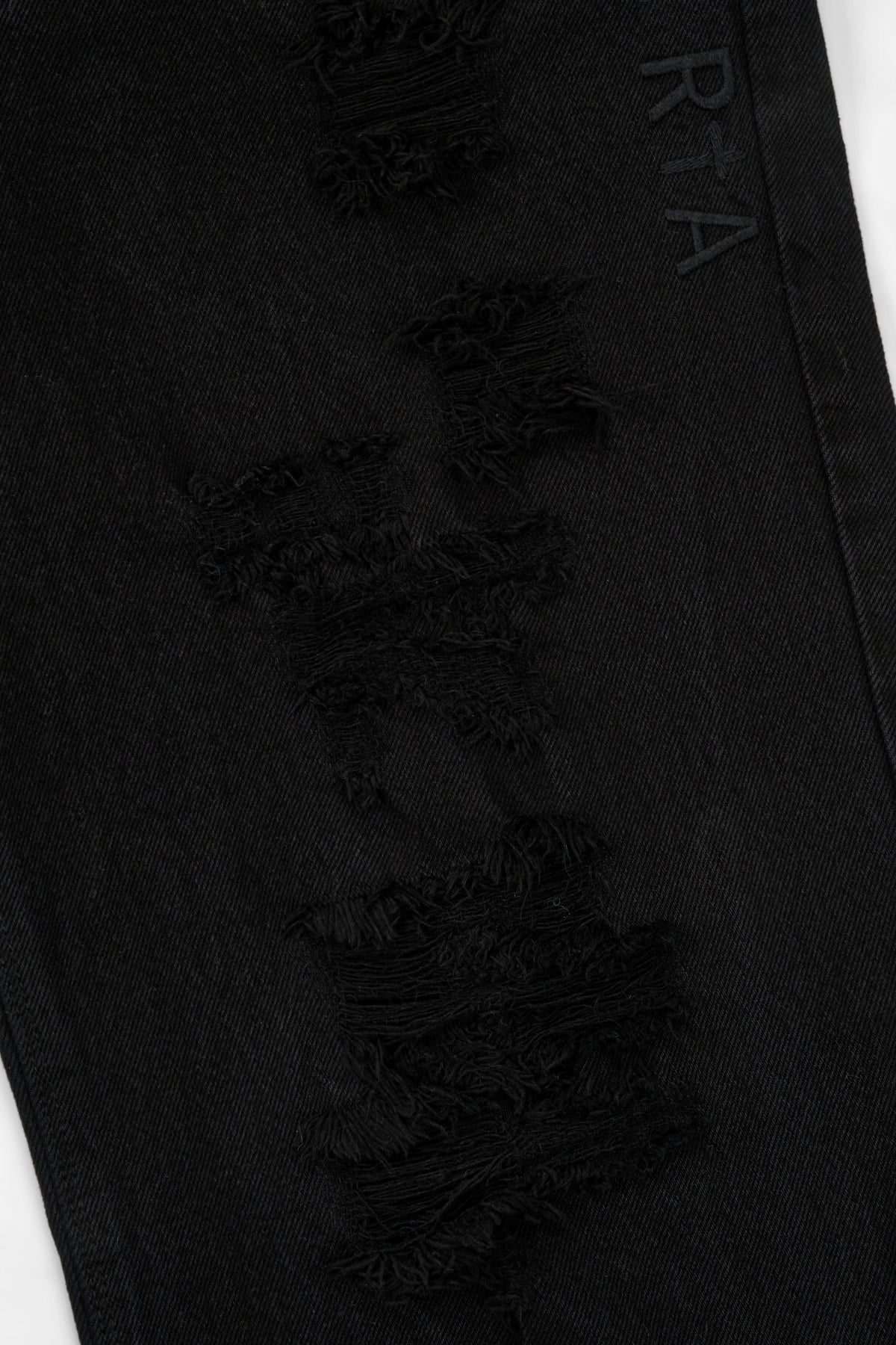 The Jamie Wide Leg Flare Jean in Black Scratched is made from premium denim, offering a relaxed, wide-leg fit. Designed with distressed detailing on the front legs, these jeans feature the RTA logo embroidered on each side of the leg, silver cross emblem on the front pocket, and signature leather patch on the back waistband.