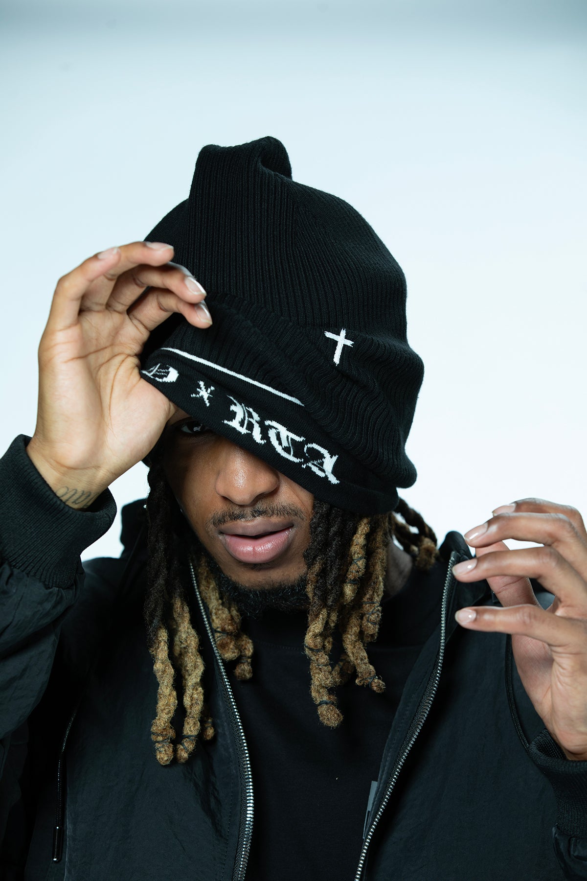 The Jay Face Mask in Black Old English DDG is a ribbed face mask made out of 100% Cotton. The front features the DDG X RTA logo on the front and the iconic RTA cross along the eye opening.