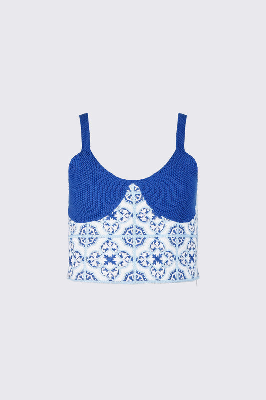 Inspired by the classic blue and white azulejo tiles of Portugal, the Joao crochet top features a geometric design with a contrast knit bust, scooped neckline and center back zip.