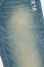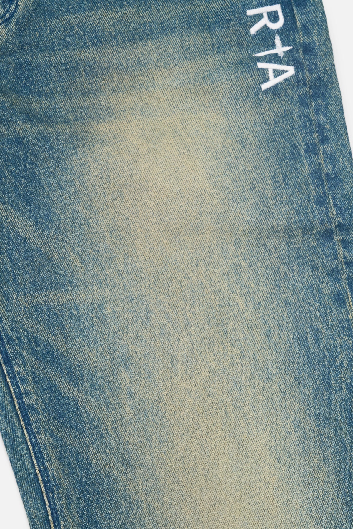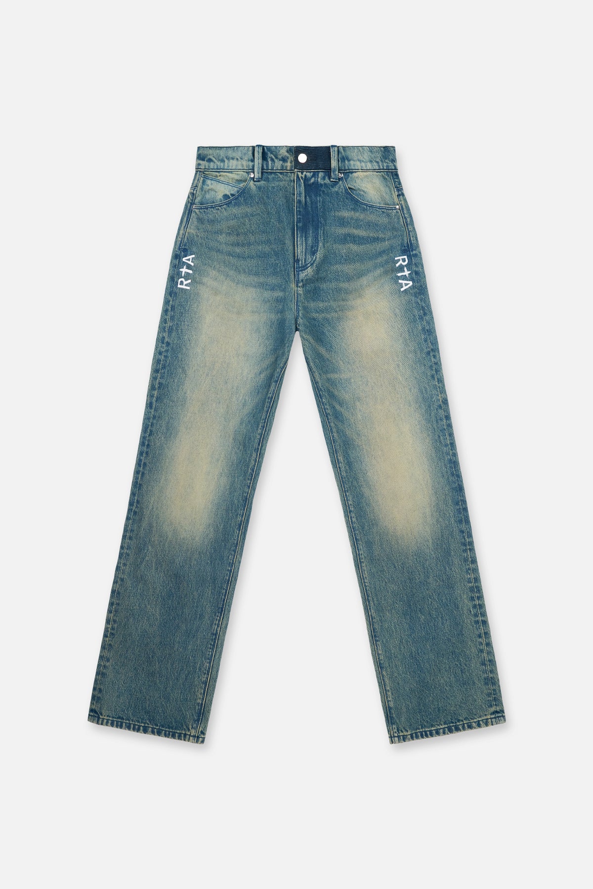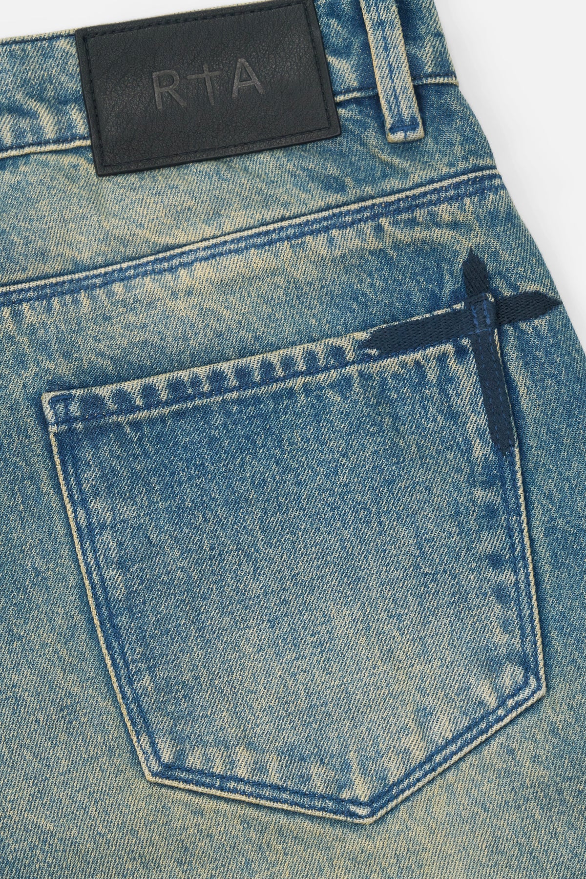 The Jonas Straight Leg Jean in Blue Mineral is made from premium denim, designed with a mineral blue wash and straight leg silhouette. These jeans feature the "RTA" logo embroidered on each side of the upper thigh, the iconic RTA cross on the back pocket, and signature leather patch on the back waistband.