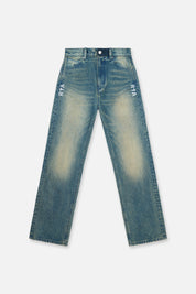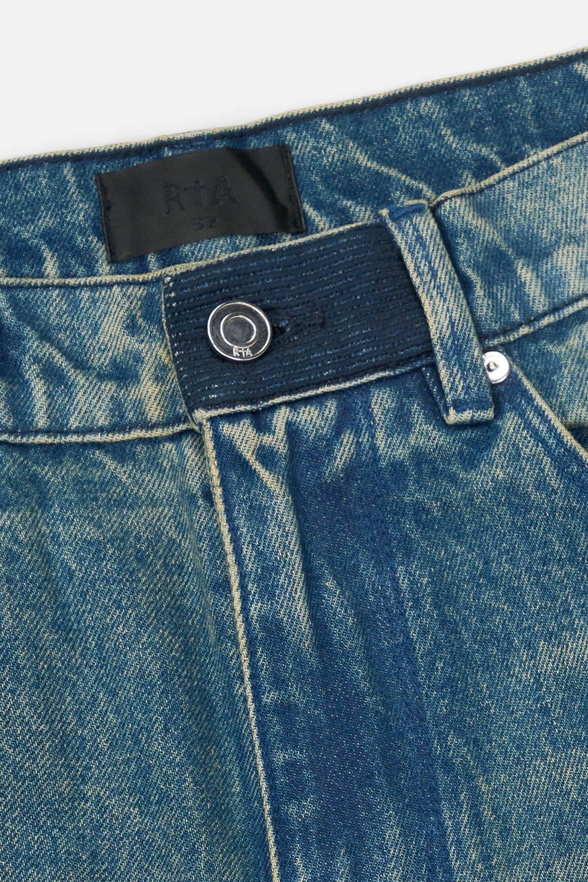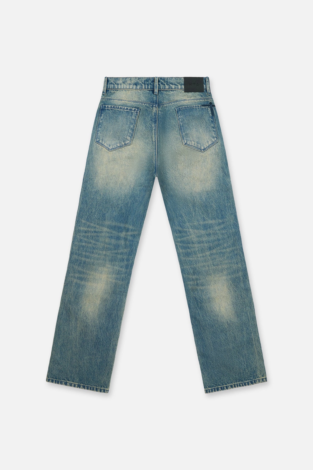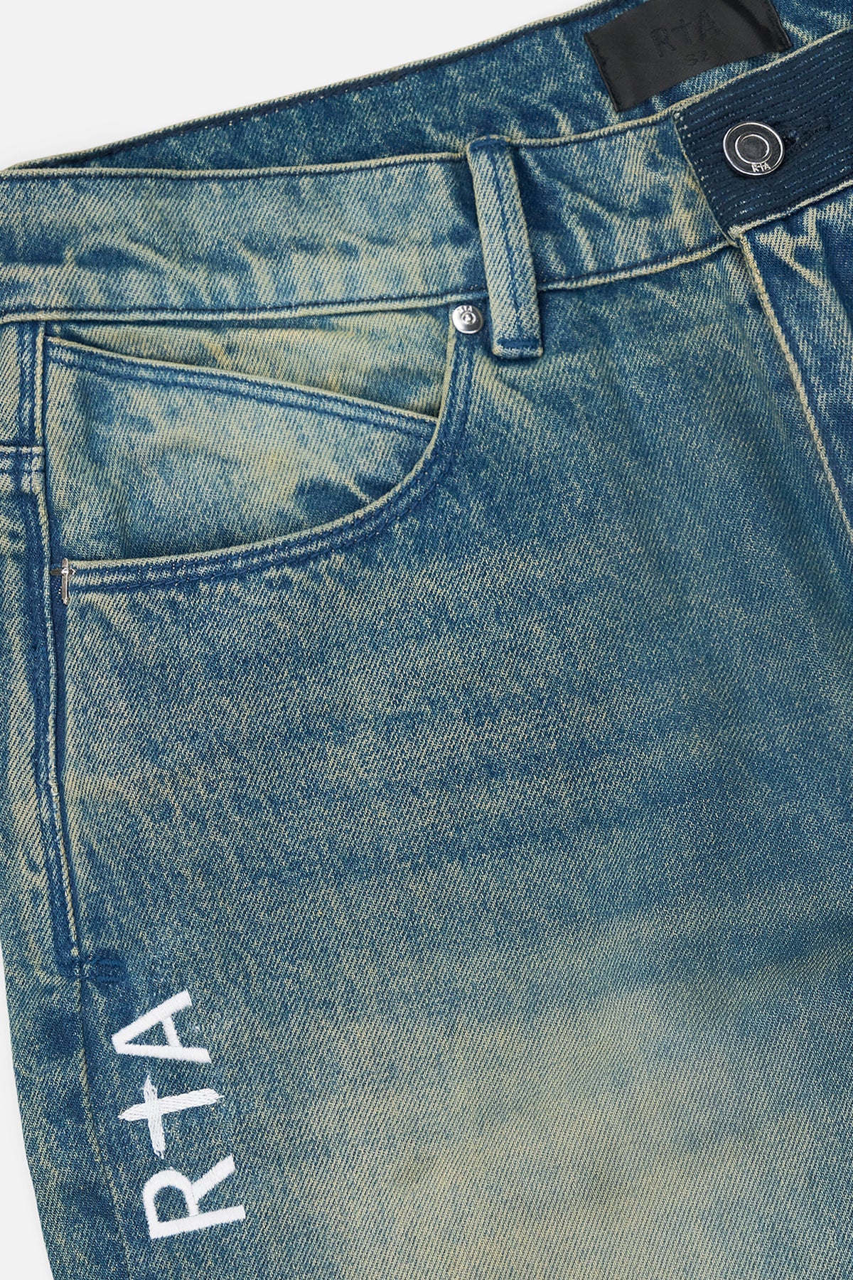 The Jonas Straight Leg Jean in Blue Mineral is made from premium denim, designed with a mineral blue wash and straight leg silhouette. These jeans feature the "RTA" logo embroidered on each side of the upper thigh, the iconic RTA cross on the back pocket, and signature leather patch on the back waistband.
