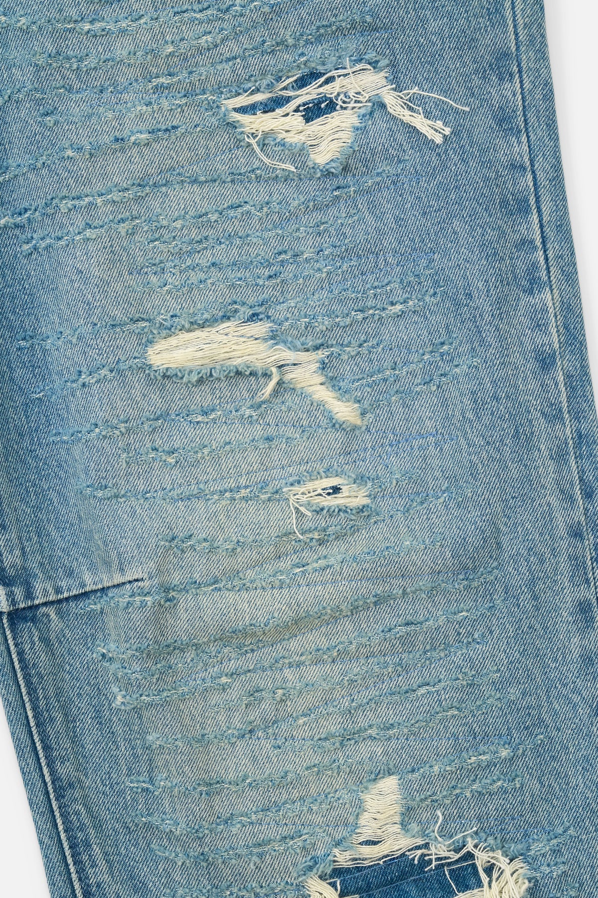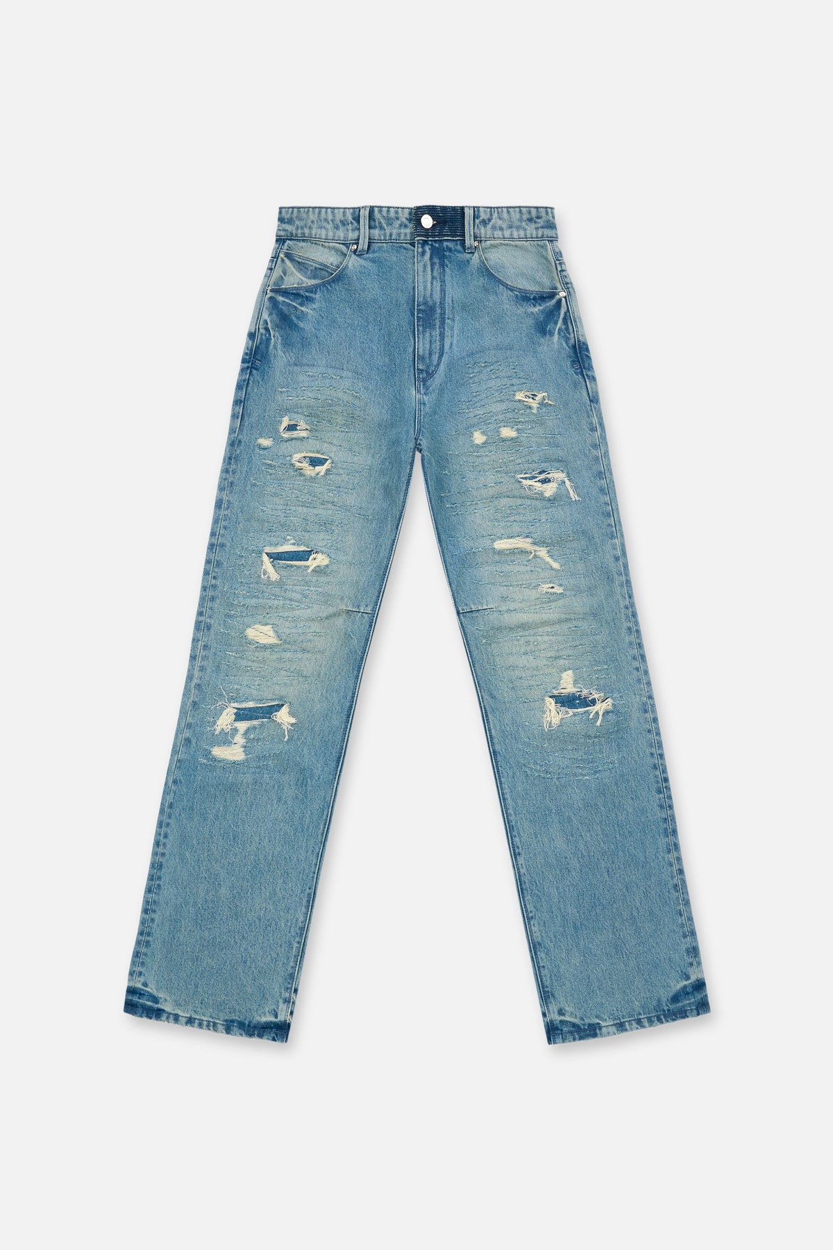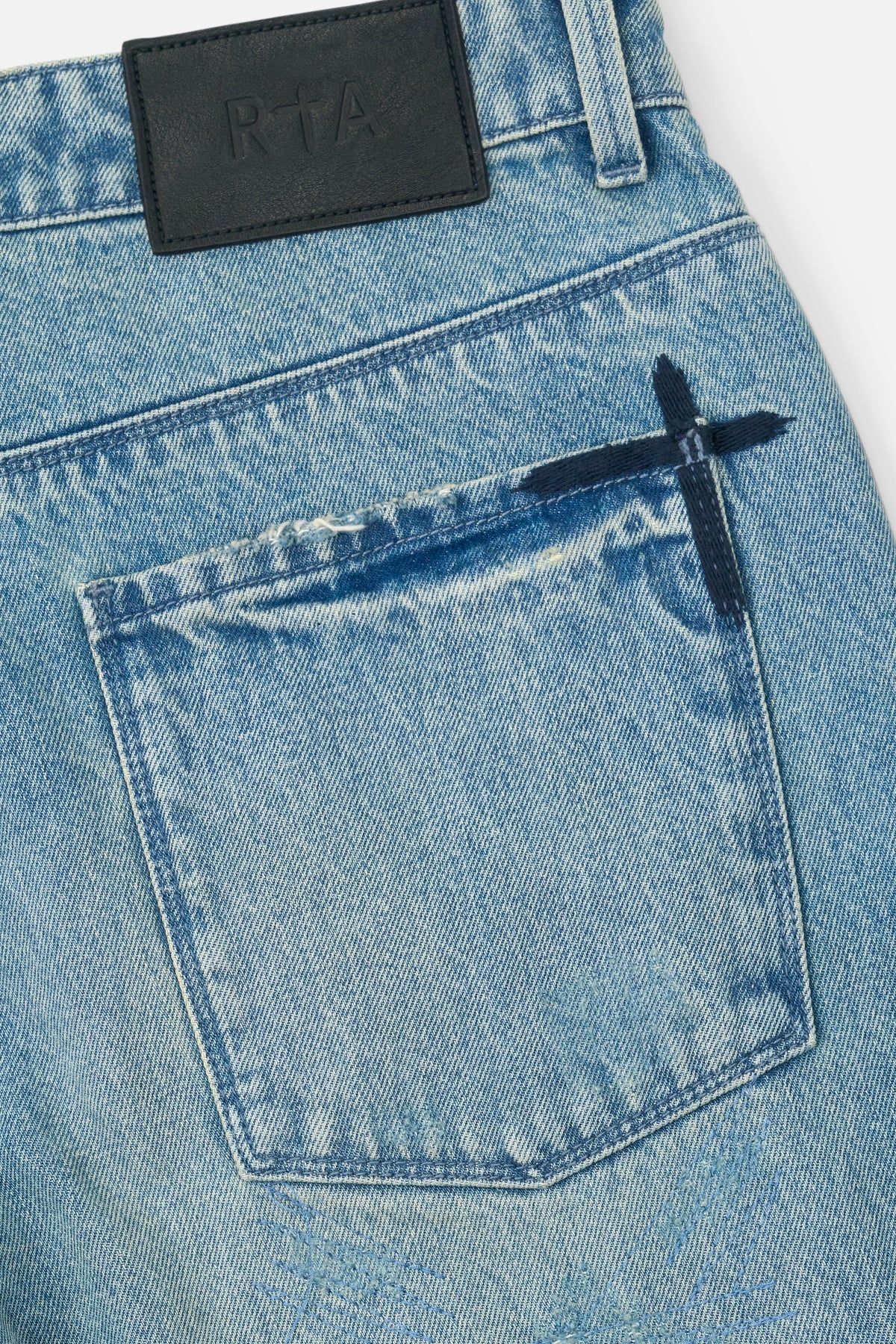 The Jonas Straight Leg Jean in Frayed Horizon is made from premium denim. Design with a straight leg fit and reinforced stitching on the inner thighs, these jeans feature distressed detailing, the iconic RTA cross along the back pocket, and signature leather patch on the back waistband.