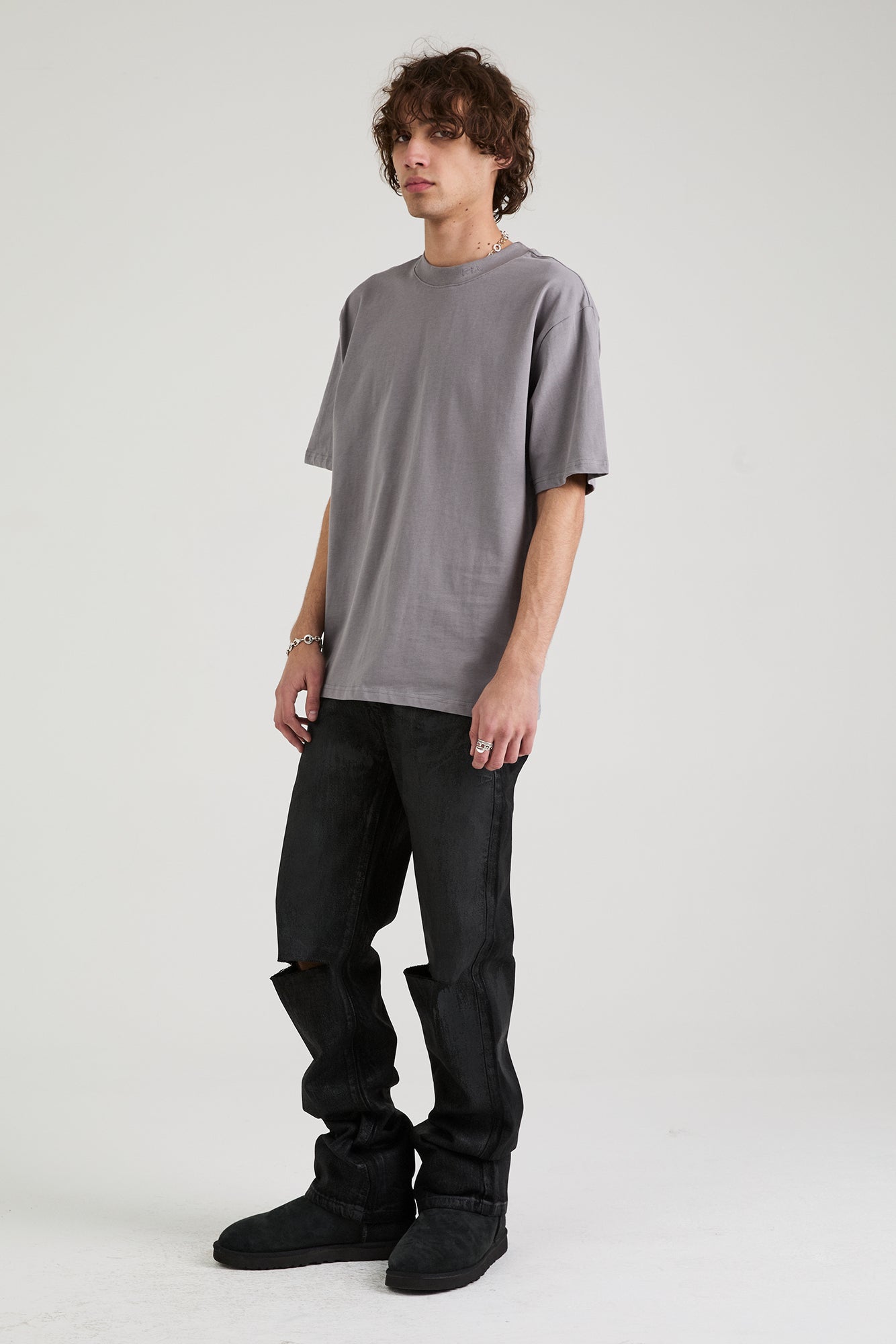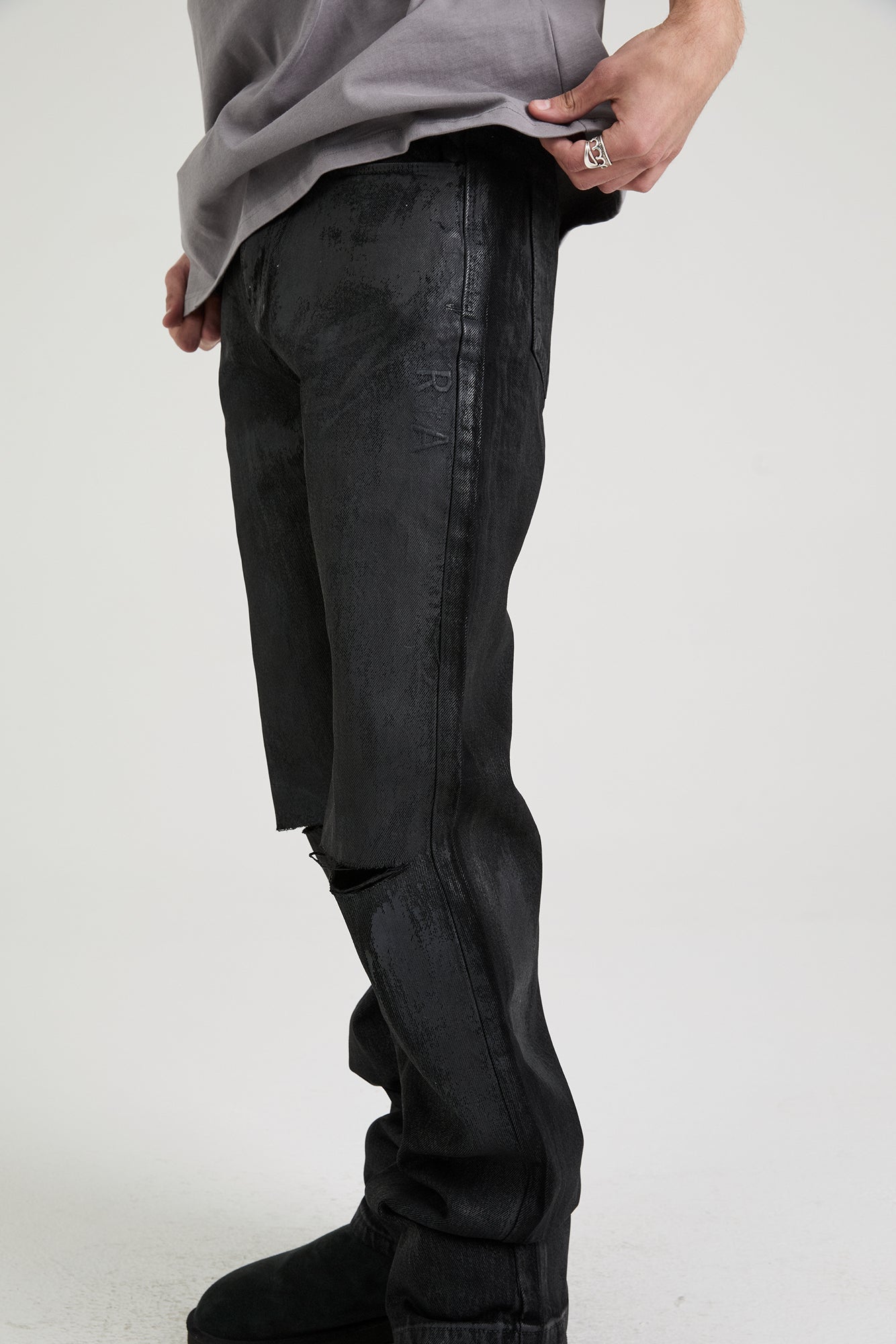 The Jonas Straight Leg Jean in Obsidian is crafted from high-quality denim. These jeans feature distressed detailing on the knees, a dark, marble wash, zip fly, button front closure, belt loops, round stitched front pockets, traditional style back pockets, the RTA logo stitched on the sides of both front pockets, and signature leather patch on the back waistband.