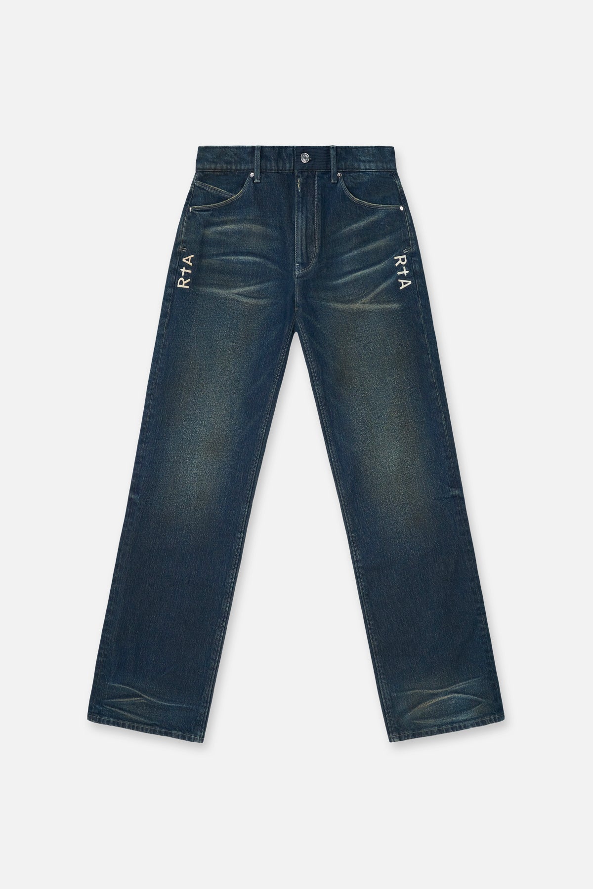 The Jonas Straight Leg Jean in Old World Blue features a zip fly, button front closure, the RTA logo stitched on the sides of both pockets, and a silver cross emblem on the corner of the front pocket. This jean is finished with a dark blue, vintage wash.