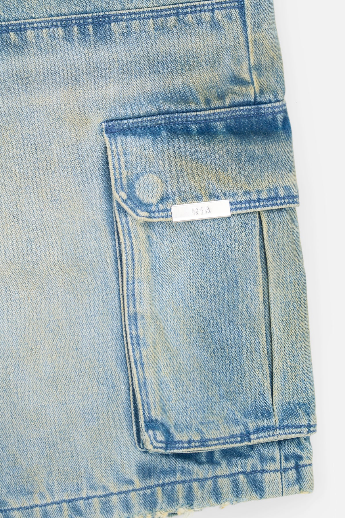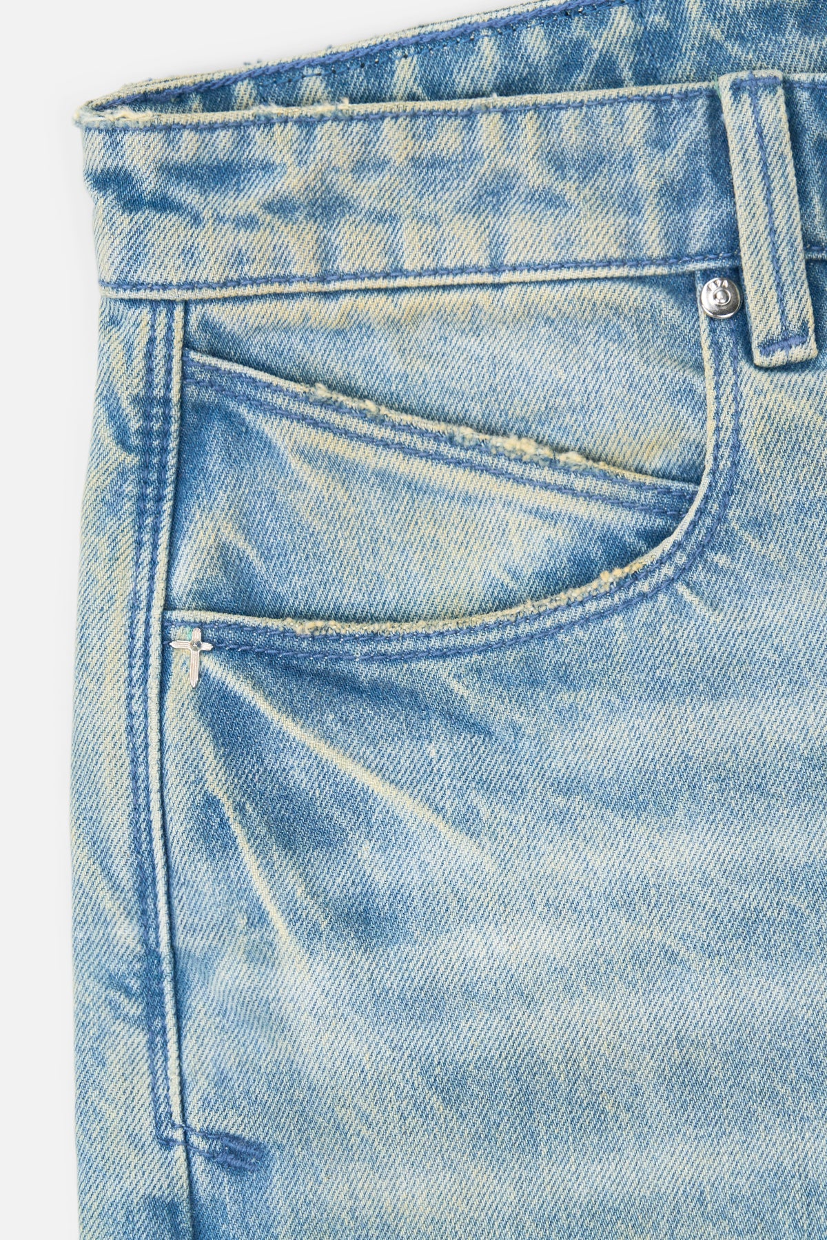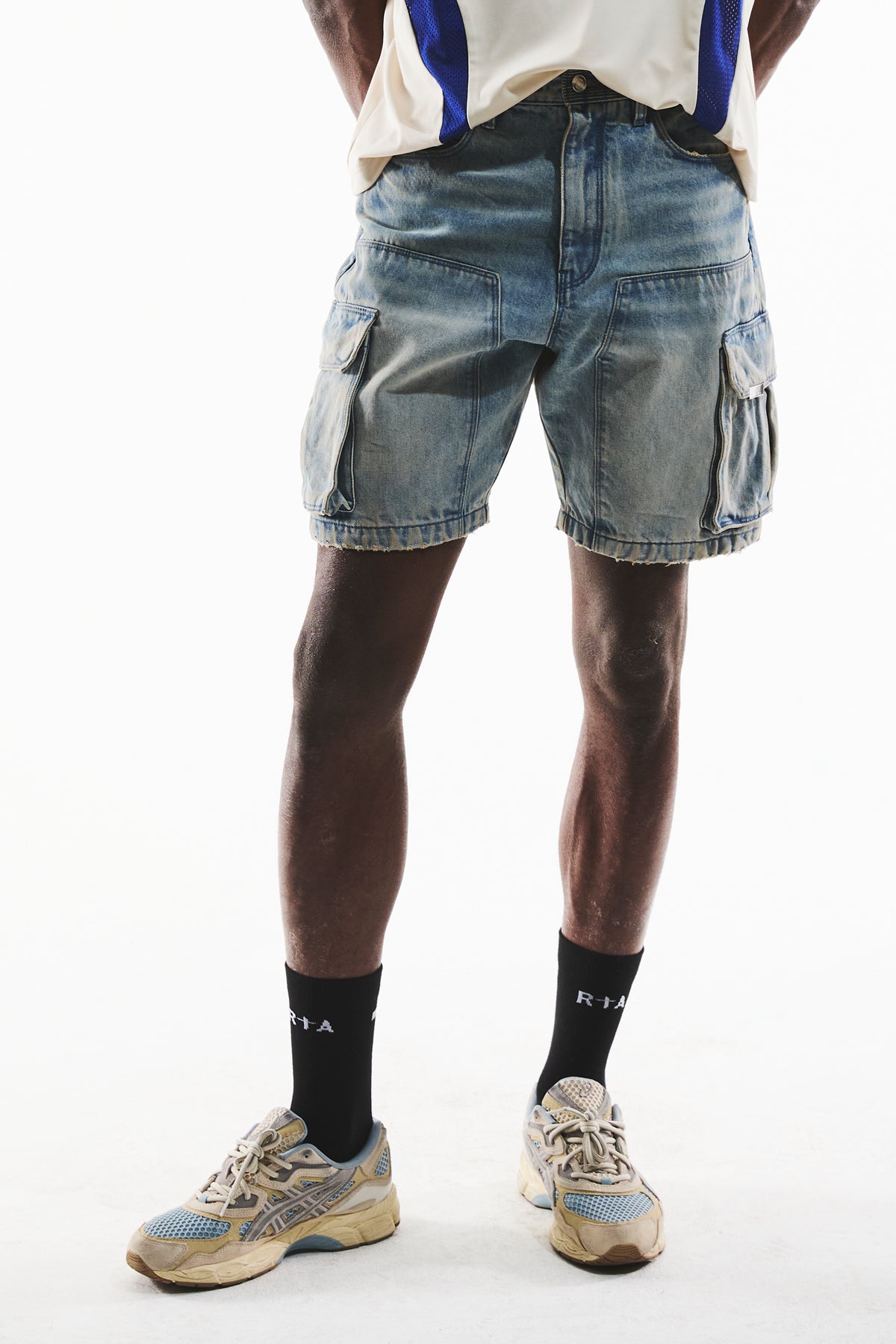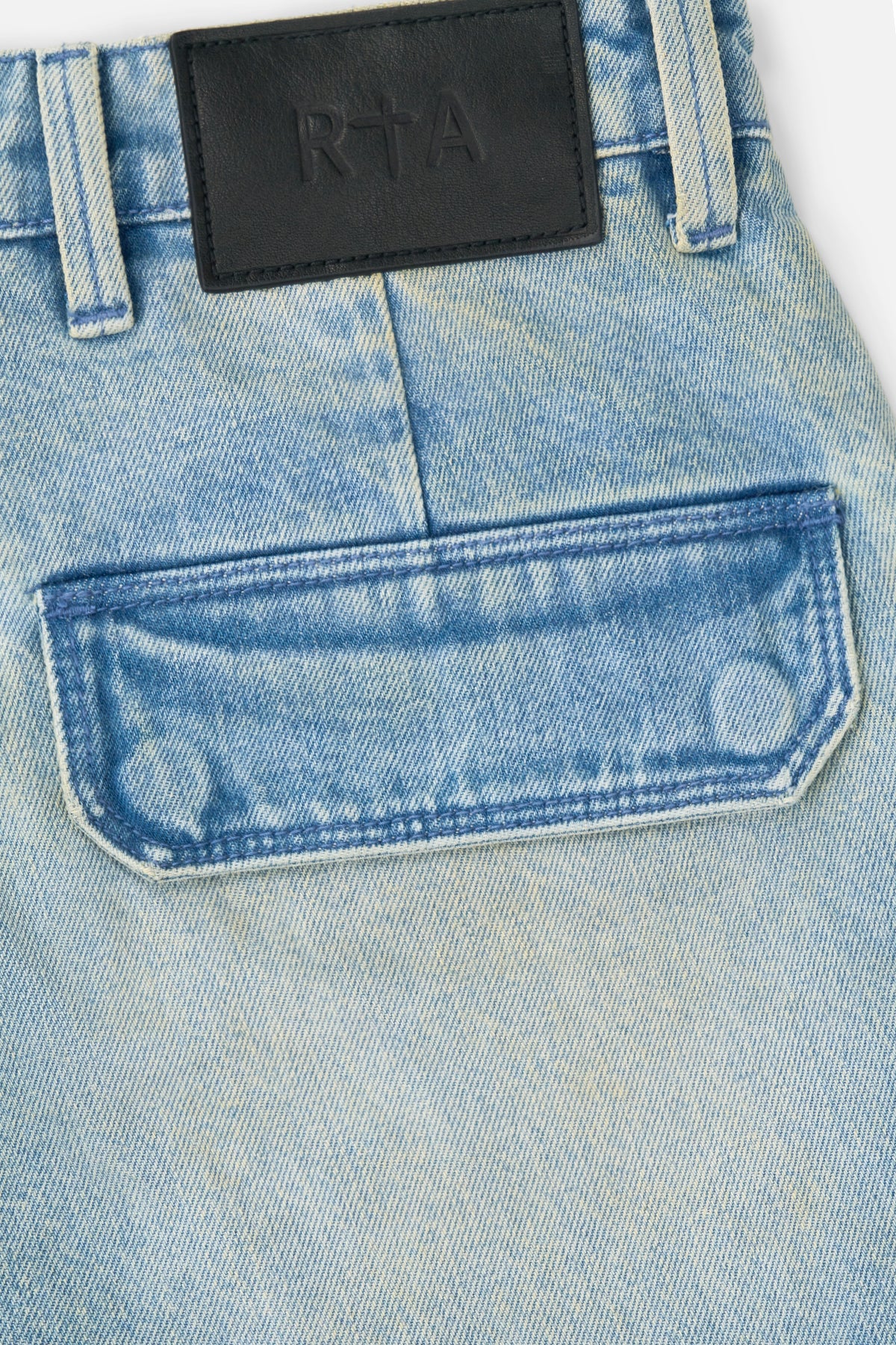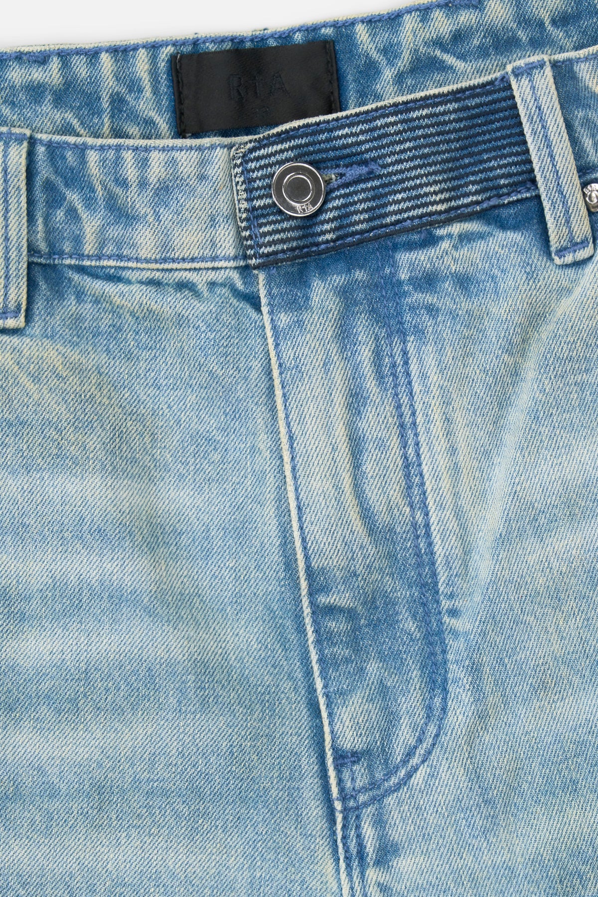 The Joseph Short in Frayed Indigo Dusk is made from premium denim designed with distressed detailing and a faded wash. These shorts feature the RTA logo embroidered on each side of the upper thigh, the iconic RTA cross on the back pocket, and signature leather patch on the back waistband.