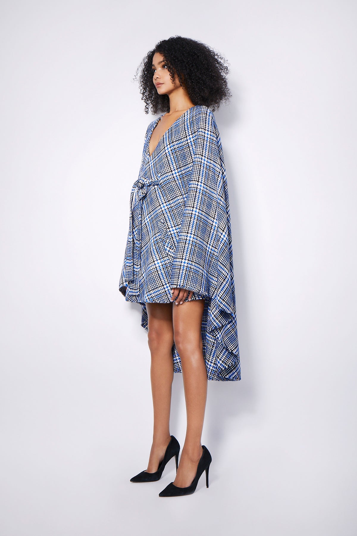 The RTA Karlie Coat in Blue Plaid is a wool blend wrap front poncho cape style coat with a self-tie belt, front snap button closure and two front slip pockets. Featuring a high low hem and can be worn as a dress. Made in a premium Italian fabric.