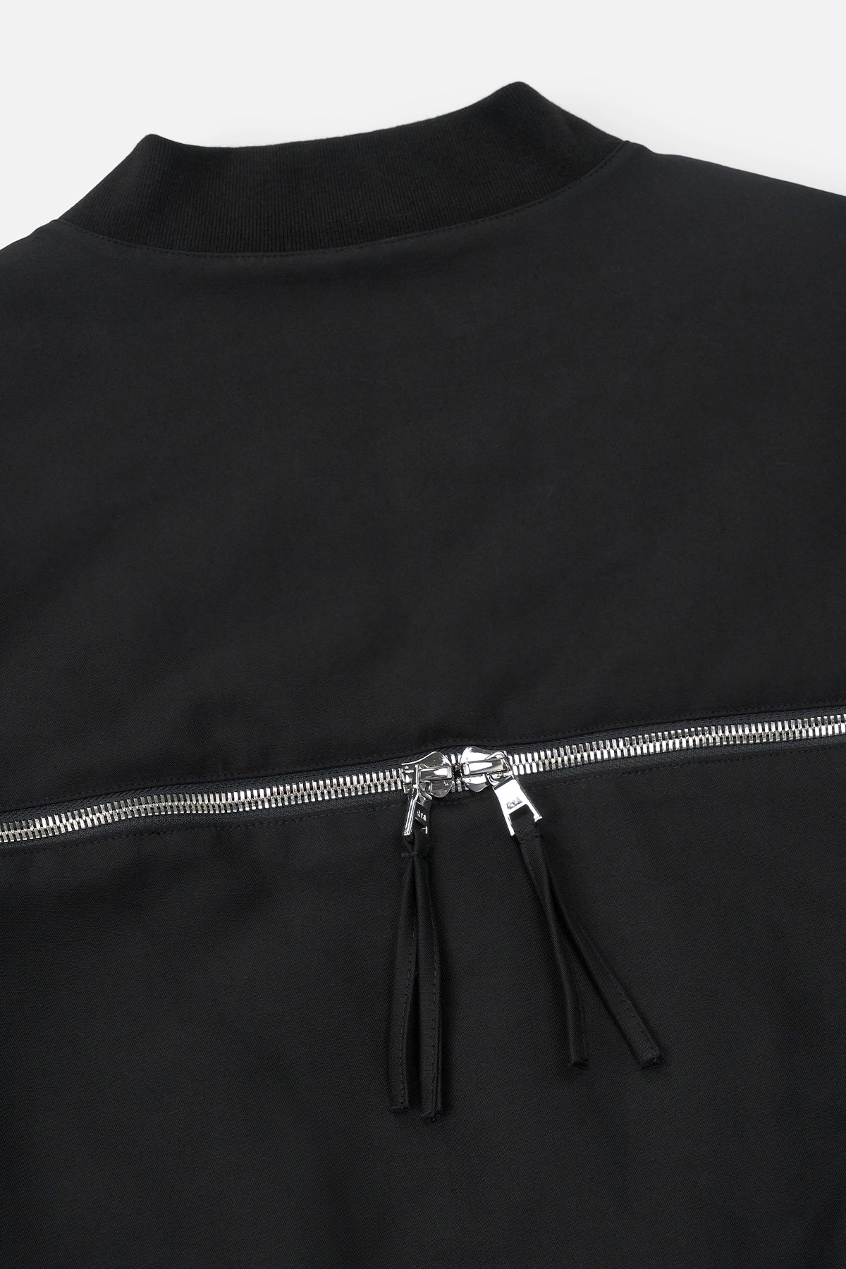 The Kayden Jacket in Black is a bomber style jacket made from 100% Cotton. This jacket features a triple cross motif on the chest, classic ribbed collar, cuffs, and hem, zip front closure, flap pockets with snap closures, and a two-way zipper detail across the back.