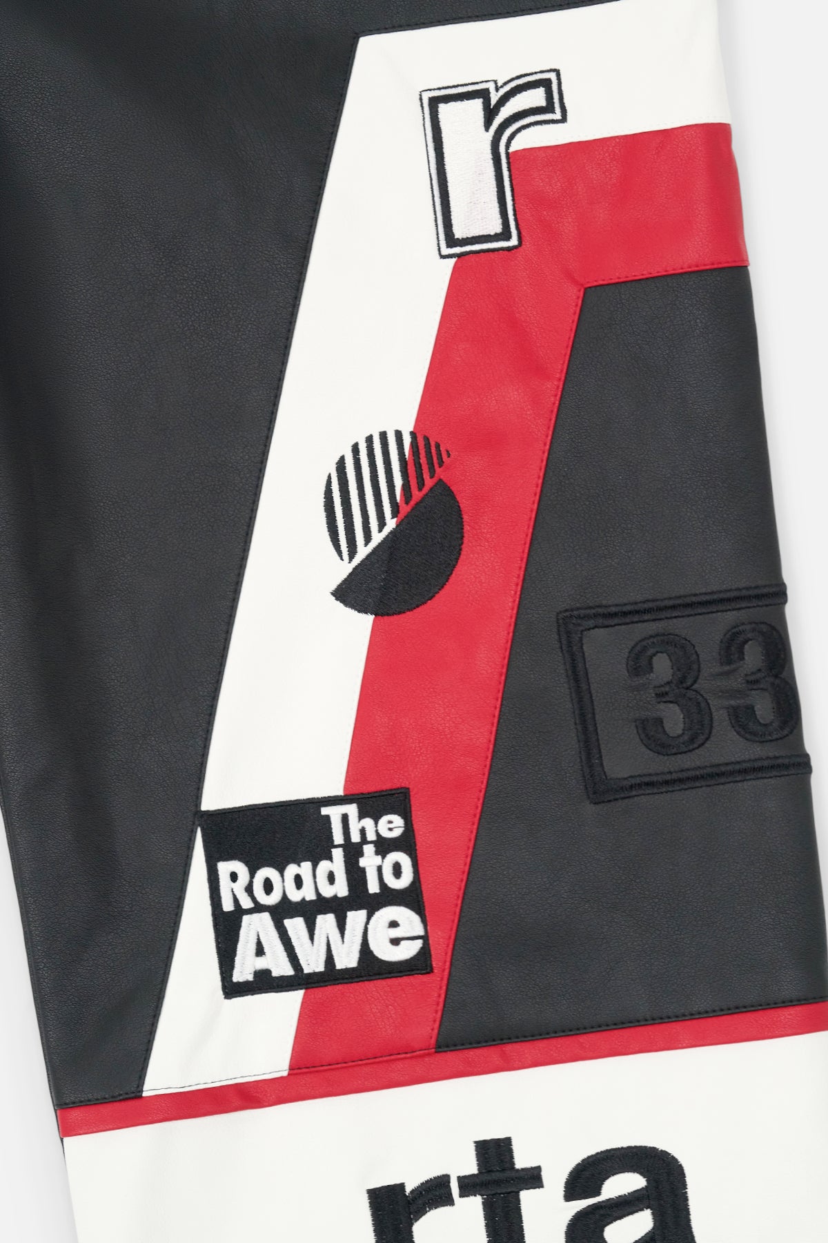 The Kian Moto Pant in Black White Motorsports is made from premium eco-leather designed with a straight leg fit. These pants feature engineered seaming and bold graphic hits throughout. The front and sides are finished with high-contrast racing patches and applique work, classic zip-fly closure, and functional pocket detailing.
