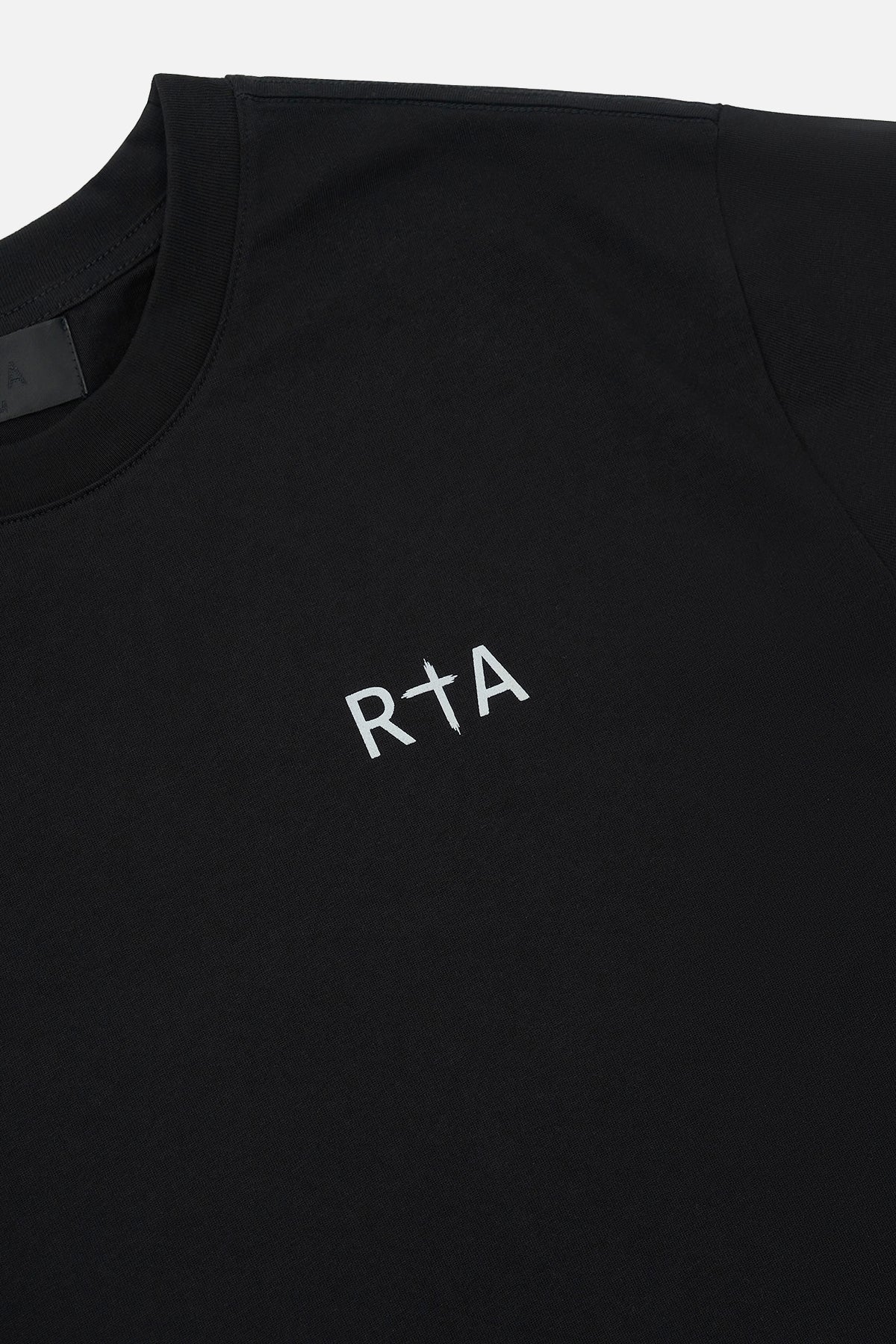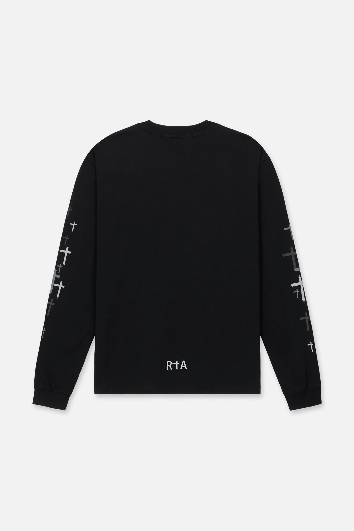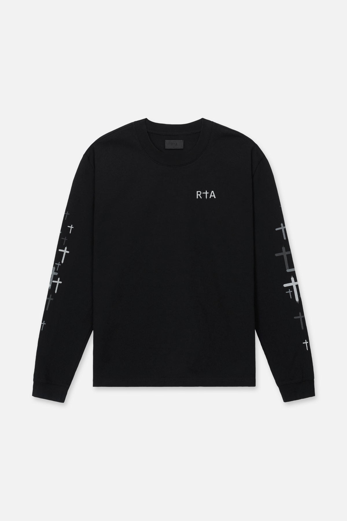 The Lawrence Long Sleeve Tee in Black Crosses is a crew neck, long sleeve tee made from 100% Cotton. This tee features the classic RtA logo on the chest, cross motifs on each arm, and RtA logo on the lower back.