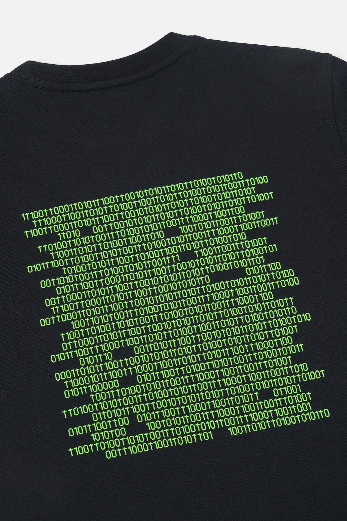 The Lawson Short Sleeve Tee in Black Binary Logo is a short sleeve tee made from 100% Cotton featuring a glitch strip RtA logo across the chest and binary code inspired graphic on the back.