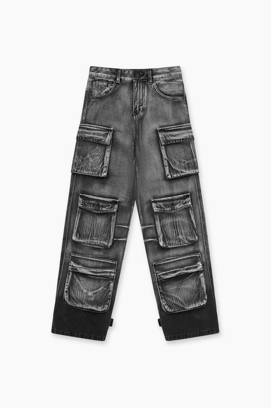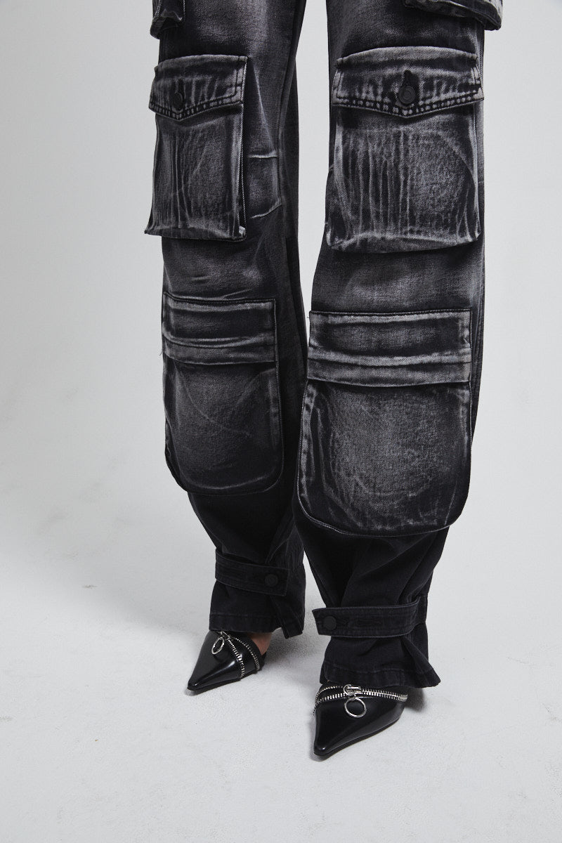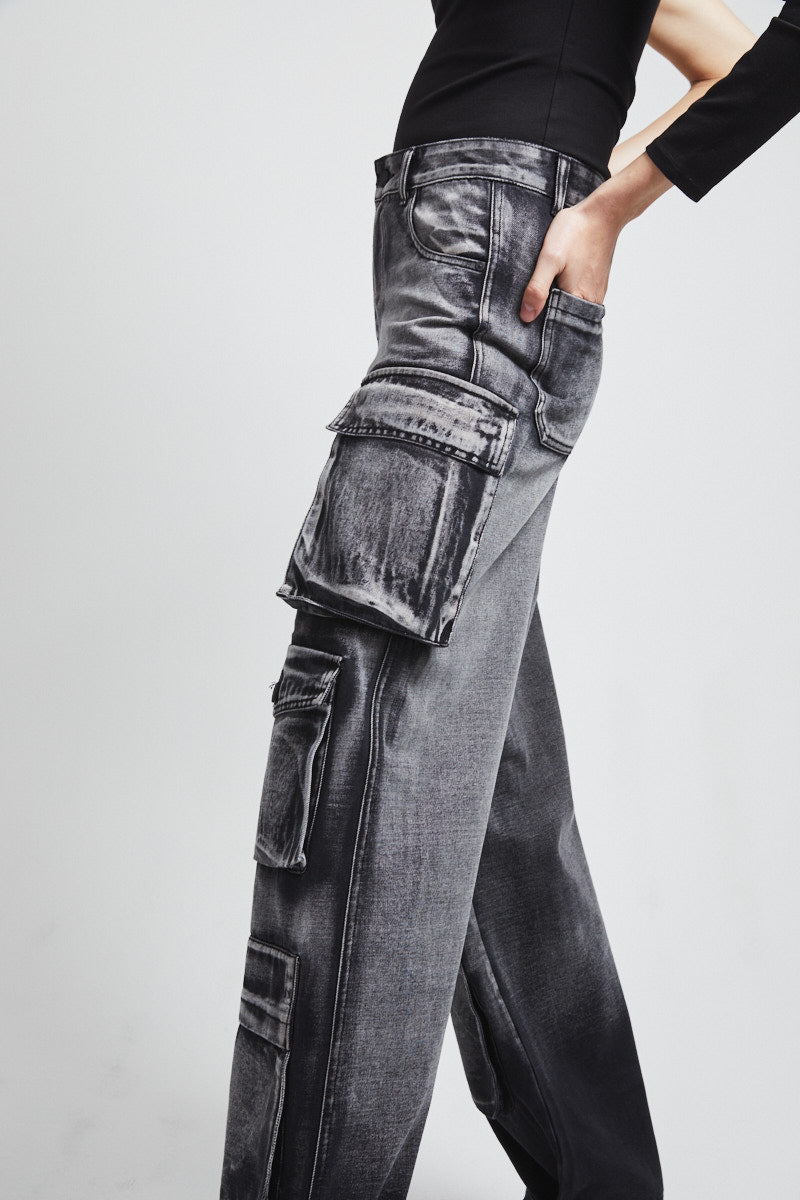 The Lea Jean in Charcoal Smoke features a zip fly, button front closure, utility style front pockets, back pockets, and snap closures at the hems.