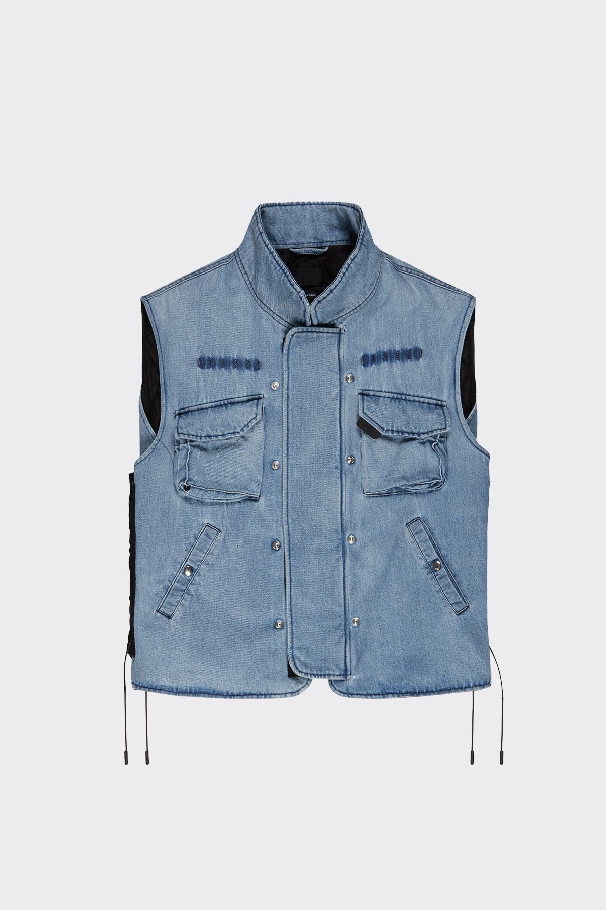 The RtA Lee Vest in Blue Grotto is a denim vest with cargo pockets, stand collar and snap buttons. This vest features lace-up sides with elastic cord drawstrings and logo engraved aglets.