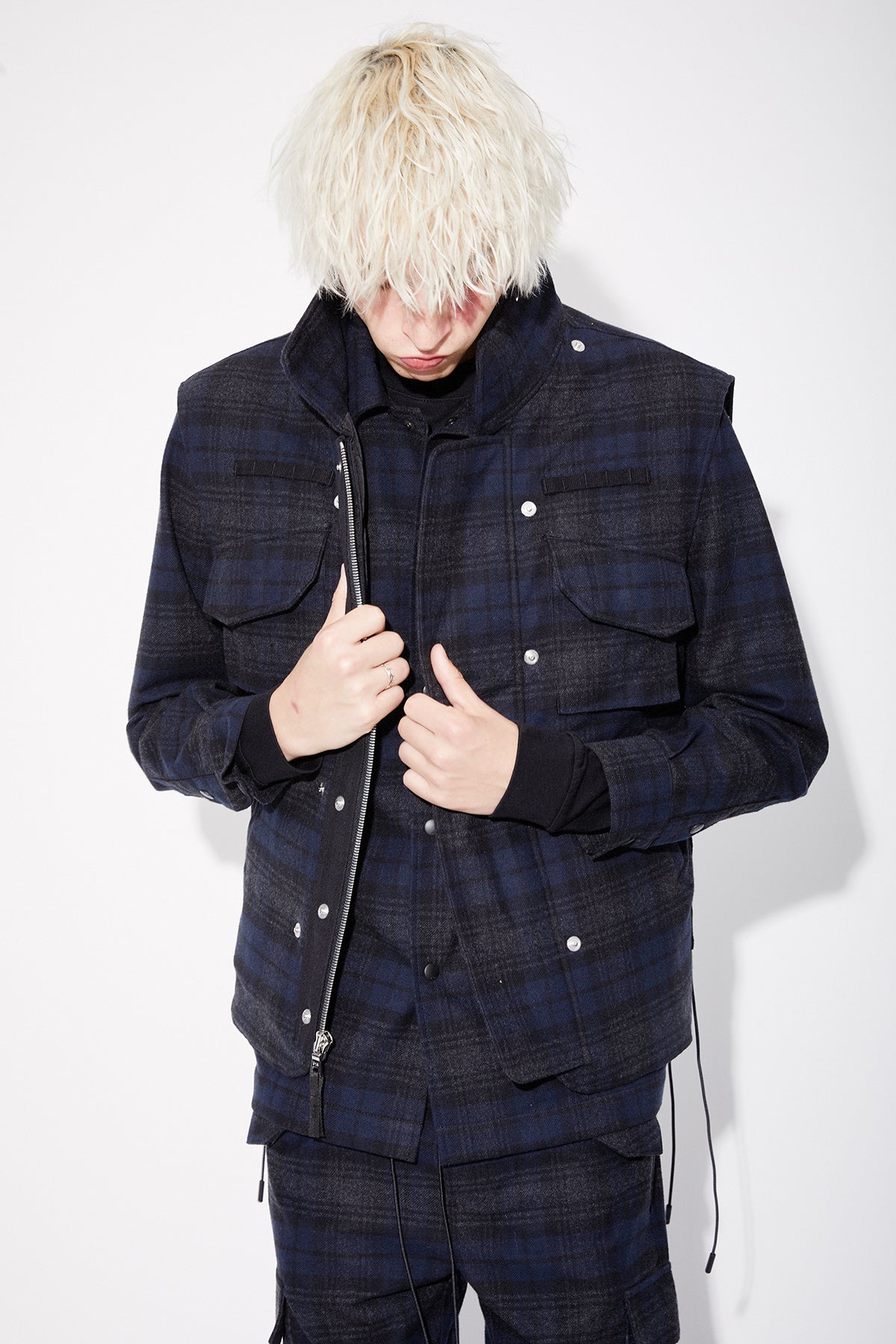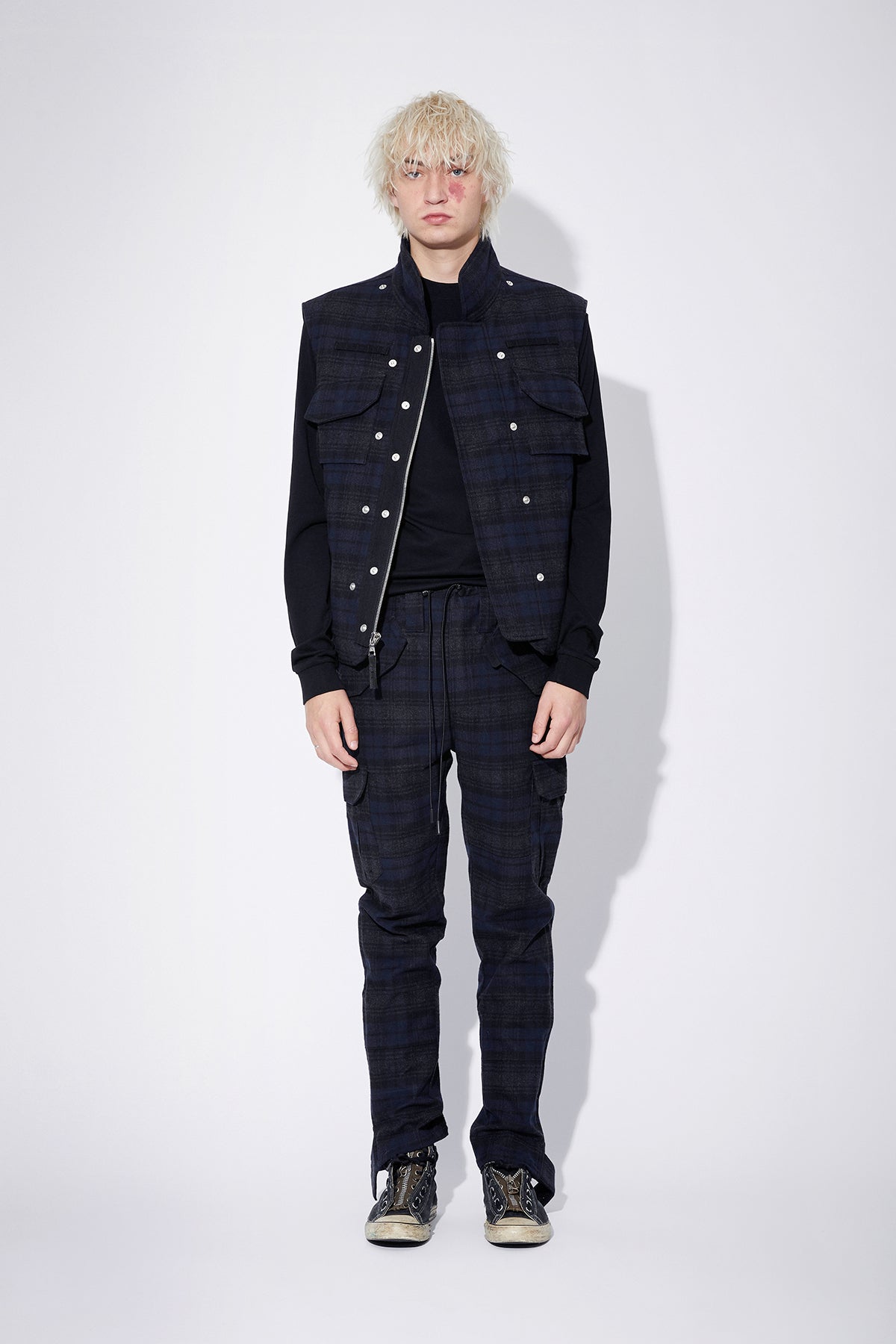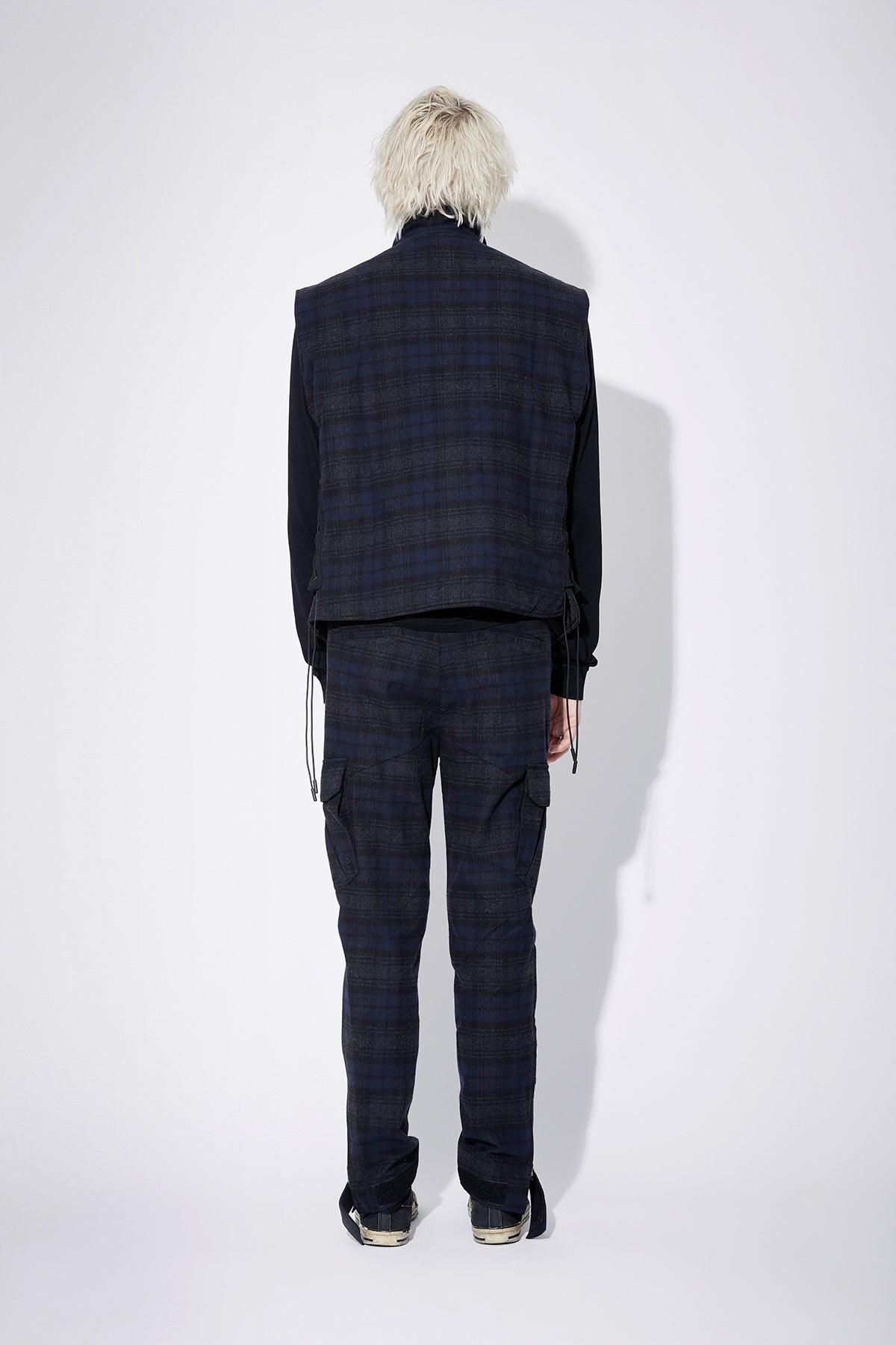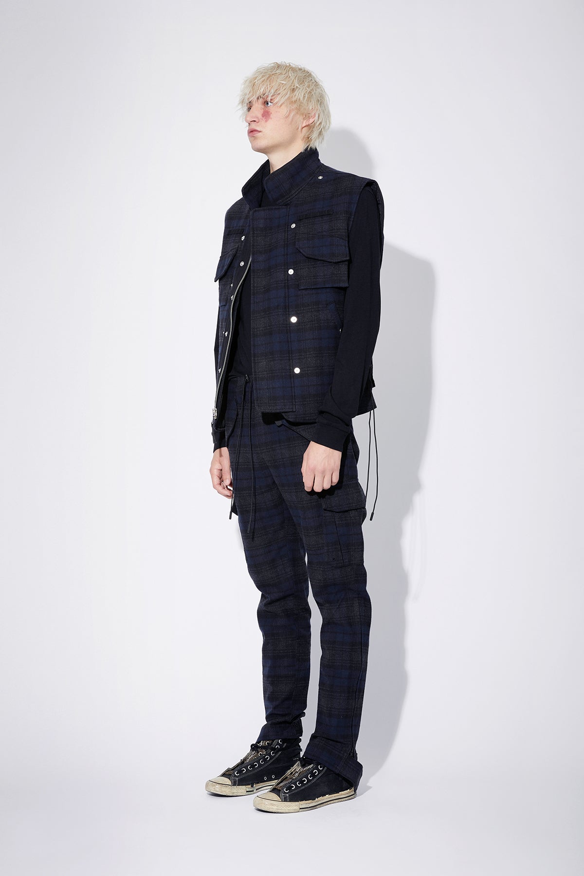 The RTA Lee Vest in Navy Plaid is a woven vest with cargo pockets, a stand collar and snap buttons. Crafted in a premium Italian fabric, it showcases lace up sides with elastic cord drawstrings with logo engraved aglets and RTA logo twill zipper pull tabs.