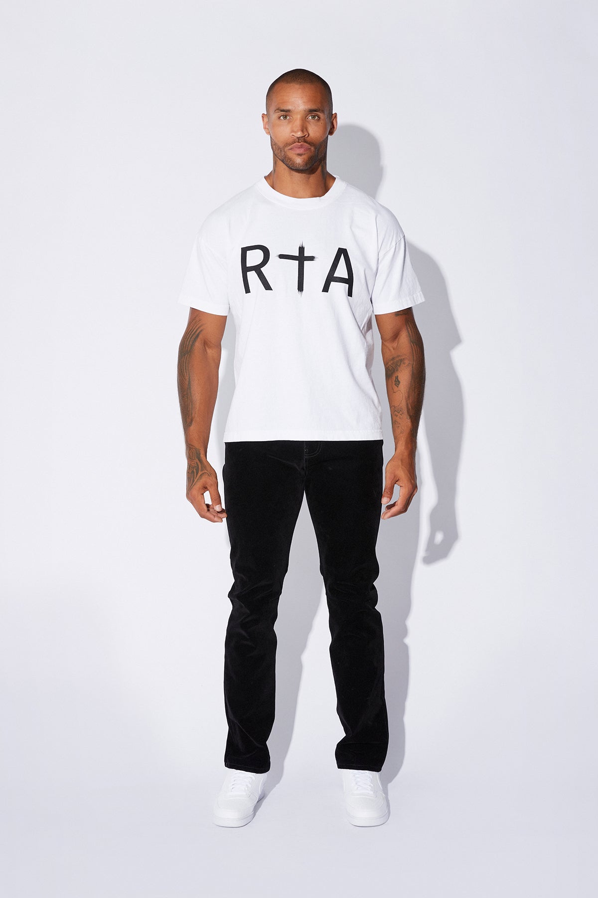 The RTA Liam Tee in White Front Logo is a cotton crewneck t-shirt with a black RTA logo across the chest.