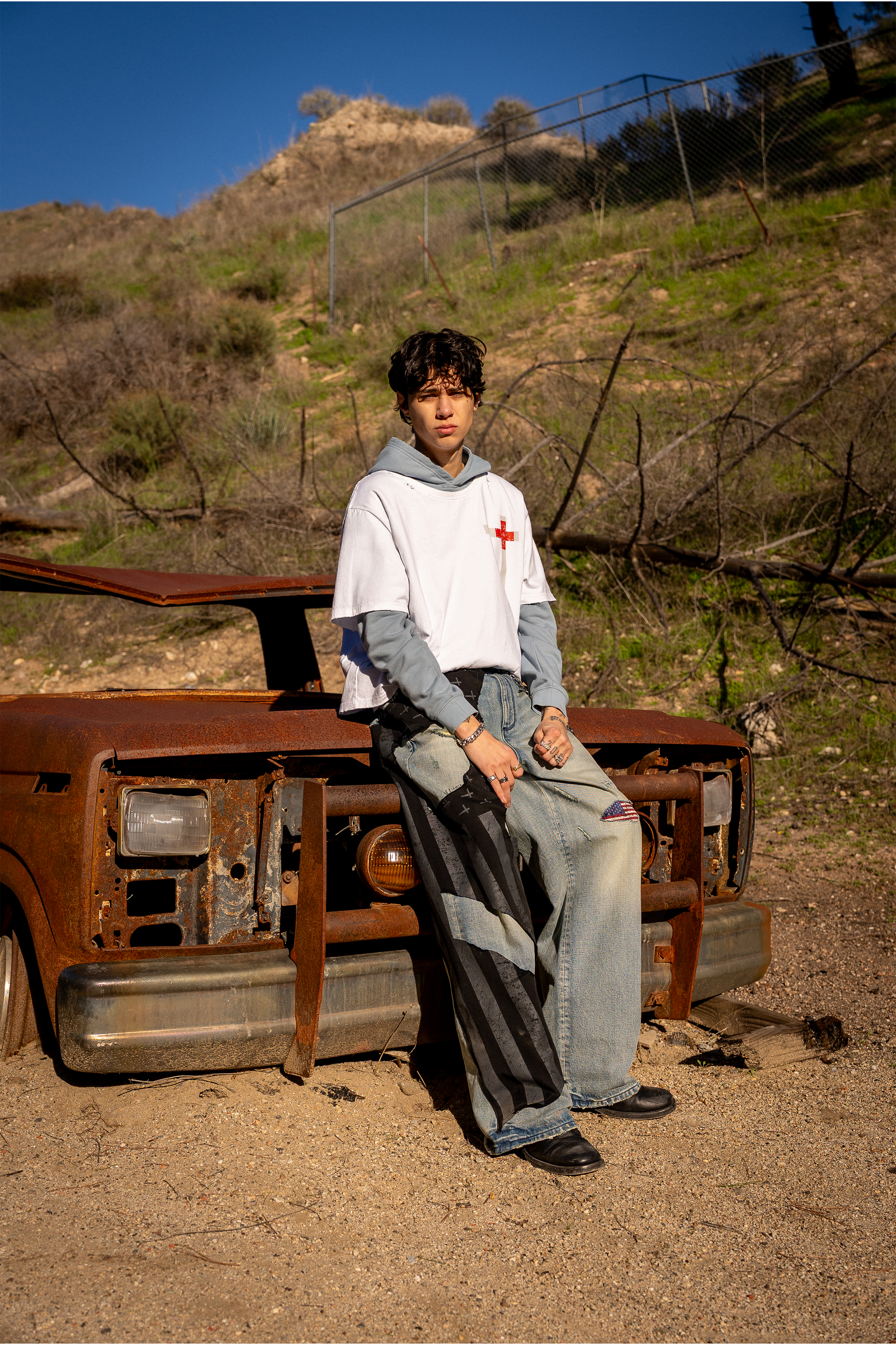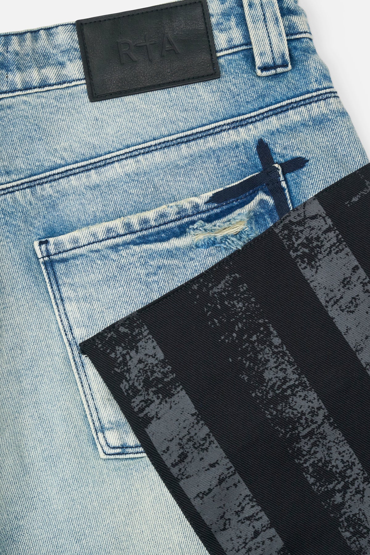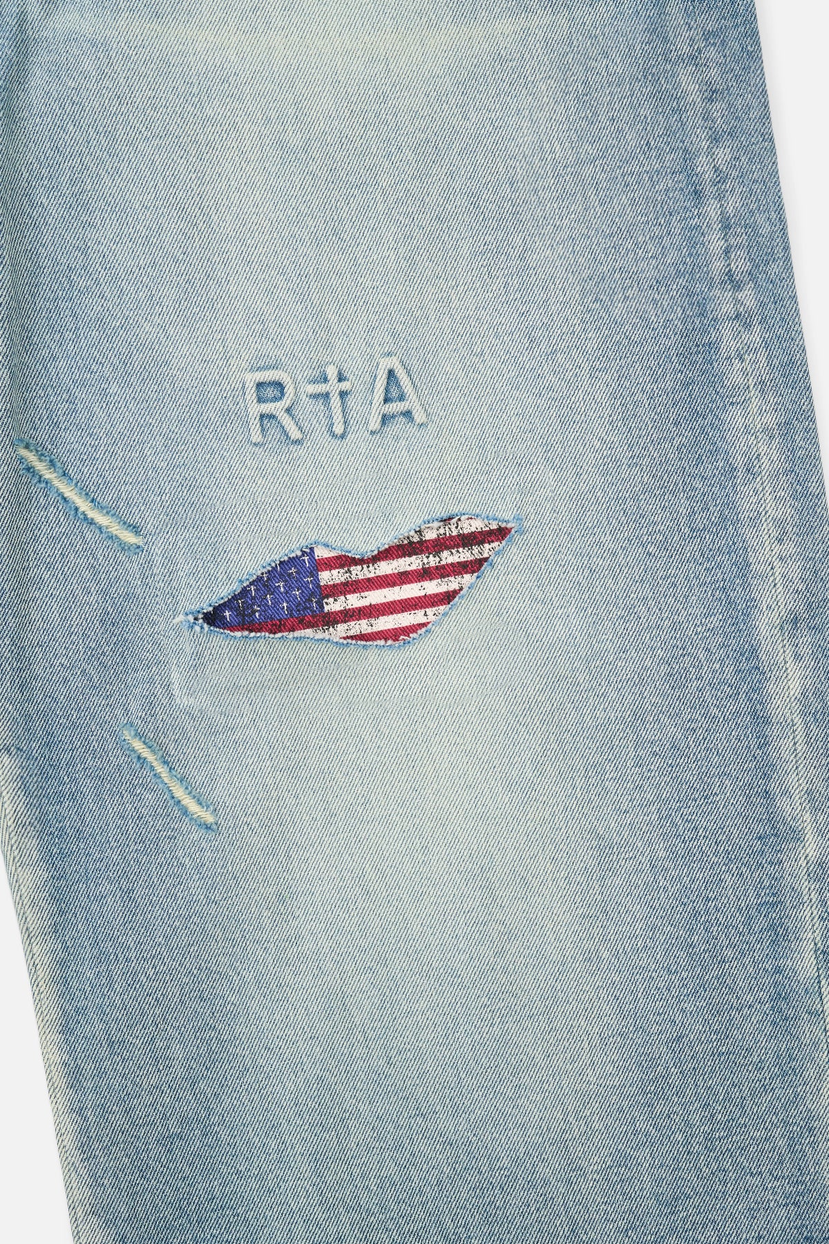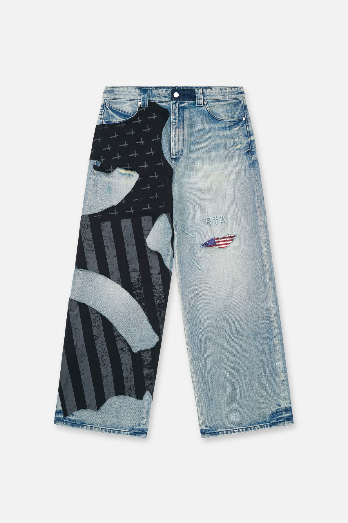 From our exclusive collaboration with Landon Barker, the Lior Wide Leg Jean in Indigo Frayed Leg is made from premium denim. Designed with a wide-leg silhouette, these jeans feature a mixed-wash design, distressed patchwork, cross motifs, an American flag appliqué, and an embossed RtA logo.