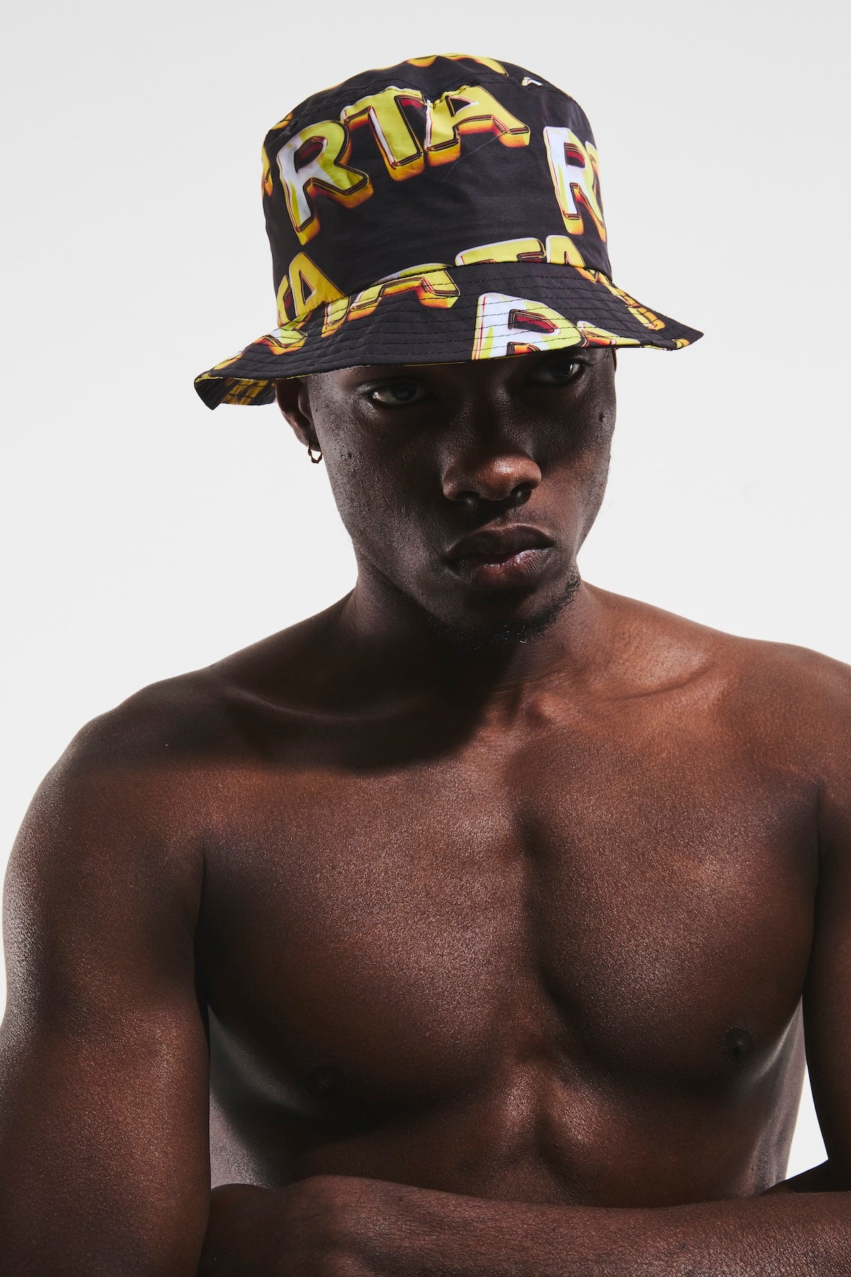 The Markus Bucket Hat in Black RTA Bullion is made from 100% Nylon, designed with a classic silhouette an all over RTA logo in a metallic gold gradient and a 3D effect, designed to resemble the look of gold bars.