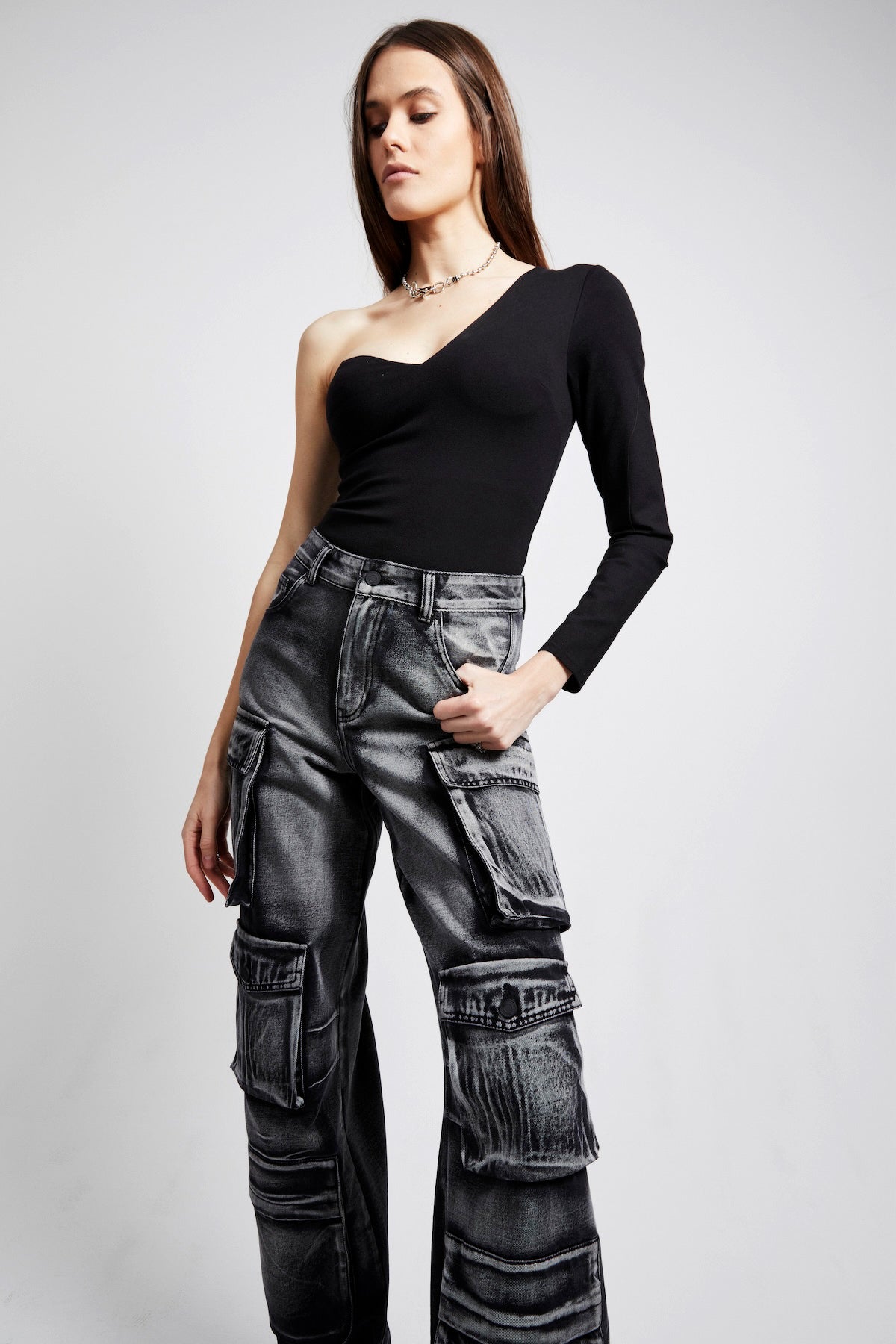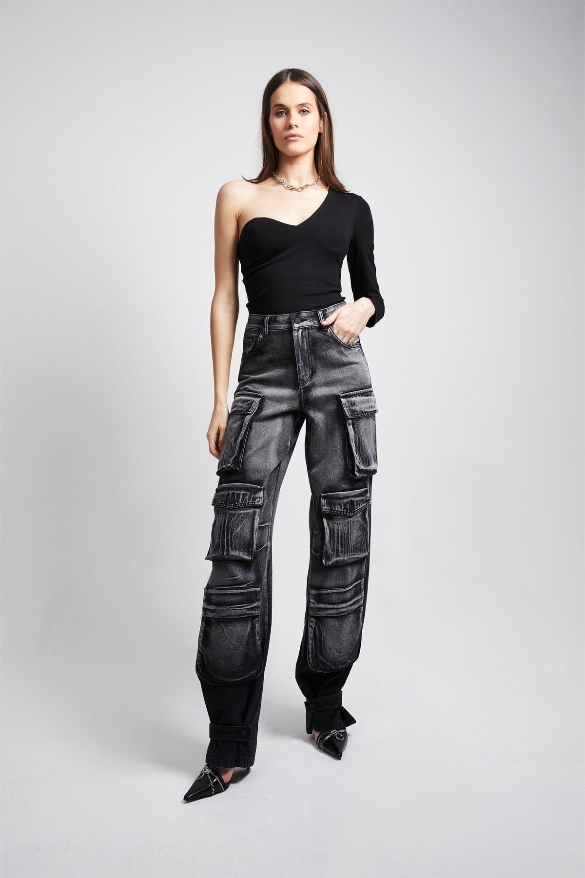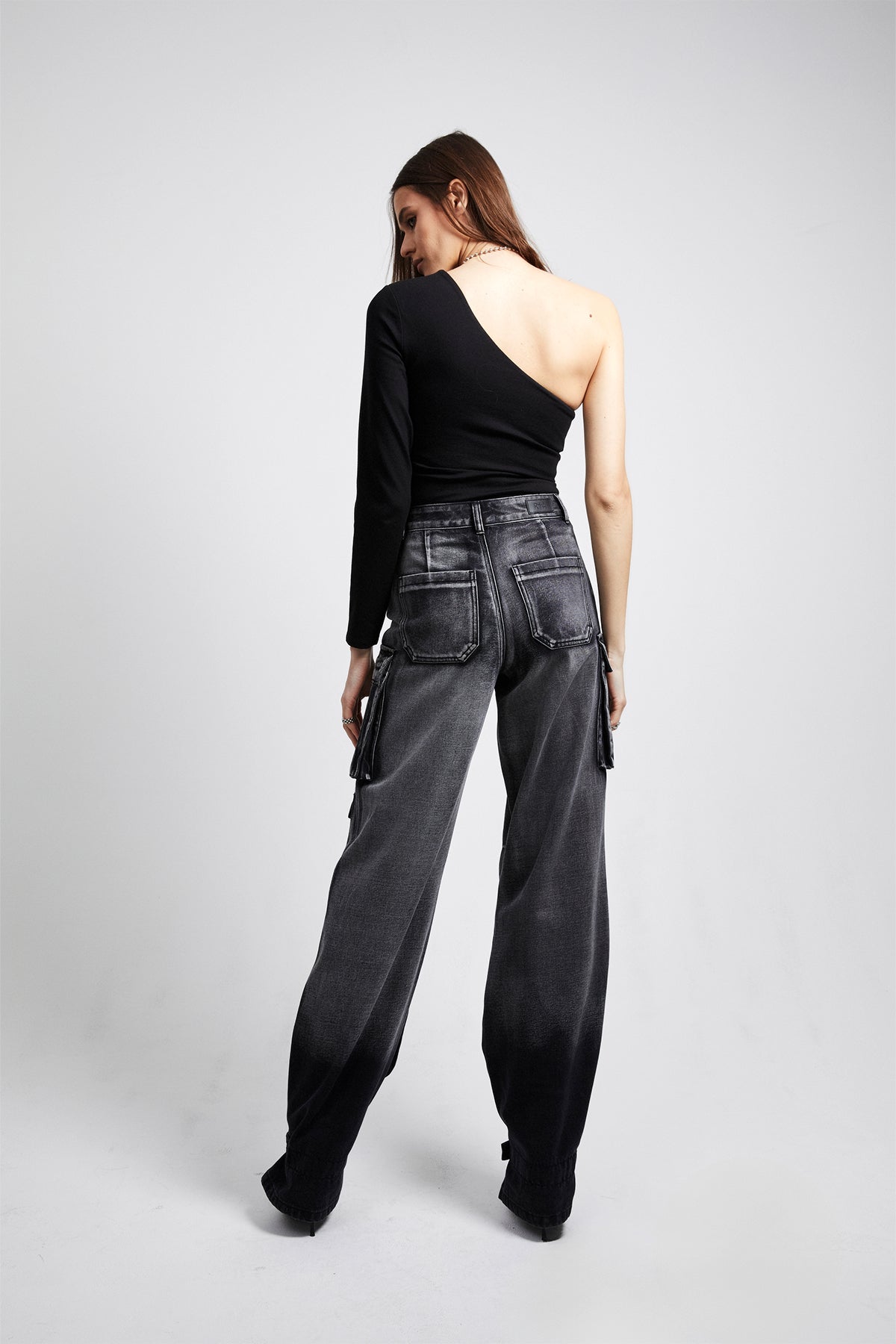 The Marin Top in Black is a one shoulder top with an asymmetrical neckline, perfect to dress up or down. Pair with our Lea Jean in Charcoal for the perfect look.