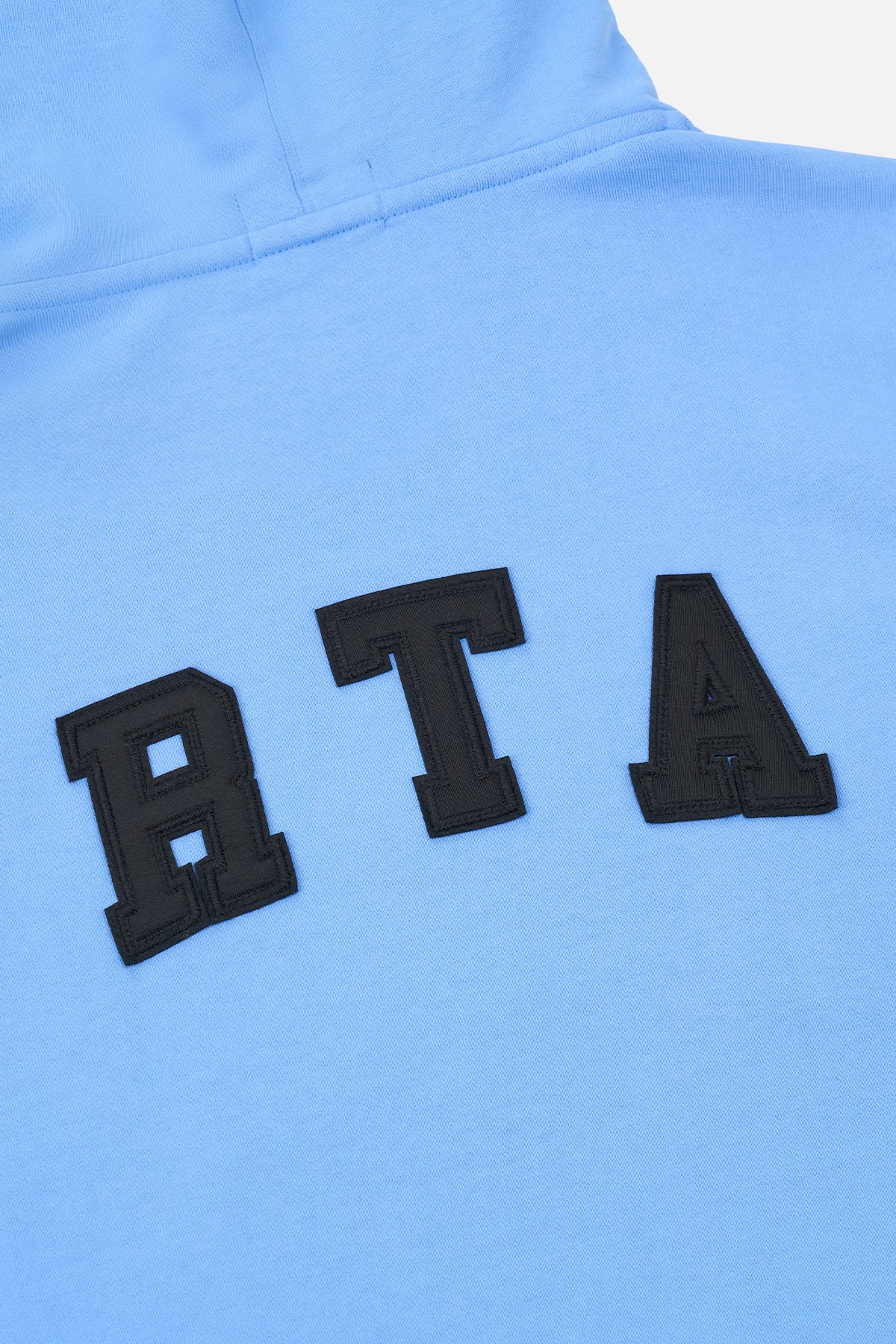 The Markus Hoodie in Blue Collegiate is made from 100% Cotton featuring, collegiate inspired RtA logo patches on the front and back, distressed detailing, and a front kangaroo pocket.