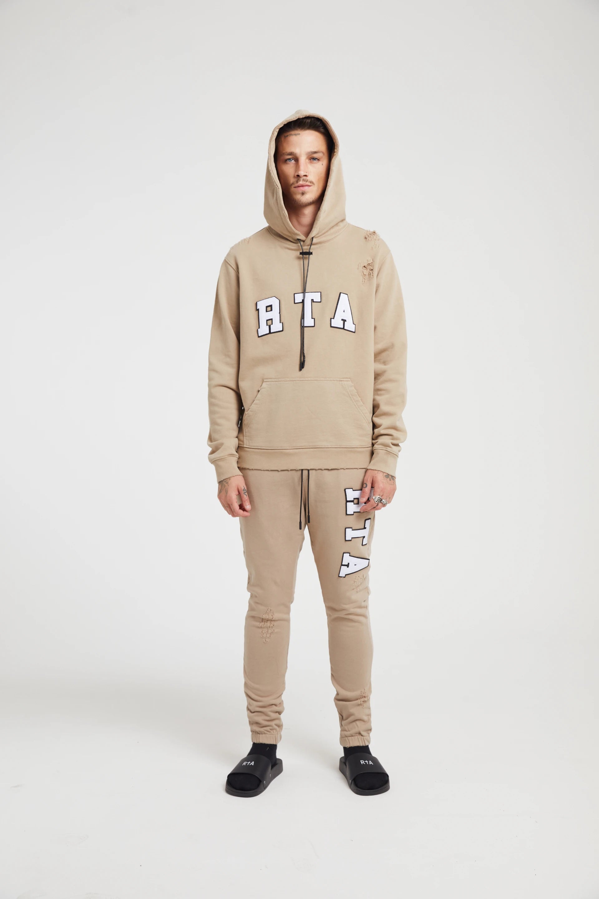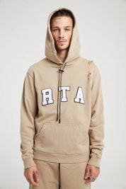The Markus Hoodie in Nude Collegiate is a classic hoodie featuring distressed details and collegiate inspired RTA logo patch detail at front with long sleeves and front kangaroo pocket.