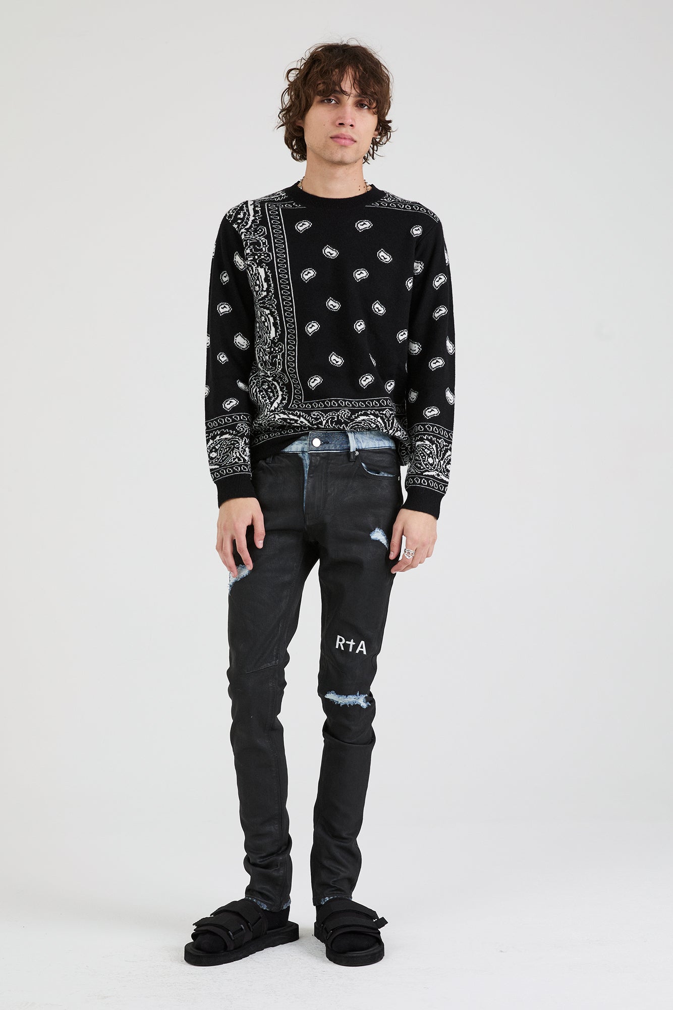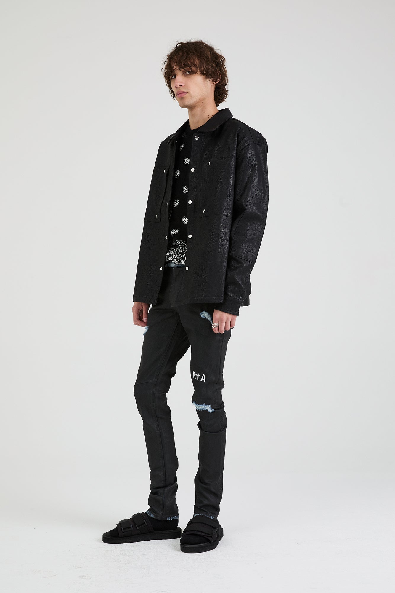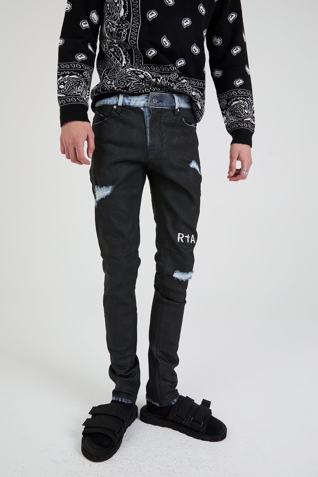 The RTA Bryant Jean is our classic skinny fit in Black Coated, blue denim with a black shiny coating. Featuring embroidered contrast RTA logo on the front knee, destroyed areas, black leather patch on back and a signature back pocket cross, these jeans are sure to stand out.