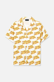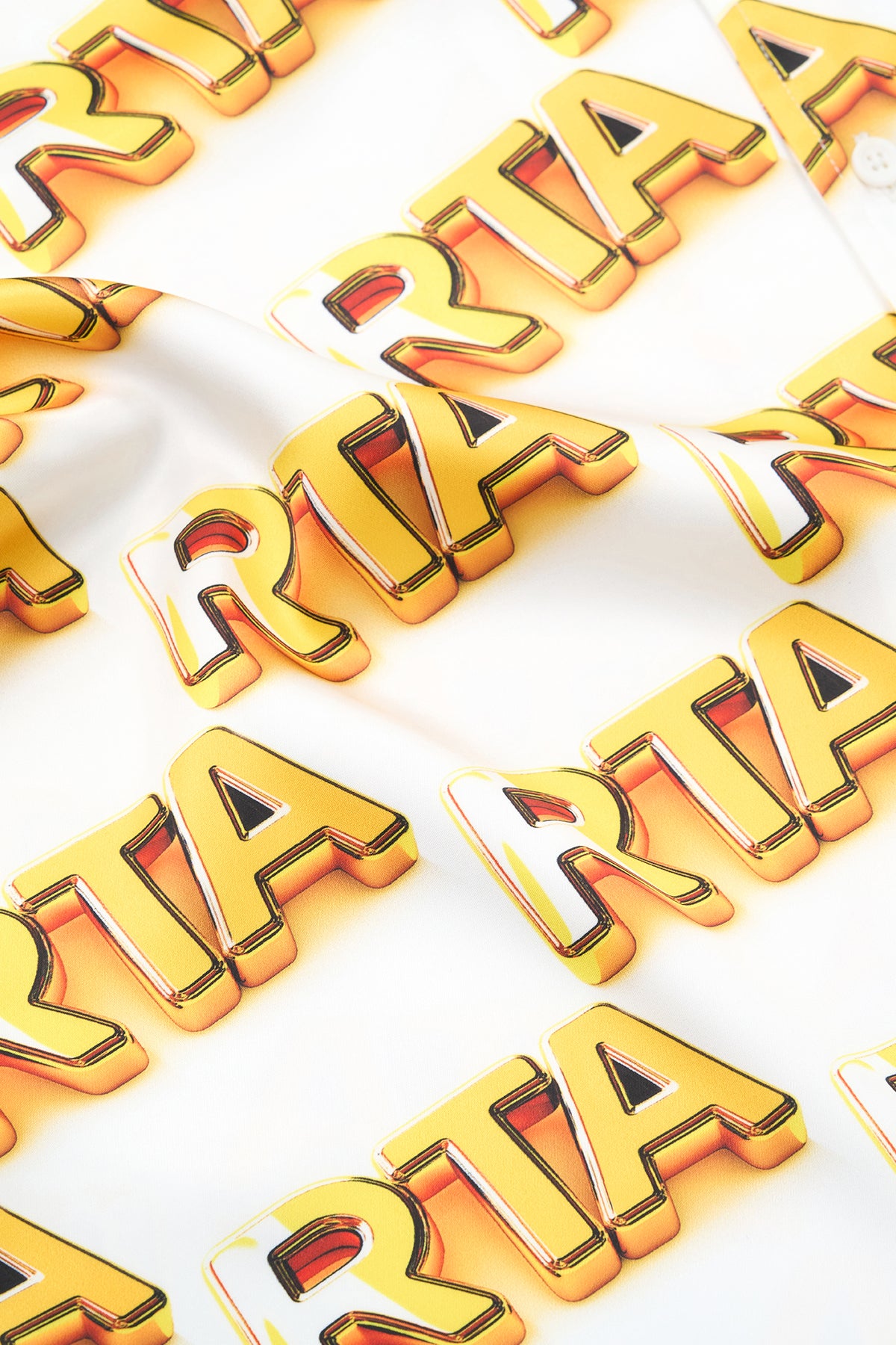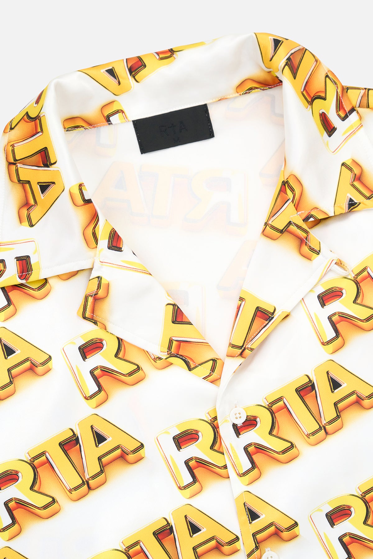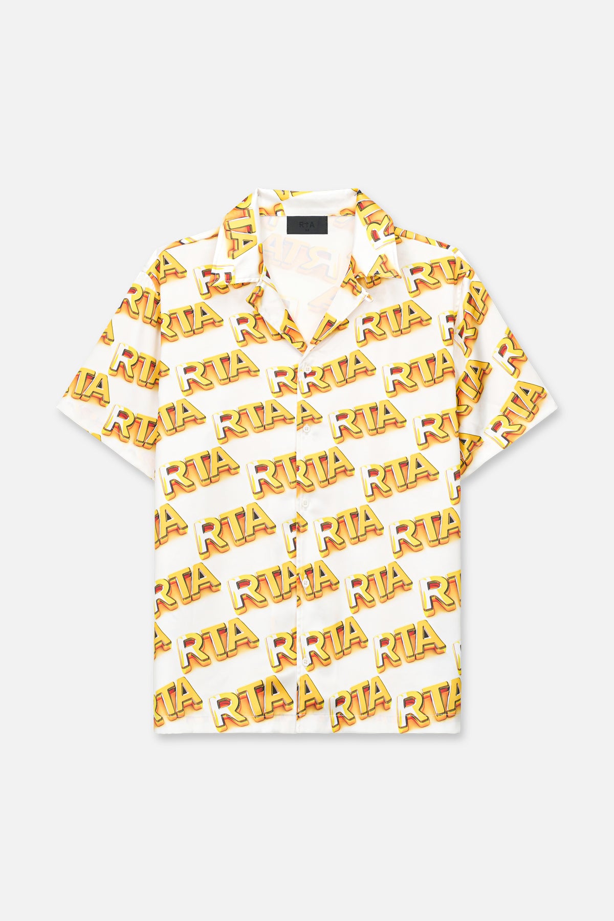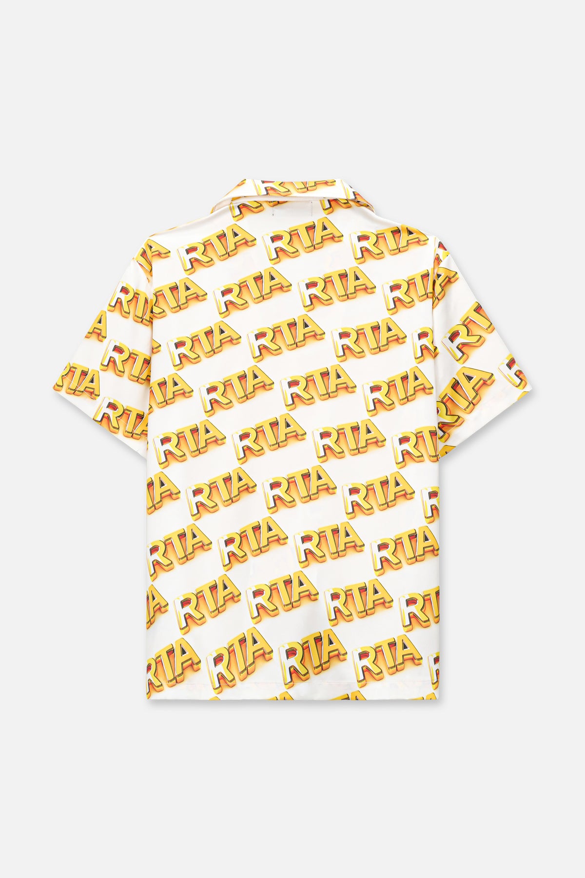 The Nathan Short Sleeve Shirt in White RTA Bullion is a lightweight, silky shirt designed with a turn down collar and button up closure and features an all over RTA logo in a metallic gold gradient and a 3D effect, designed to resemble the look of gold bars.